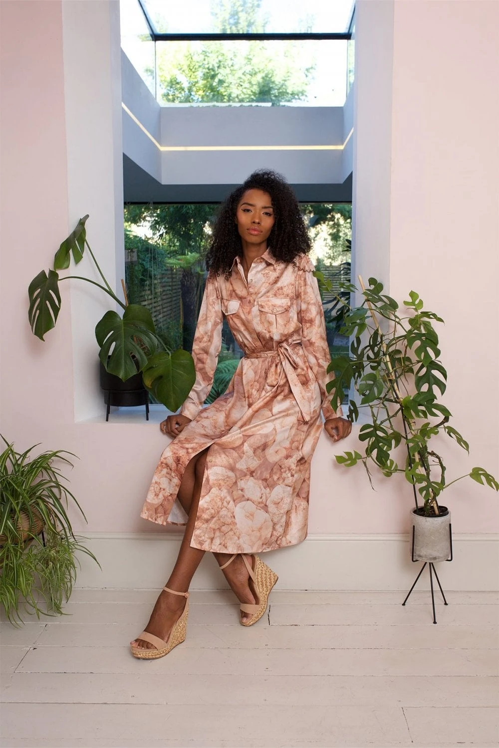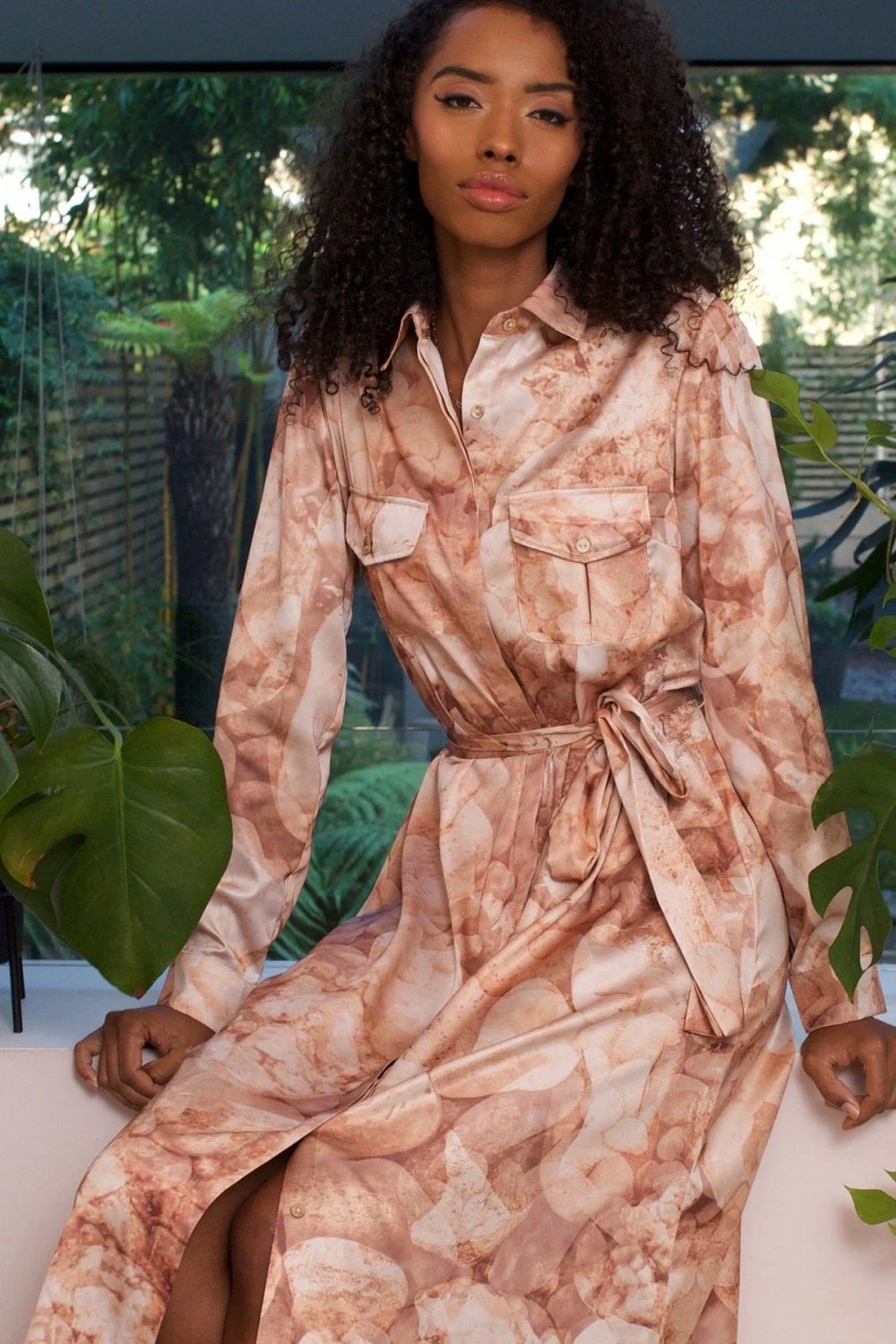 A nude utility dress with plackets on the shoulders, pockets on the bust and a detachable belt which allows you to style this piece in multiple ways.
