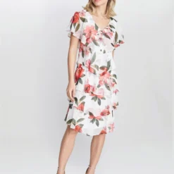 Feel wonderful in this floaty-tiered cape dress by Gina Bacconi. This dress takes a modern and flattering shape in layered floral print chiffon with diamante detailing at the neck. Perfect for an event, this piece offers both comfort and elegance.Â