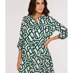 Make a style statement in this green geometric print shirt dress. Featuring a button-through front and 3/4 sleeves, this piece can be styled up with wedge heels and a clutch or pared back with canvas trainers and a tote bag.