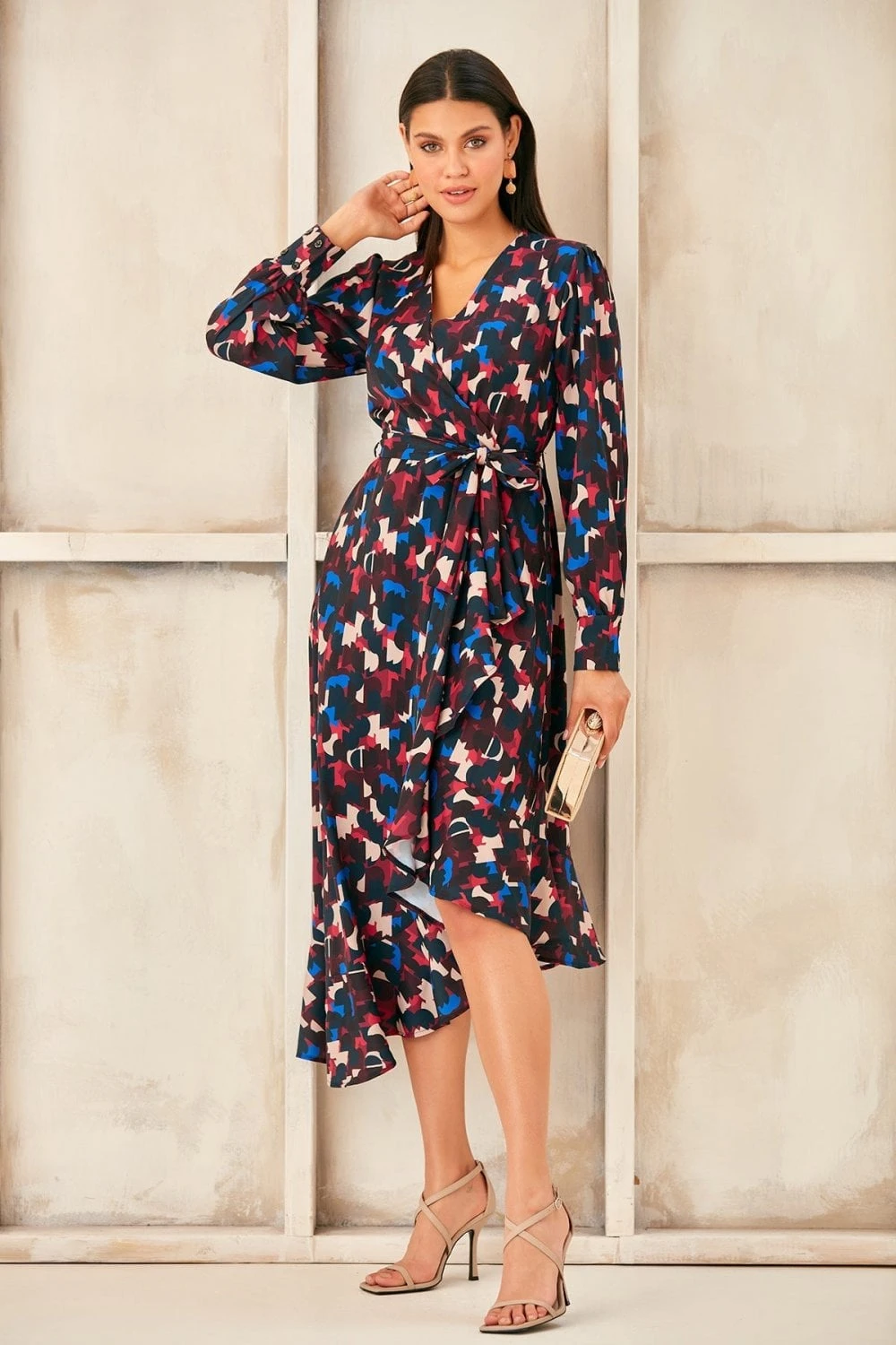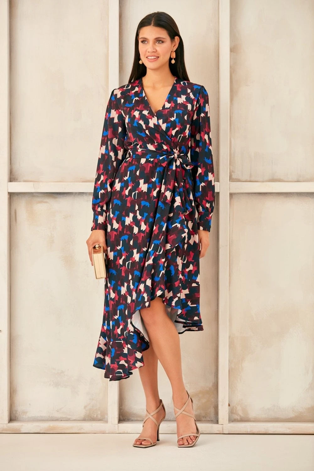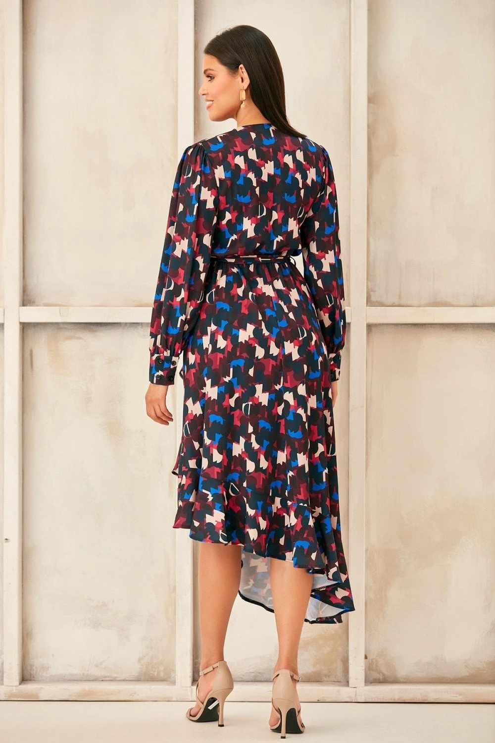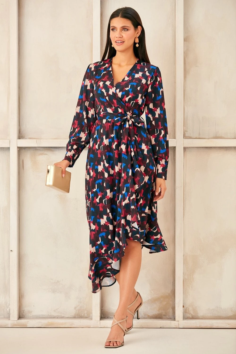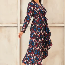 Long Sleeve Wrap Midi dress with Asymmetrical Ruffle hem. Available in 3 prints. Search: 59820 for other prints Wear as party dress, evening dress, occasion dress or cocktail dress and get all compliments to yourself. Style with high heels and accessories for chic look.