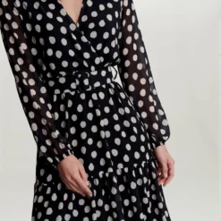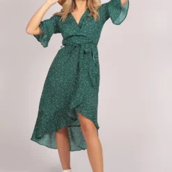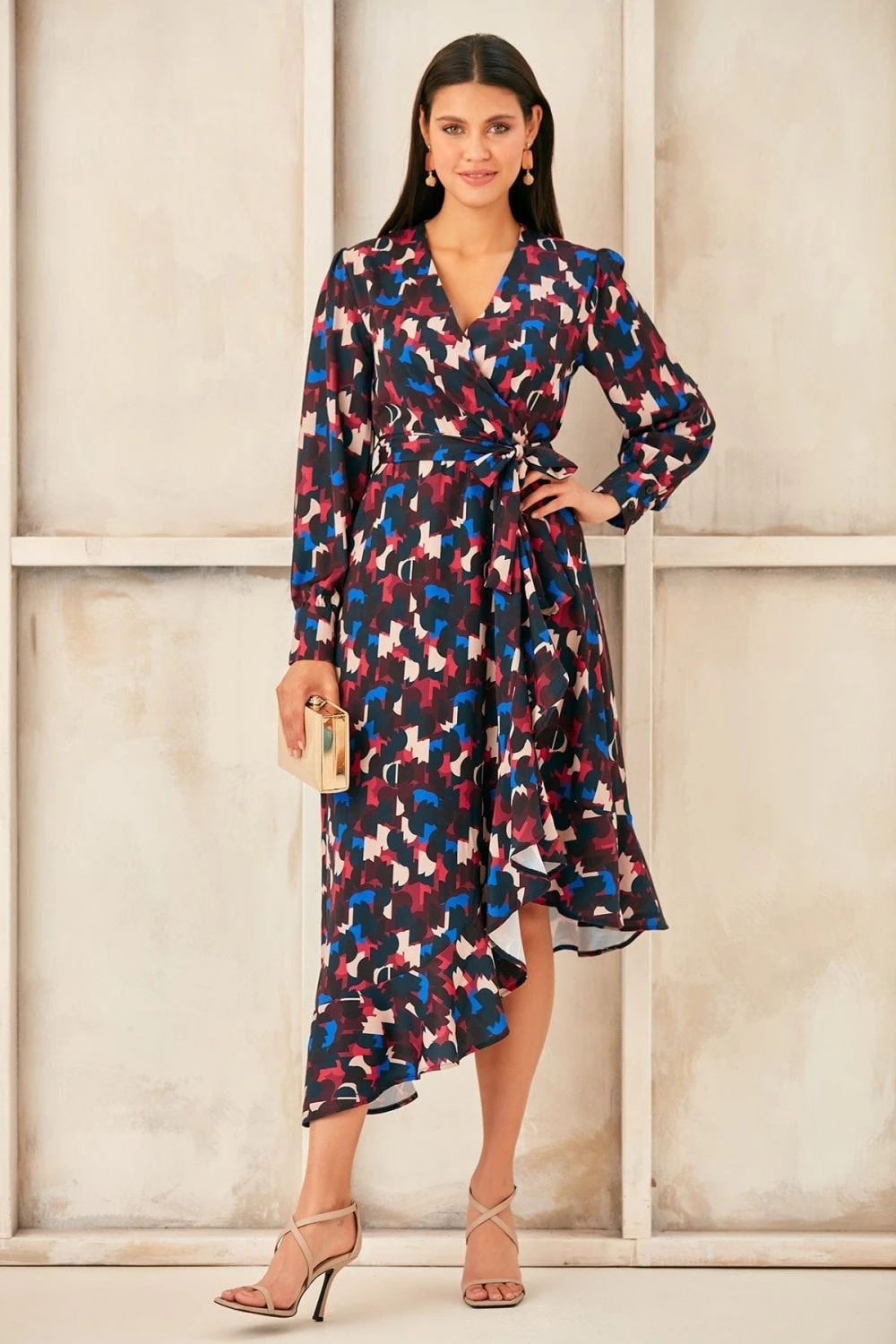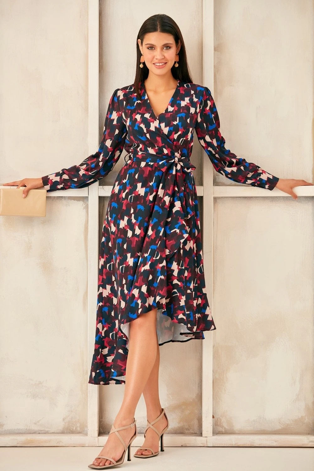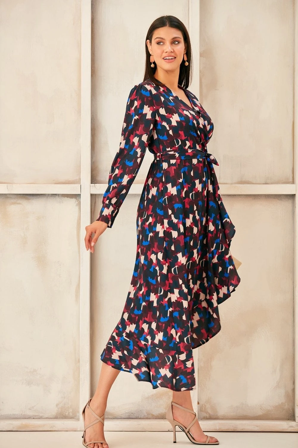 Long Sleeve Wrap Midi dress with Asymmetrical Ruffle hem. Available in 3 prints. Search: 59820 for other prints Wear as party dress, evening dress, occasion dress or cocktail dress and get all compliments to yourself. Style with high heels and accessories for chic look.