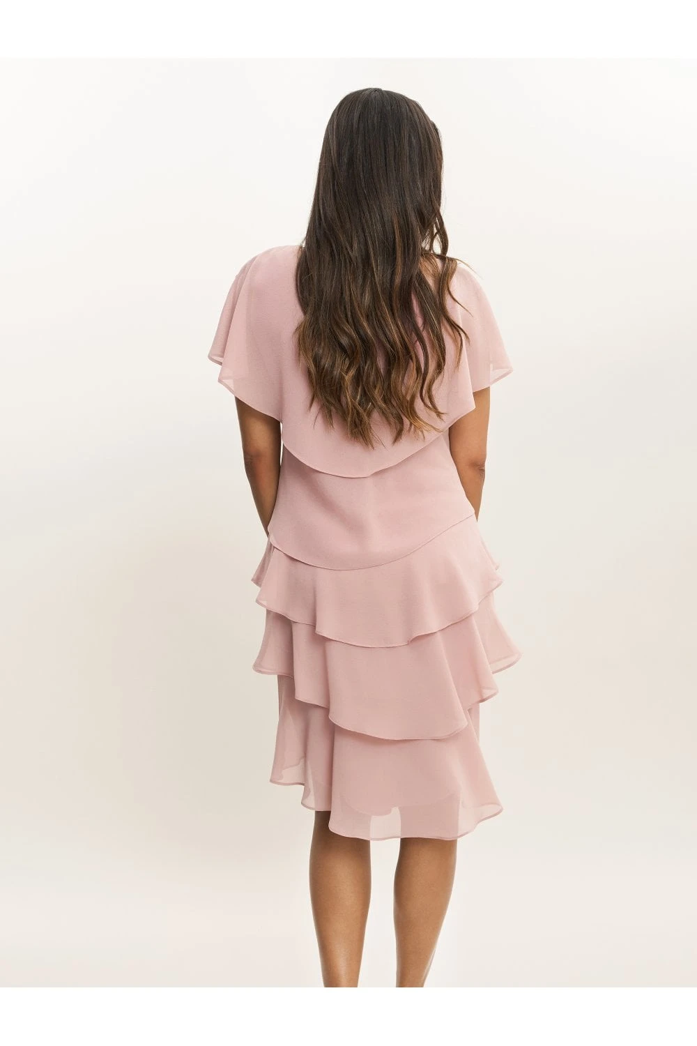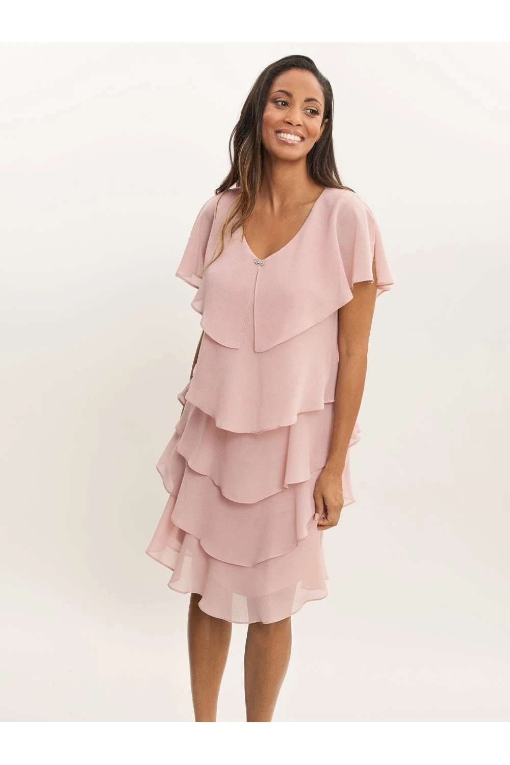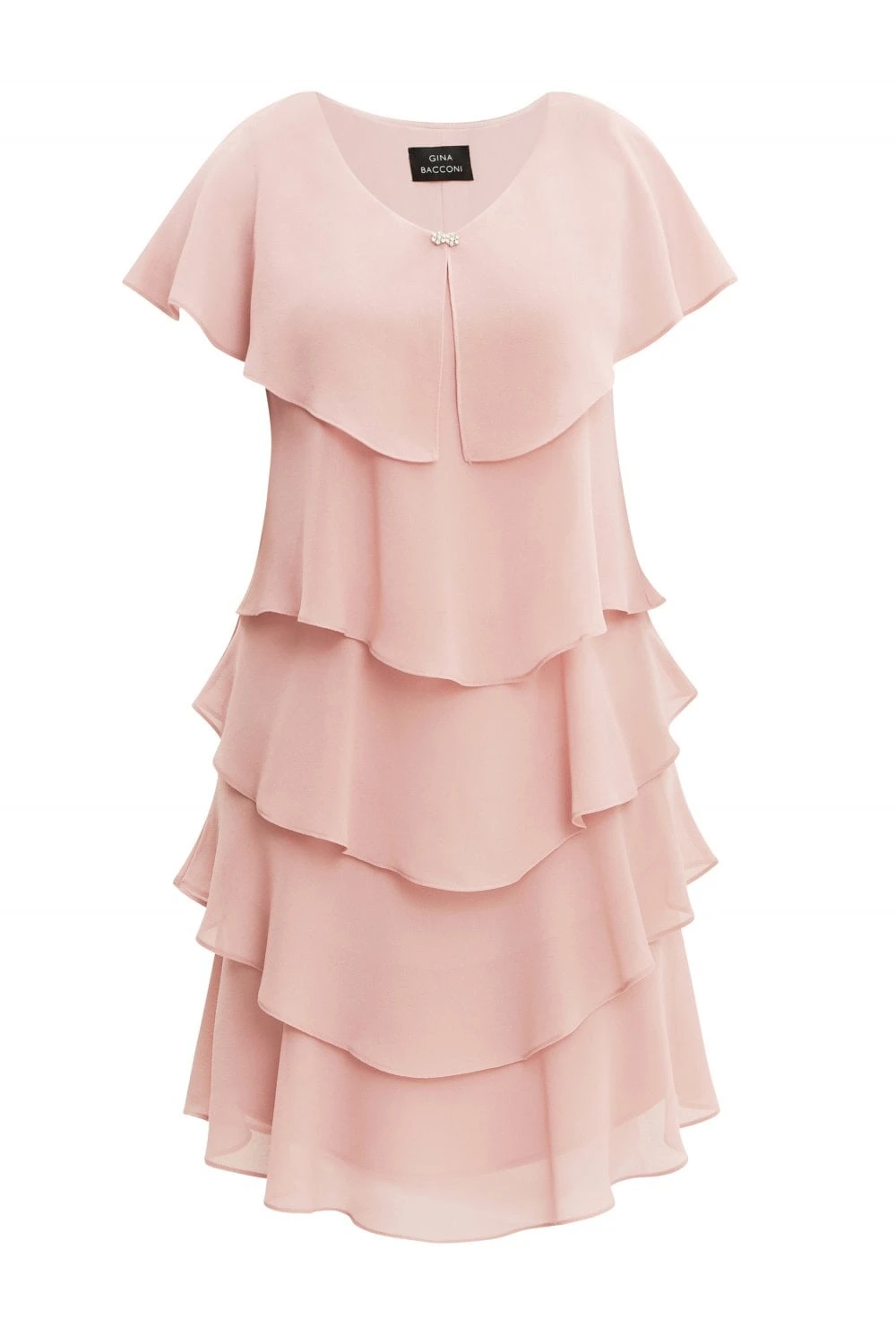 Feel wonderful in this floaty tiered cape dress by Gina Bacconi. This dress takes a modern and flattering shape in layered pebble georgette with diamante detailing at the neck. Perfect for an event, this piece offers both comfort and elegance.Â