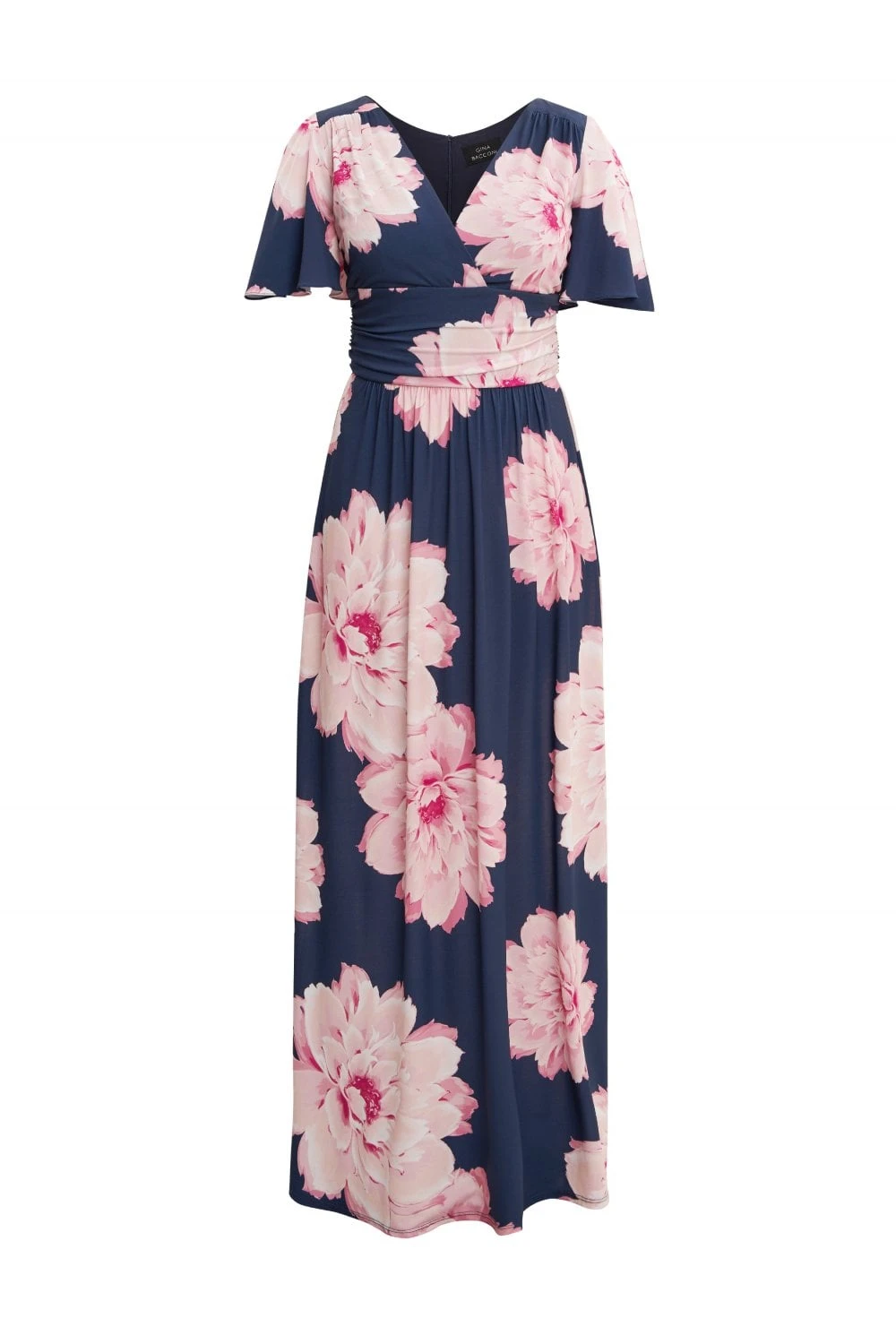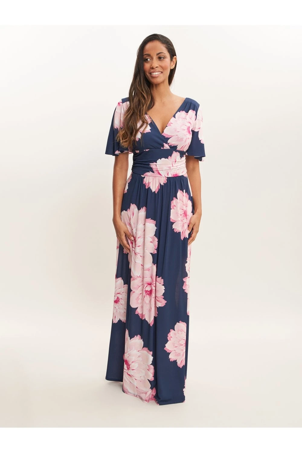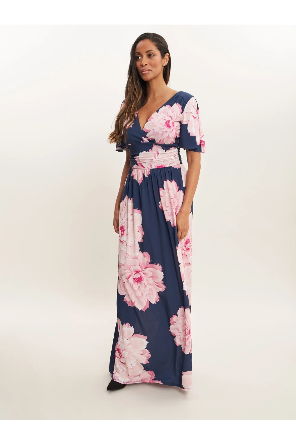 Bold florals create a fabulous look on this surplice top maxi dress from Gina Bacconi, finished with a flattering ruched waist and flutter sleeves.Â