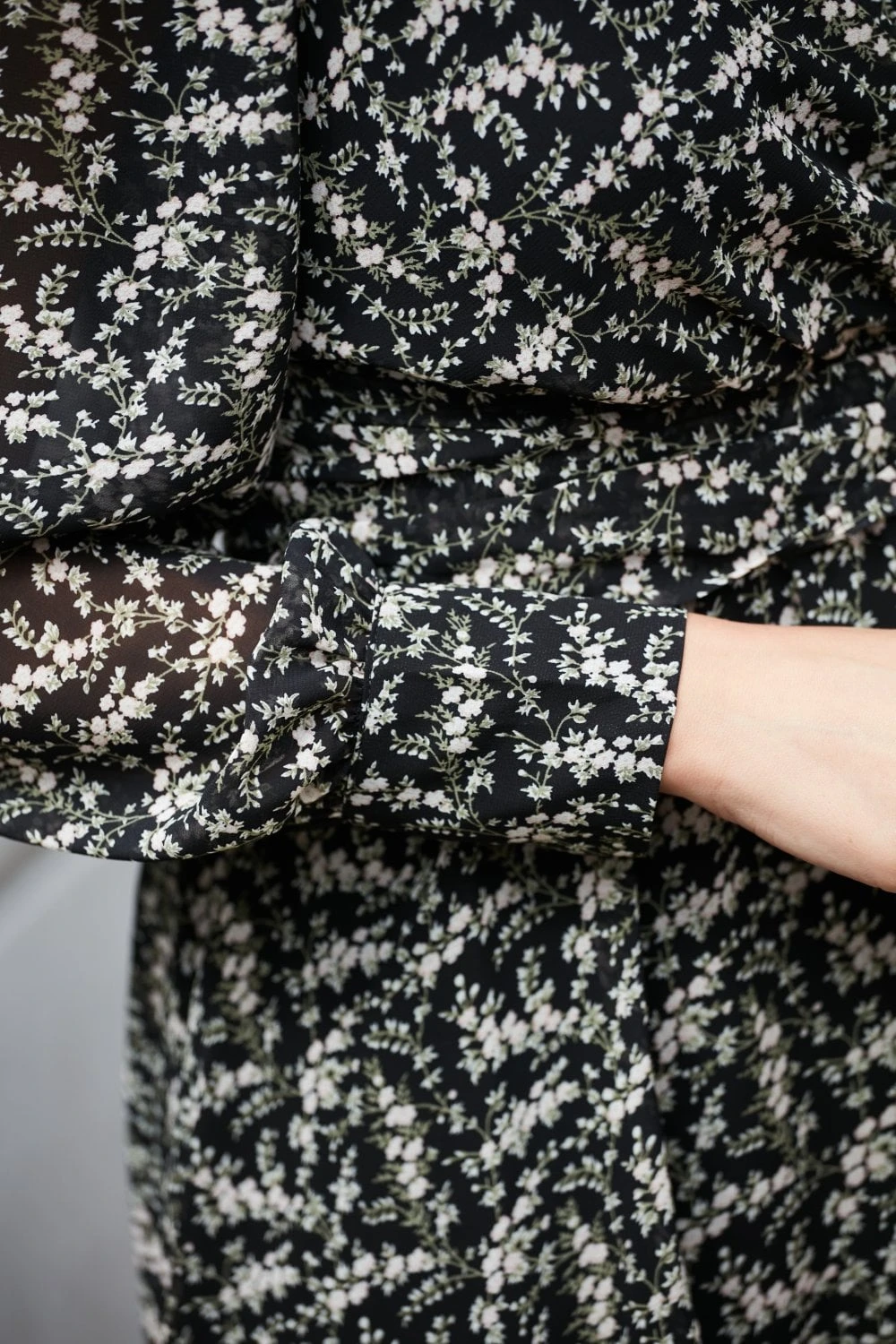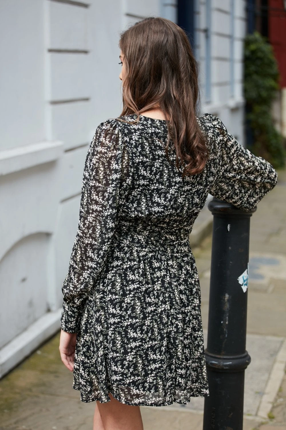 This floral print wrap front dress is suited for casual weekends, your work wardrobe or your next city break. It boasts a wrap front bust design with long balloon sleeves and a ruched detail at the waist. It is made in chiffon fabric, has a removable tie belt and an invisible zip fastening at the centre back
