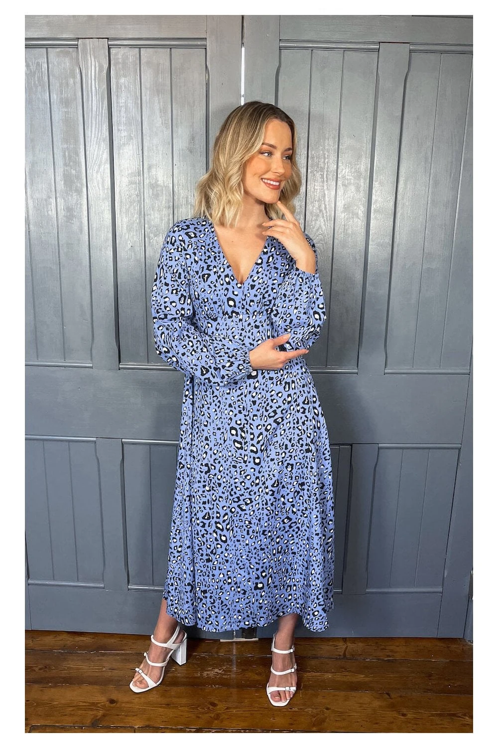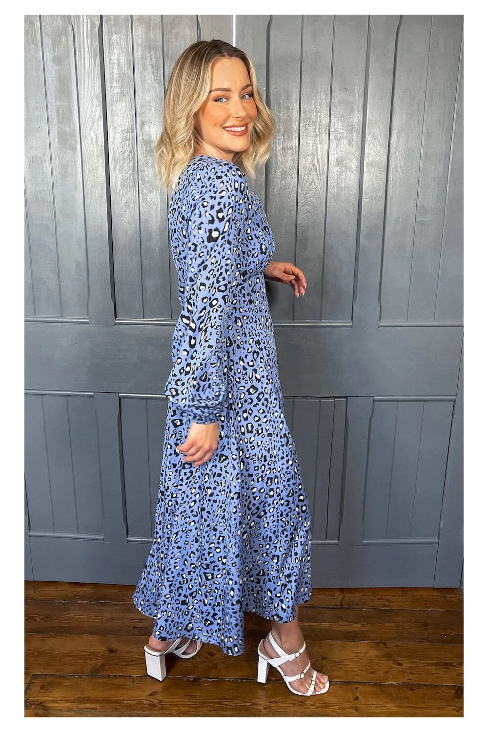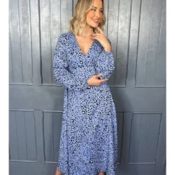 BLUE ANIMAL PRINTED LONG SLEEVE MIDI DRESS