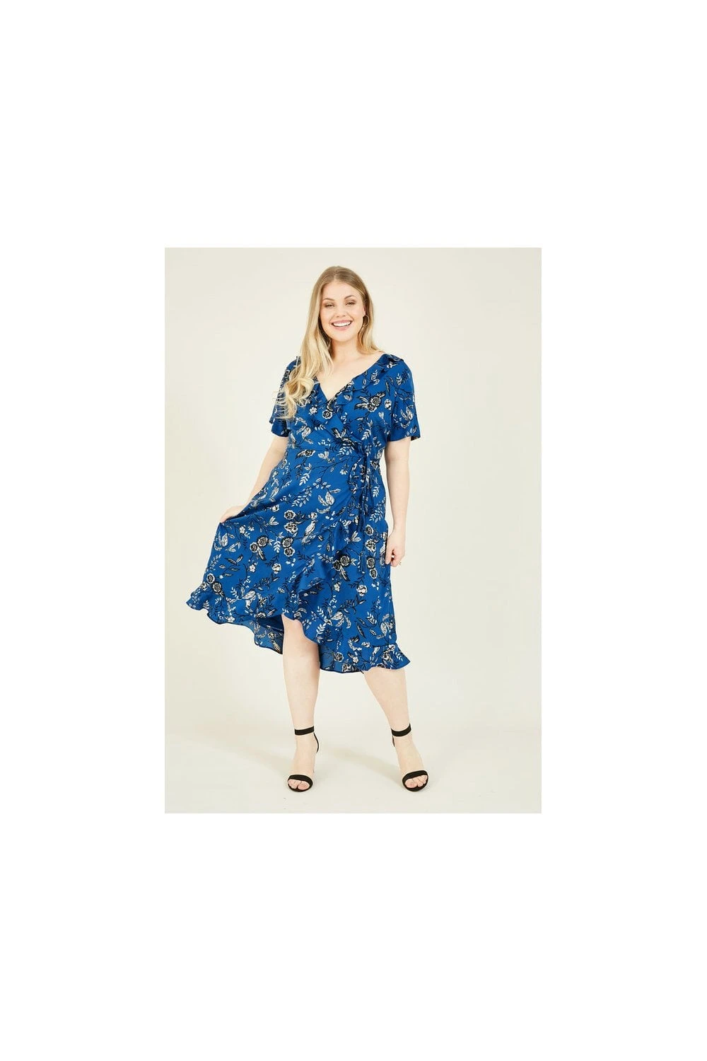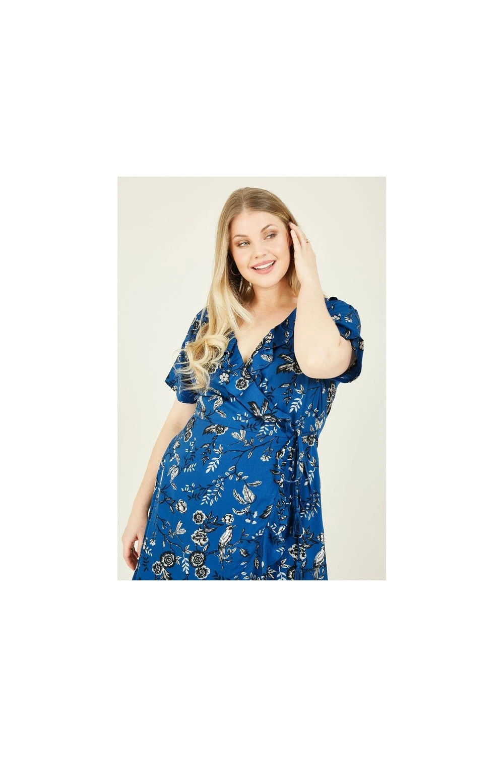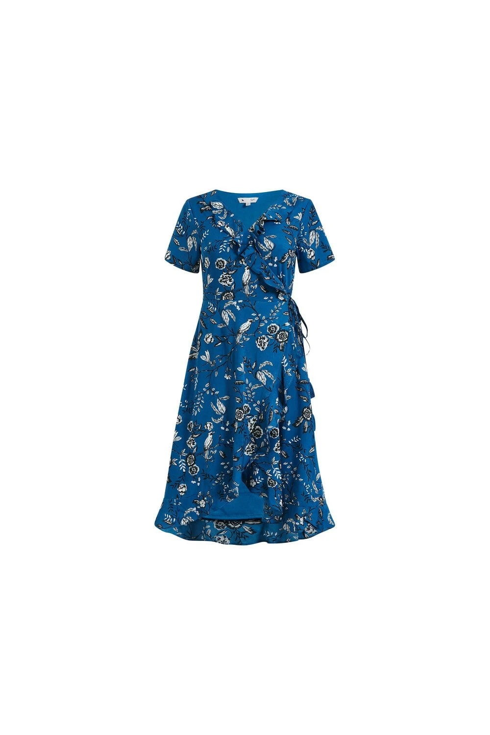 Make a sweet statement in this Yumi Plus Size Bird Print Frill Wrap Dress. Styled in a classic shape with a tie around the waist, it features ruffles running from the neck to hemline for a feminine touch. Florals all over provide the elegant details you love, whilst the brilliant blue tones make it season-appropriate all year round. Accessorize with anything from trainers to heels, depending on the occasion.