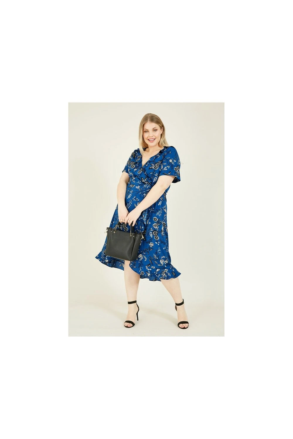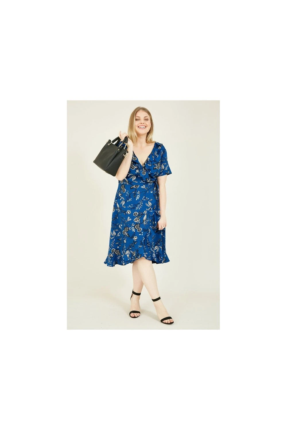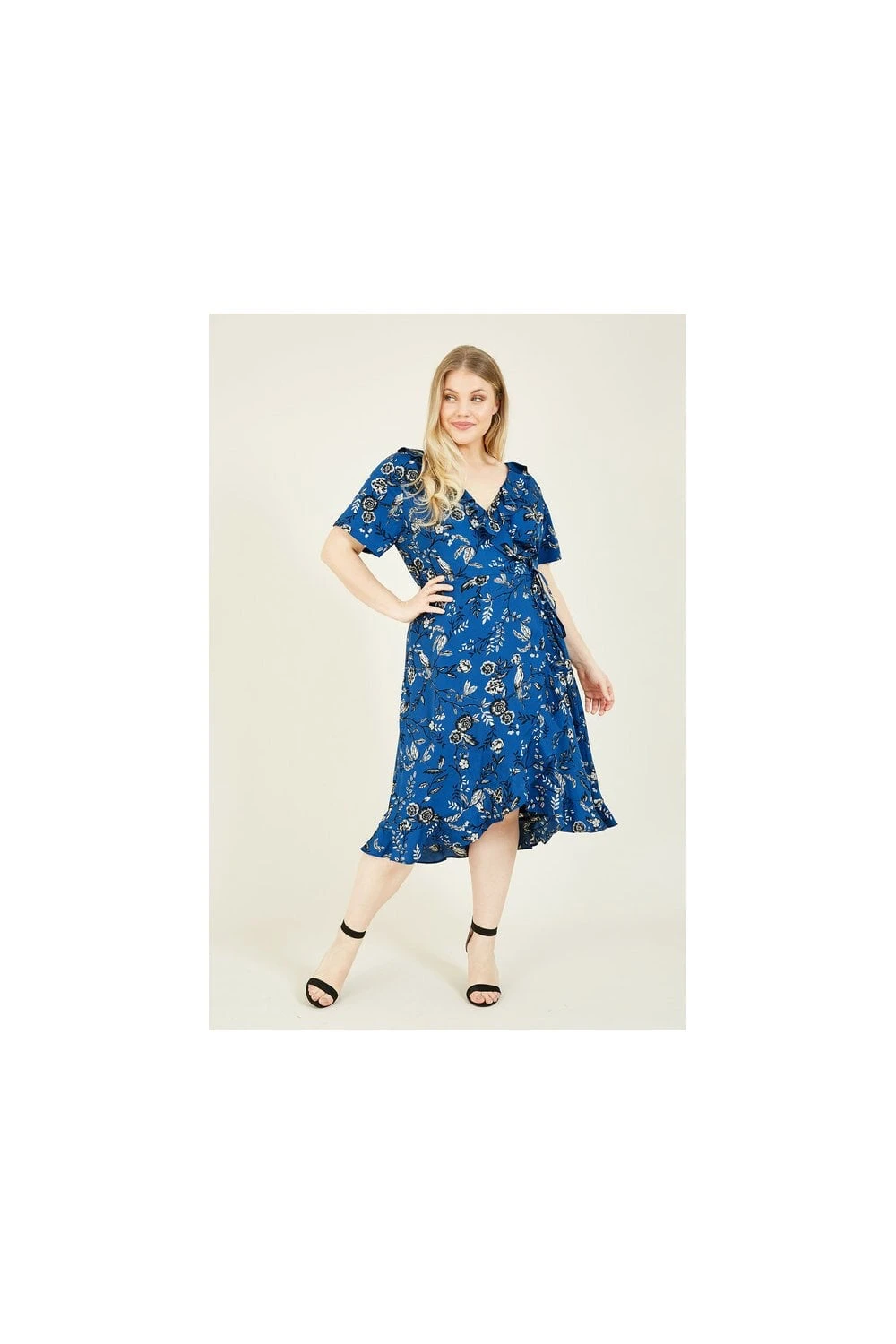 Make a sweet statement in this Yumi Plus Size Bird Print Frill Wrap Dress. Styled in a classic shape with a tie around the waist, it features ruffles running from the neck to hemline for a feminine touch. Florals all over provide the elegant details you love, whilst the brilliant blue tones make it season-appropriate all year round. Accessorize with anything from trainers to heels, depending on the occasion.