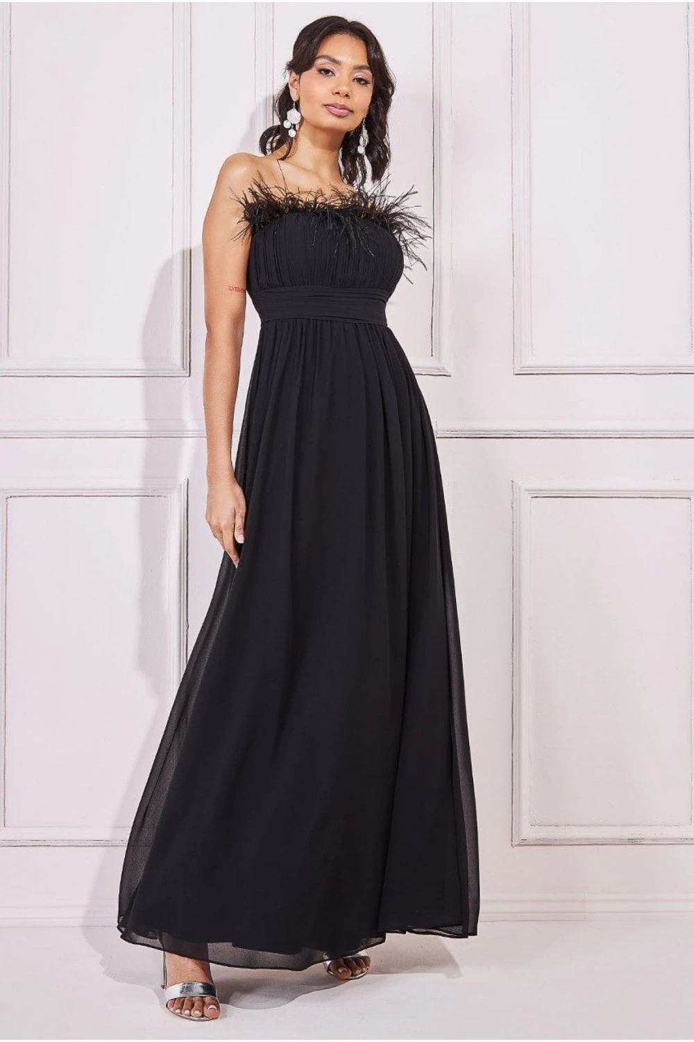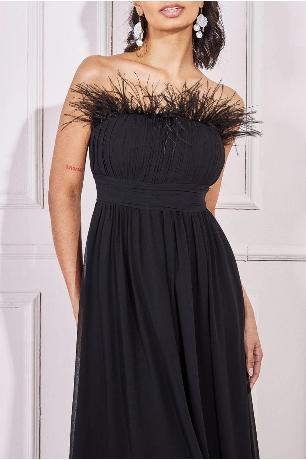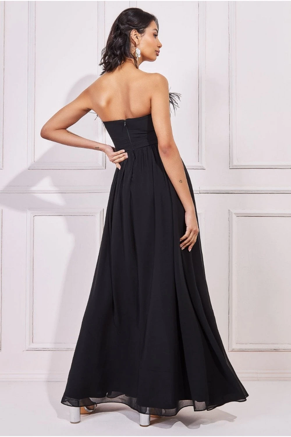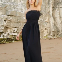 The Chiffon bandeau maxi dress with a feather detail can be a great choice for bridesmaids and prom. The delicate chiffon fabric gives the dress a luxurious and elegant look, while the bandeau style adds a modern touch to this ravishing black. The feather detail can also add a touch of glamour and give you more of a statement piece to wear, allowing for spotlight moments. Whether for bridesmaids or prom, this type of dress can make a statement and help you stand out from the crowd. This black chiffon occasion dress can be a versatile and elegant choice for any season. Make sure to pair it with the right accessories, such as high heels and statement jewellery, to complete the look.