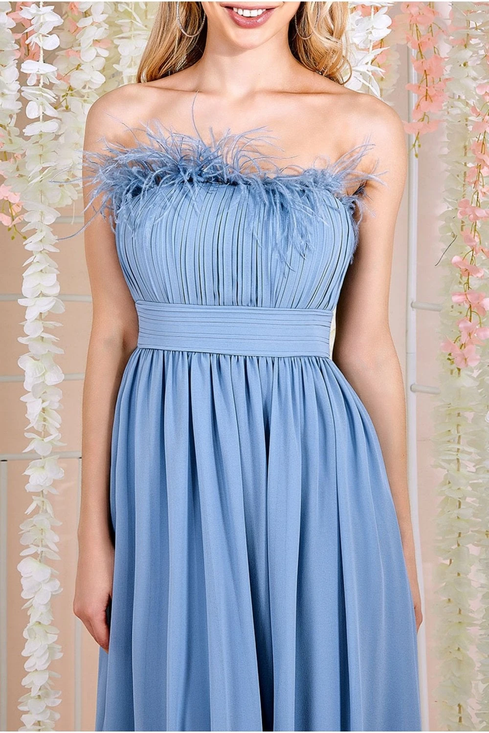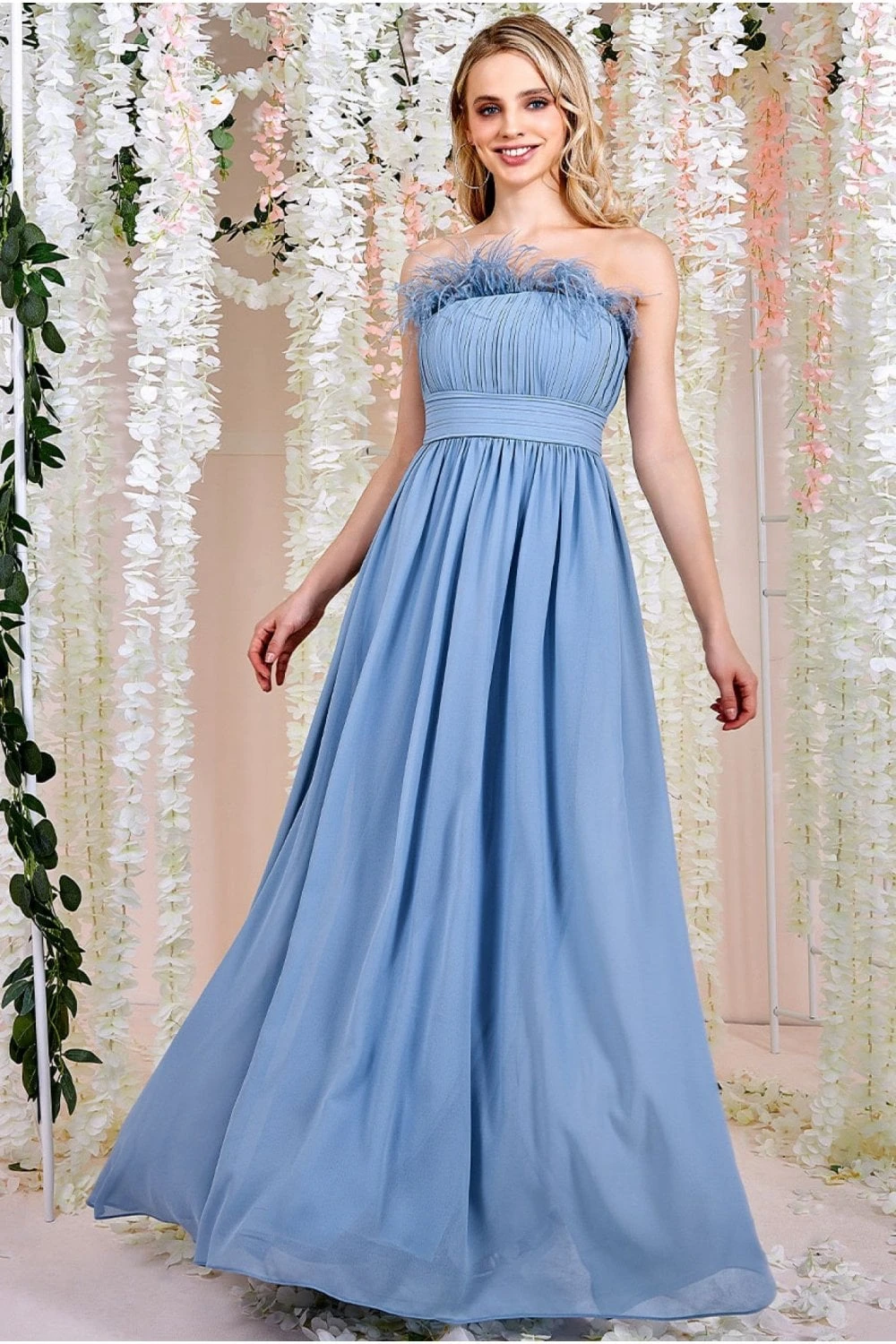 The Chiffon bandeau maxi dress with a feather detail can be a great choice for bridesmaids and prom. The delicate chiffon fabric gives the dress a luxurious and elegant look, while the bandeau style adds a modern touch to this ravishing blue. The feather detail can also add a touch of glamour and give you more of a statement piece to wear, allowing for spotlight moments. Whether for bridesmaids or prom, this type of dress can make a statement and help you stand out from the crowd. This blue chiffon occasion dress can be a versatile and elegant choice for any season. Make sure to pair it with the right accessories, such as high heels and statement jewellery, to complete the look.