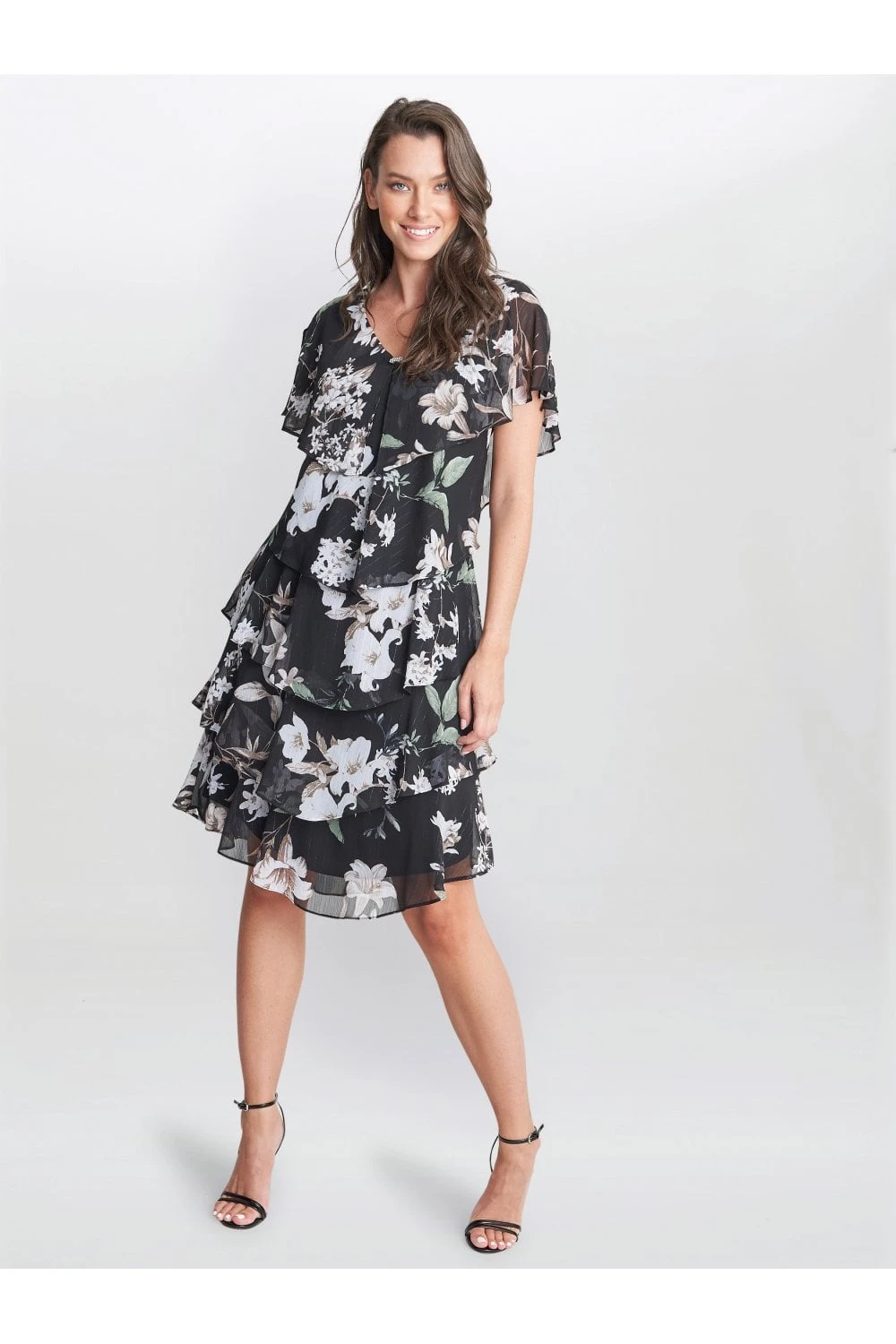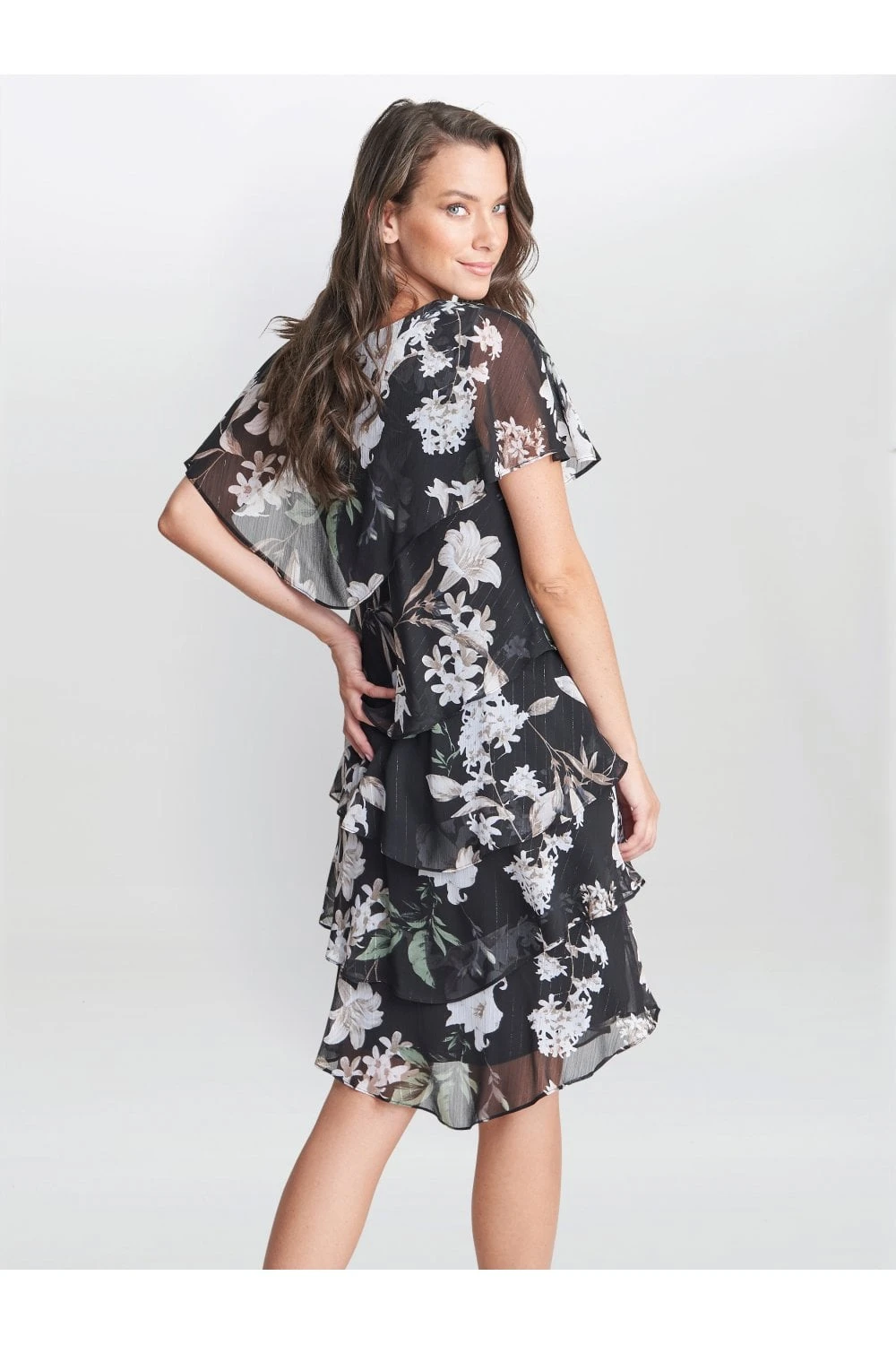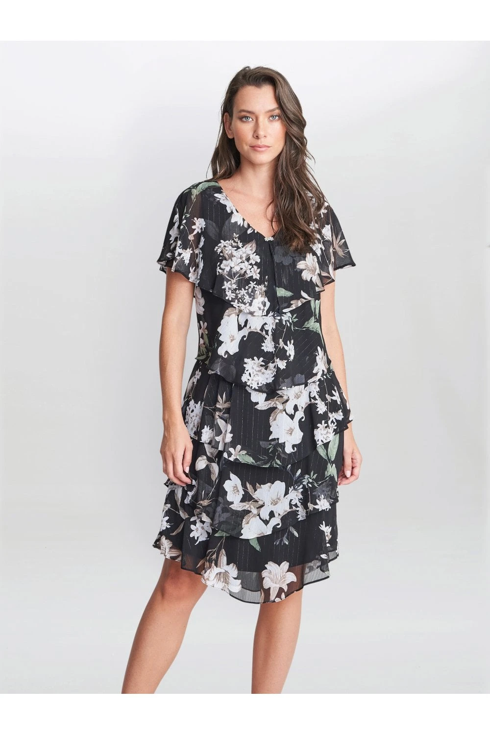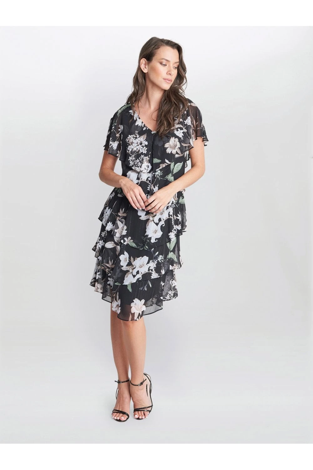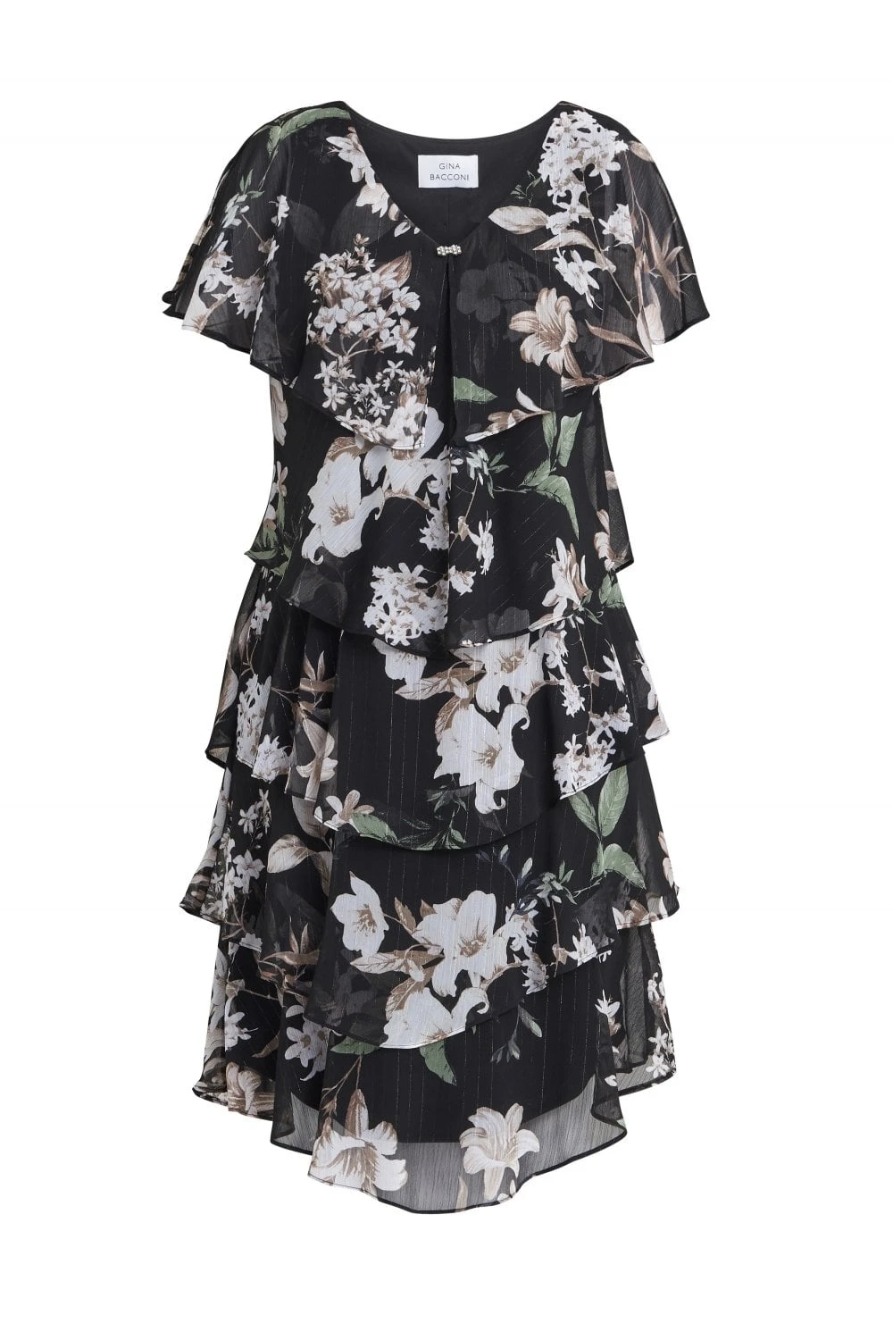 Feel wonderful in this floaty-tiered cape dress by Gina Bacconi. This dress takes a modern and flattering shape in layered floral print chiffon with diamante detailing at the neck. Perfect for an event, this piece offers both comfort and elegance.Â