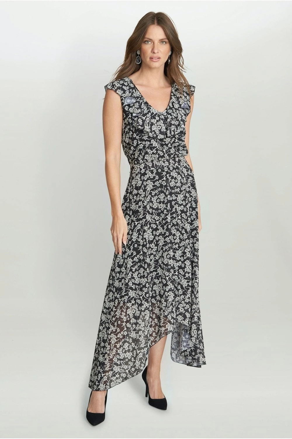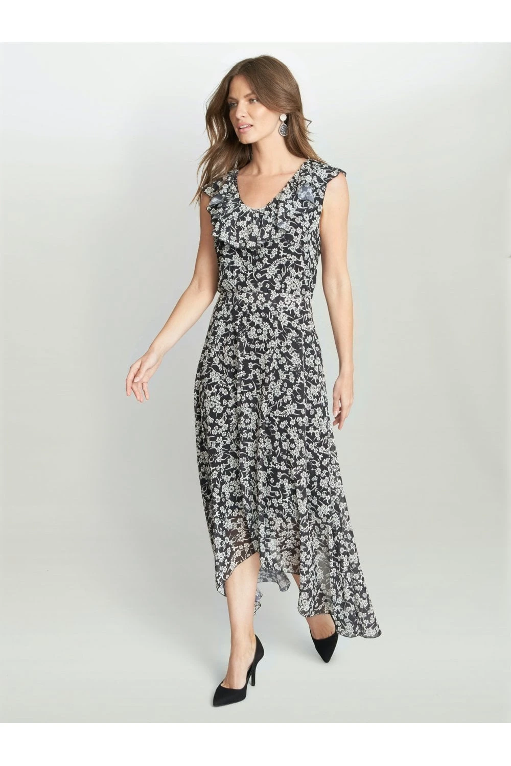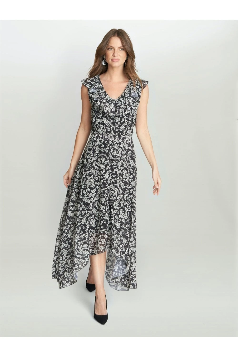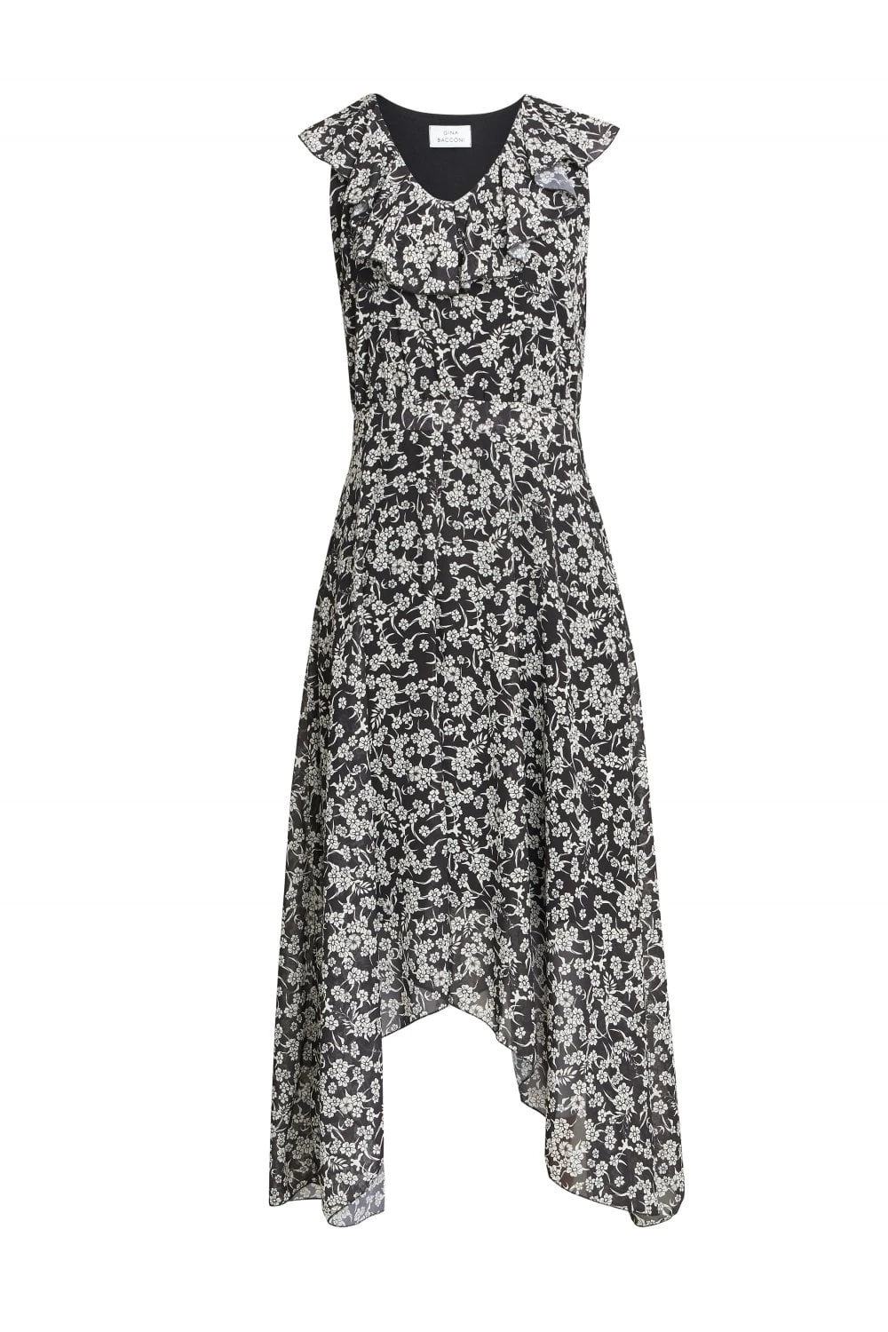 Stand out on your next occasion with this floral dress by Gina Bacconi. A fully lined gorgeous floral chiffon dress with a handkerchief hem finishing at the skirt. With a frill at the v shaped neckline. With a concealed side zip.