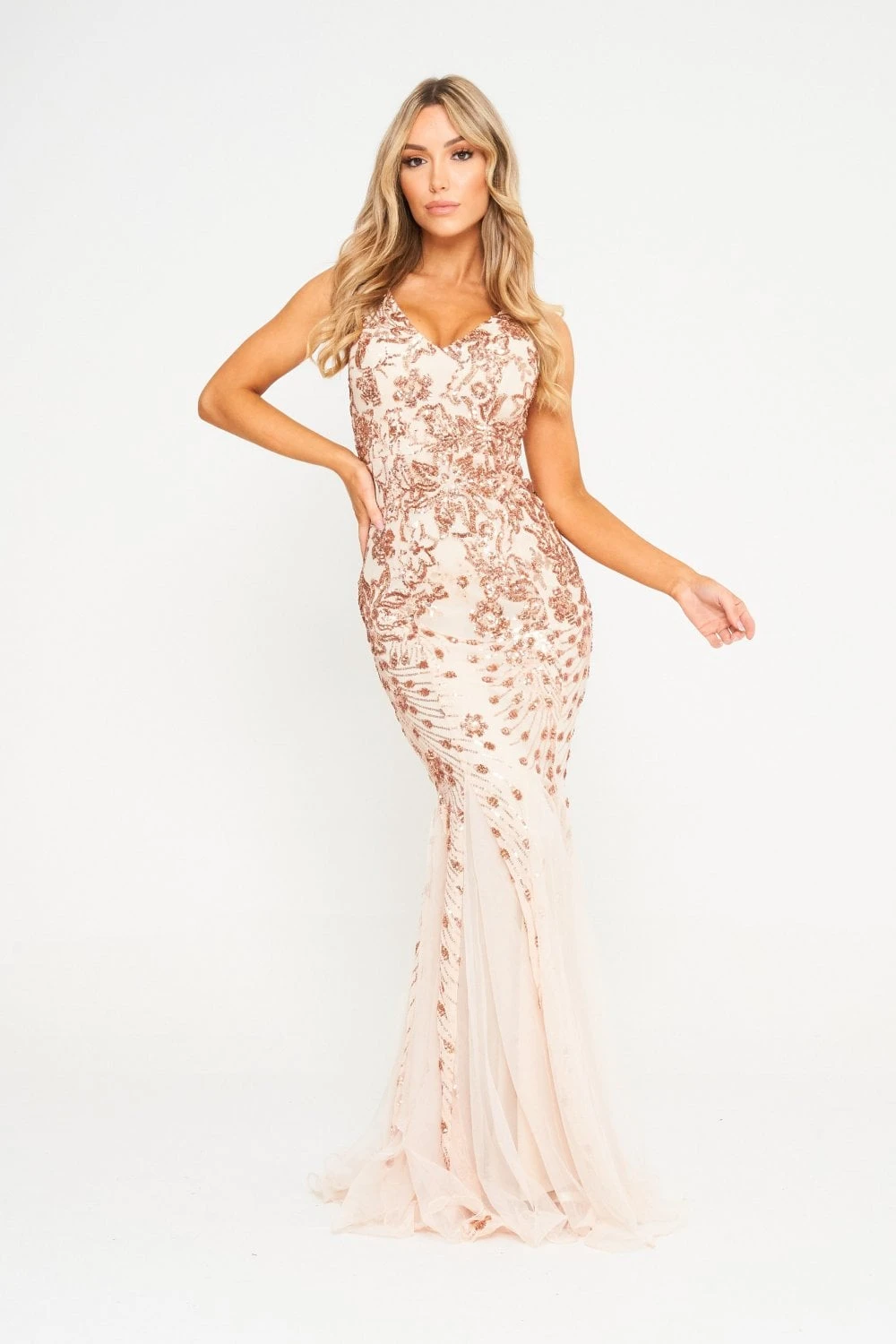 The sparkling sequins are arranged in a beautiful floral pattern – it’s a fascinating combination of traditional spring elements and fiery, radiant sequins and the dominating maxi length. The subtle mesh inserts add shape and structure – contributing to the different dynamics expressed by the two colours.