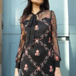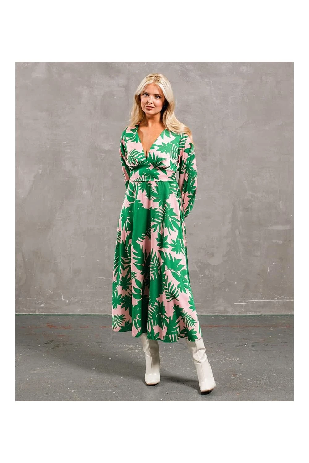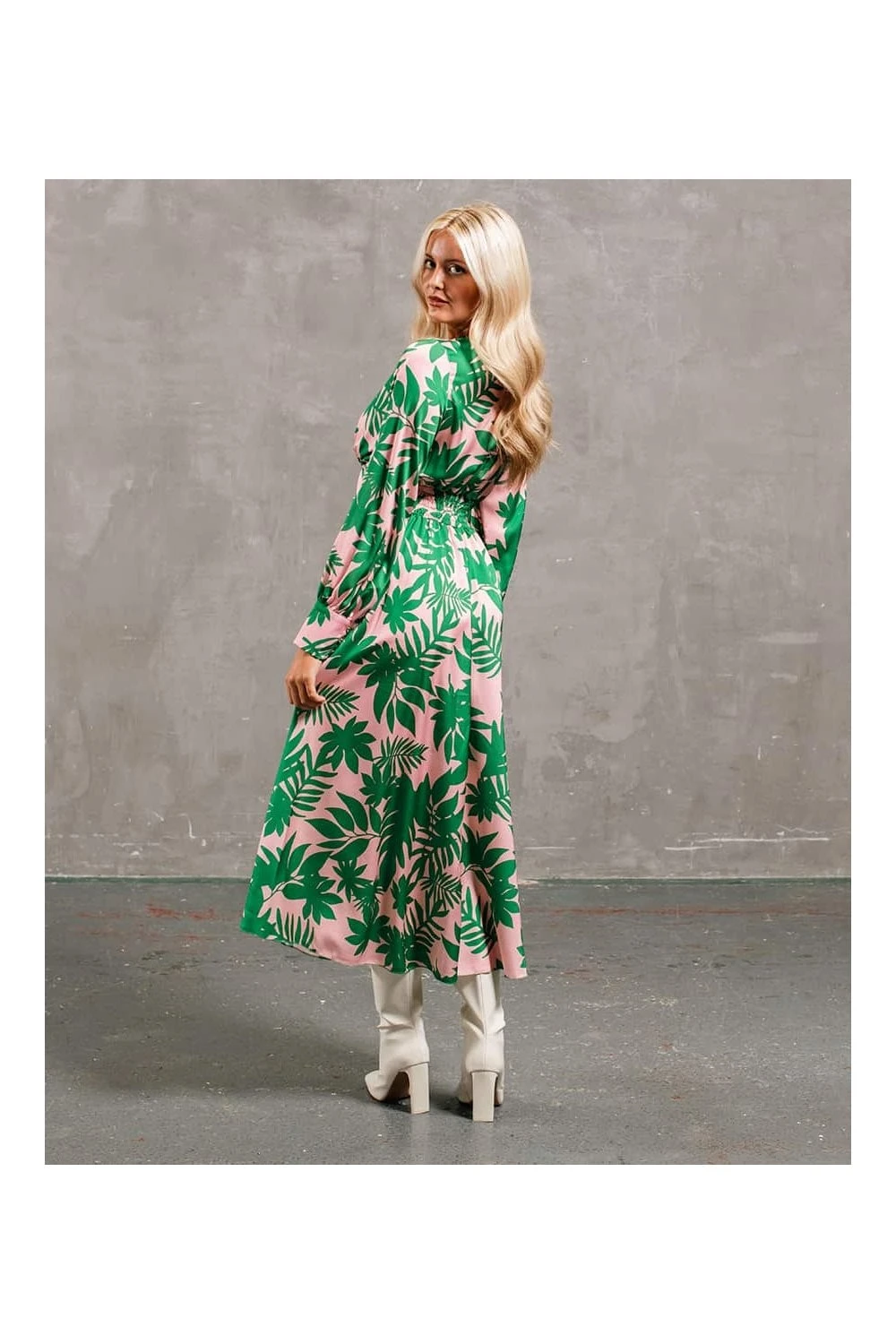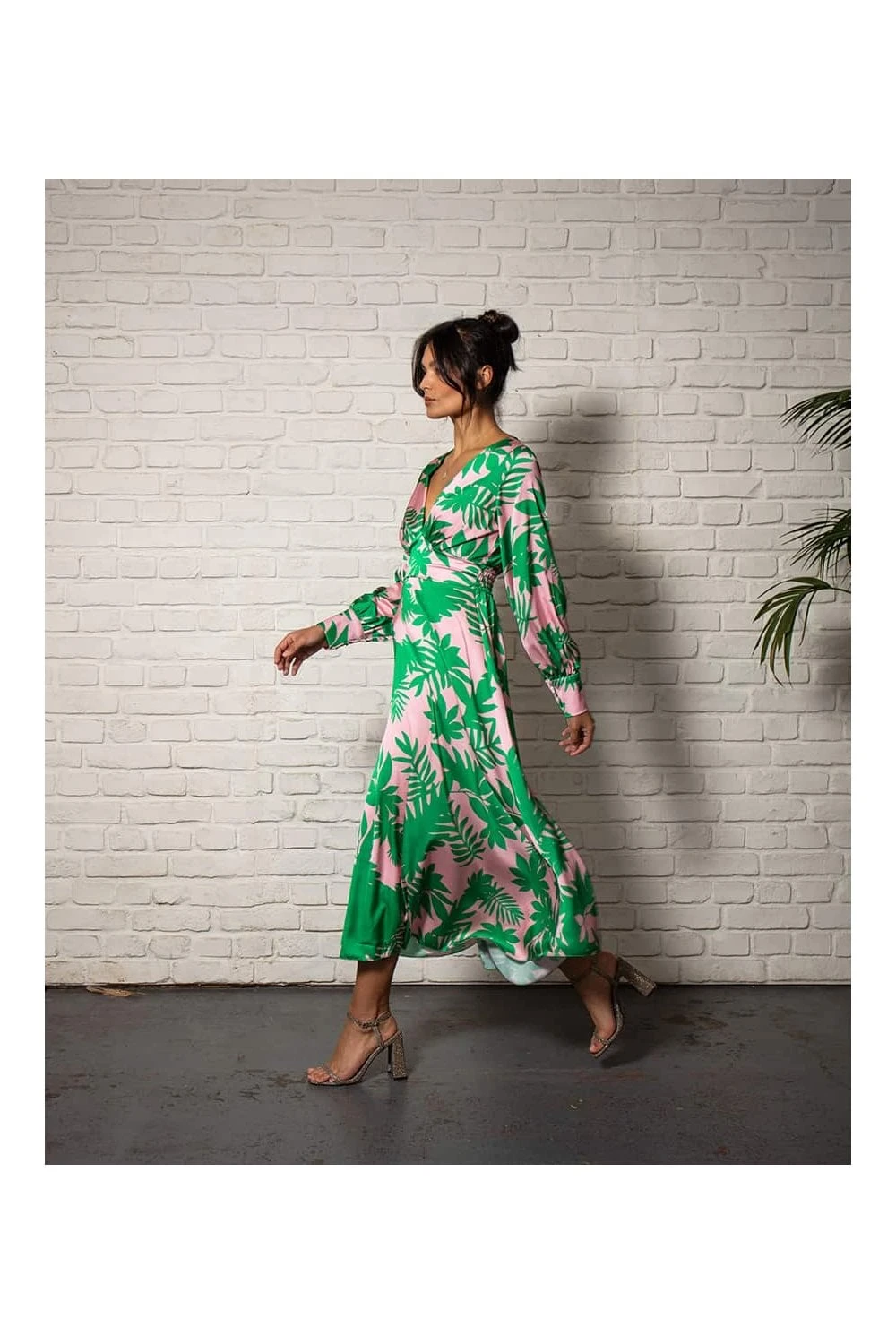 Striking pink and green floral print maxi dress in a medium weight satin fabric V-neckline with panelled empire waist seam detail Blouson sleeves with cuff and buttonÂ