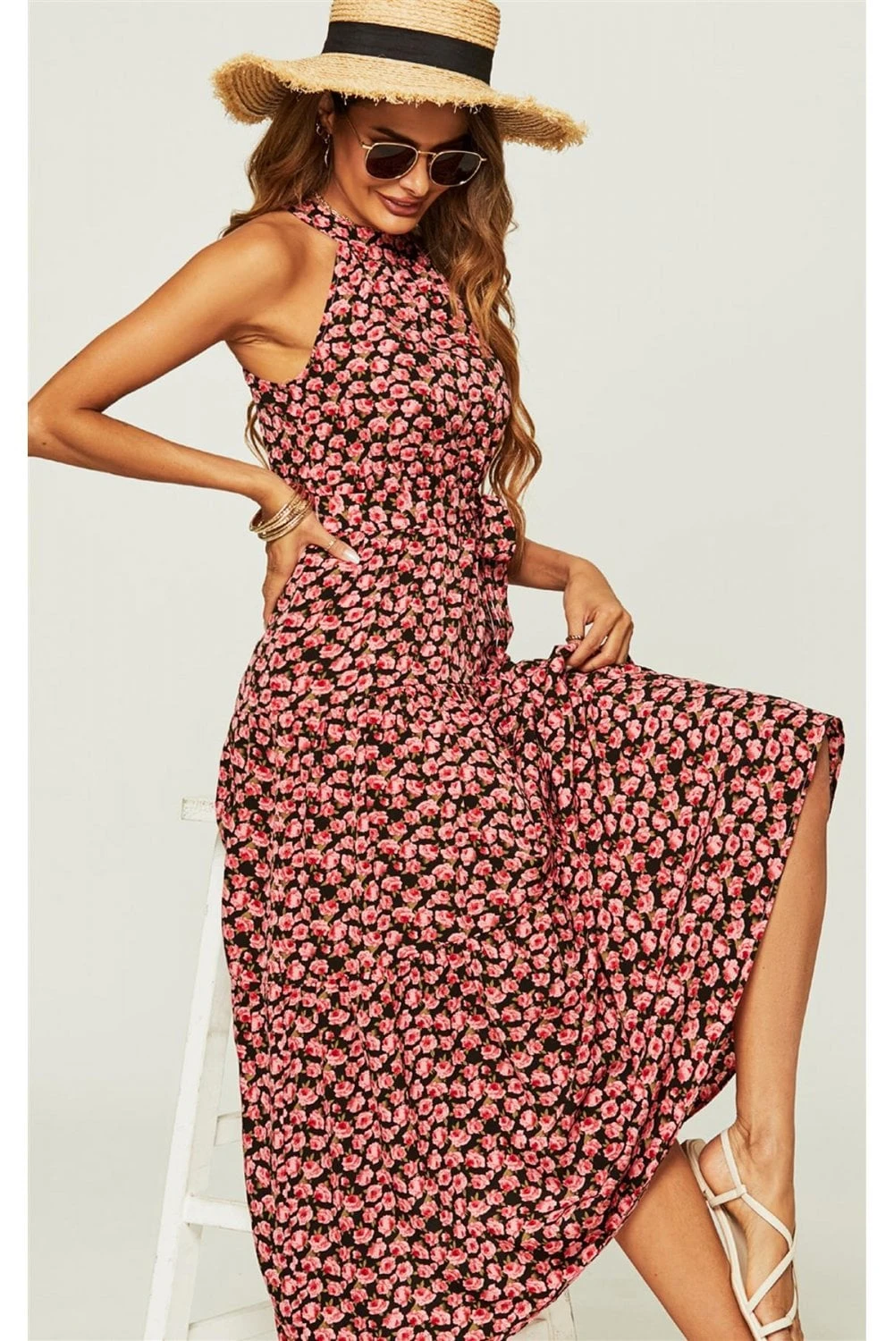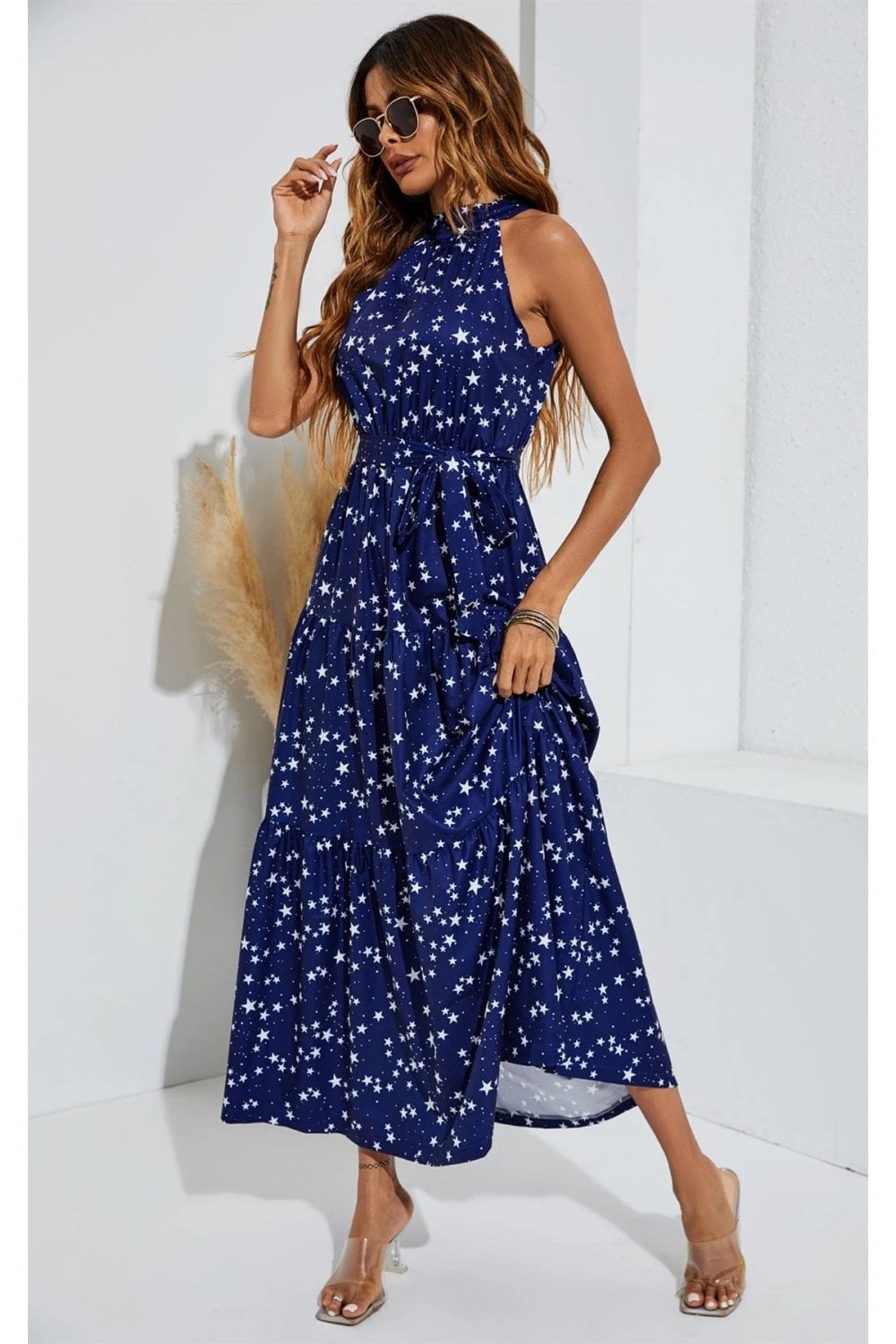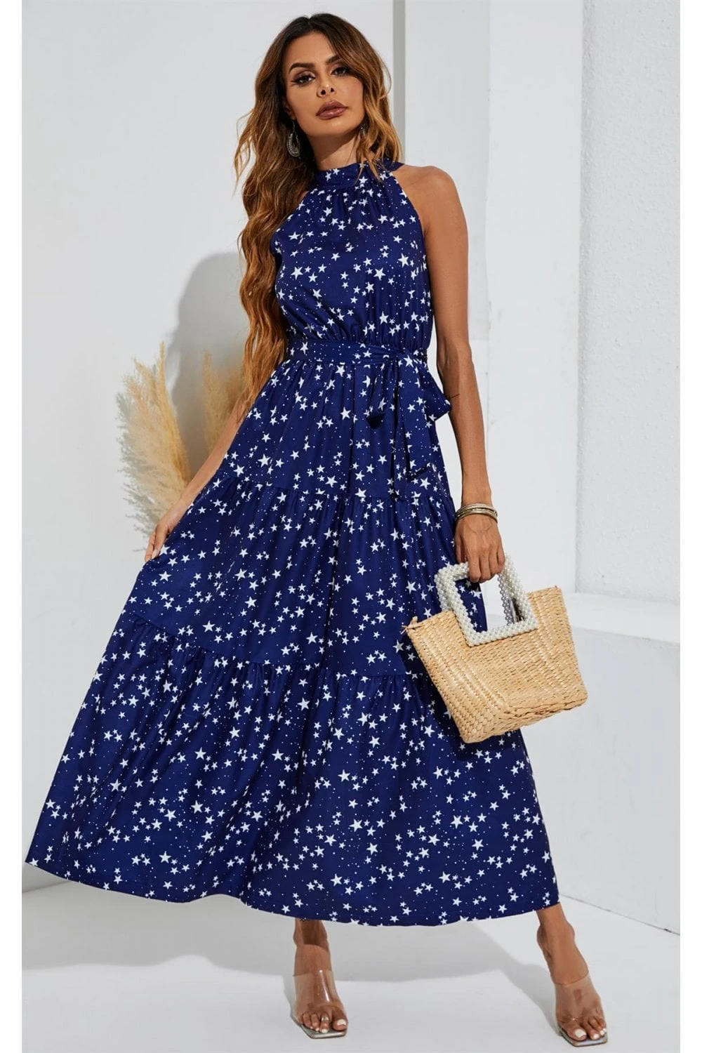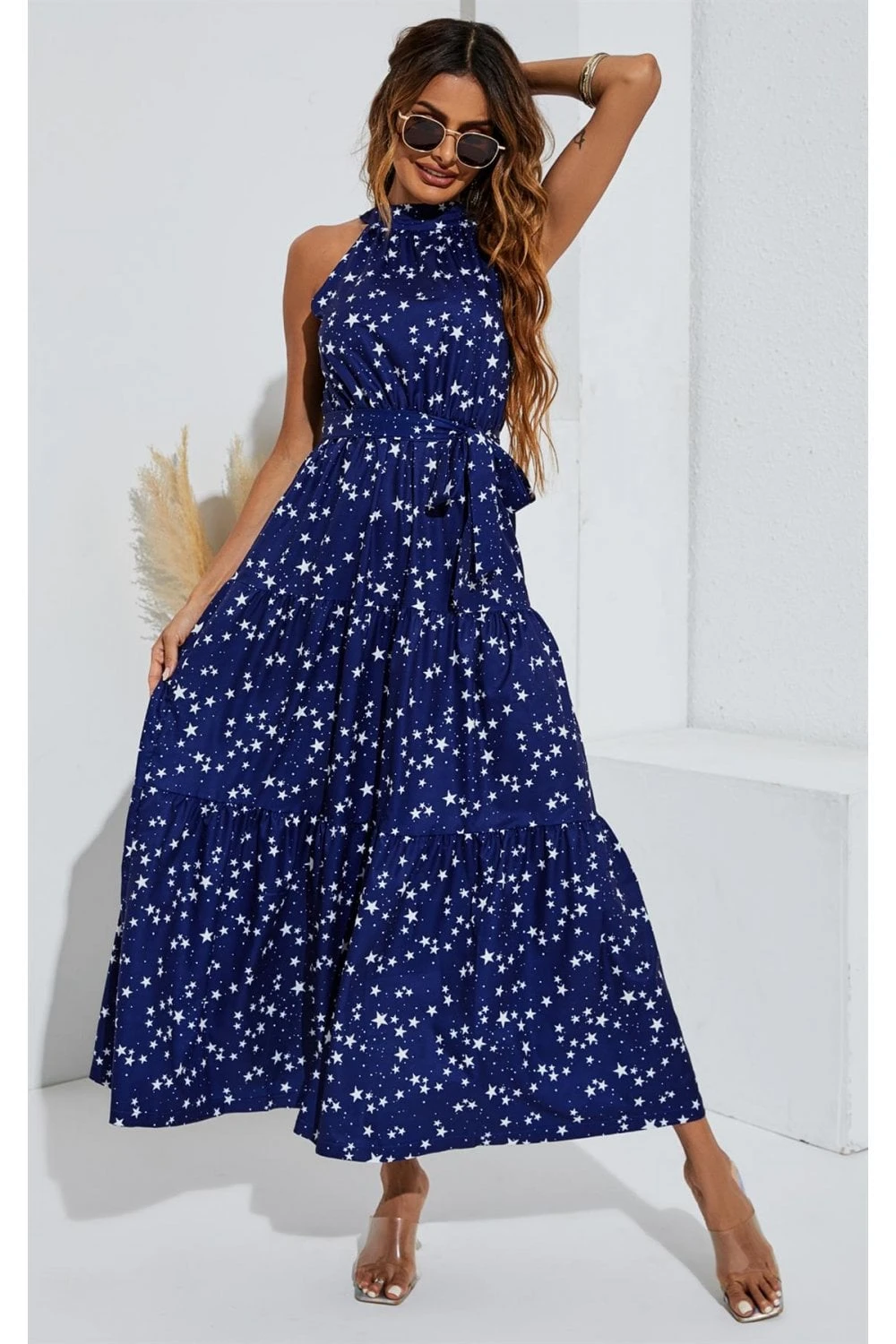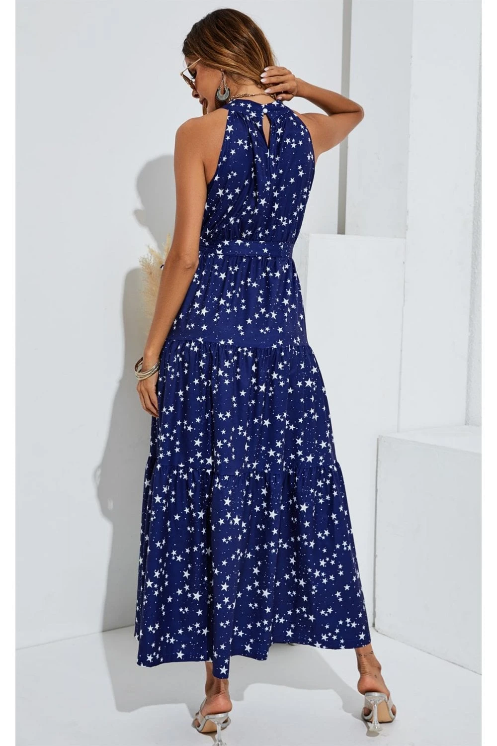 Night Sky Halter Neck Maxi Layer Dress In Navy & White Little Star
