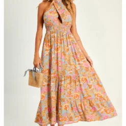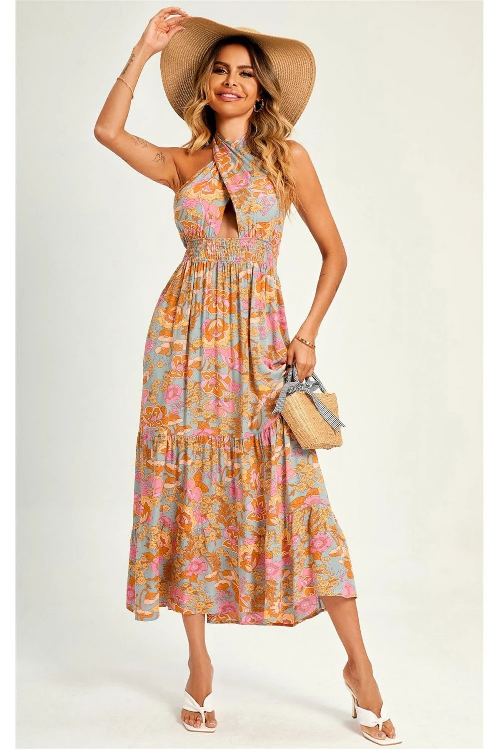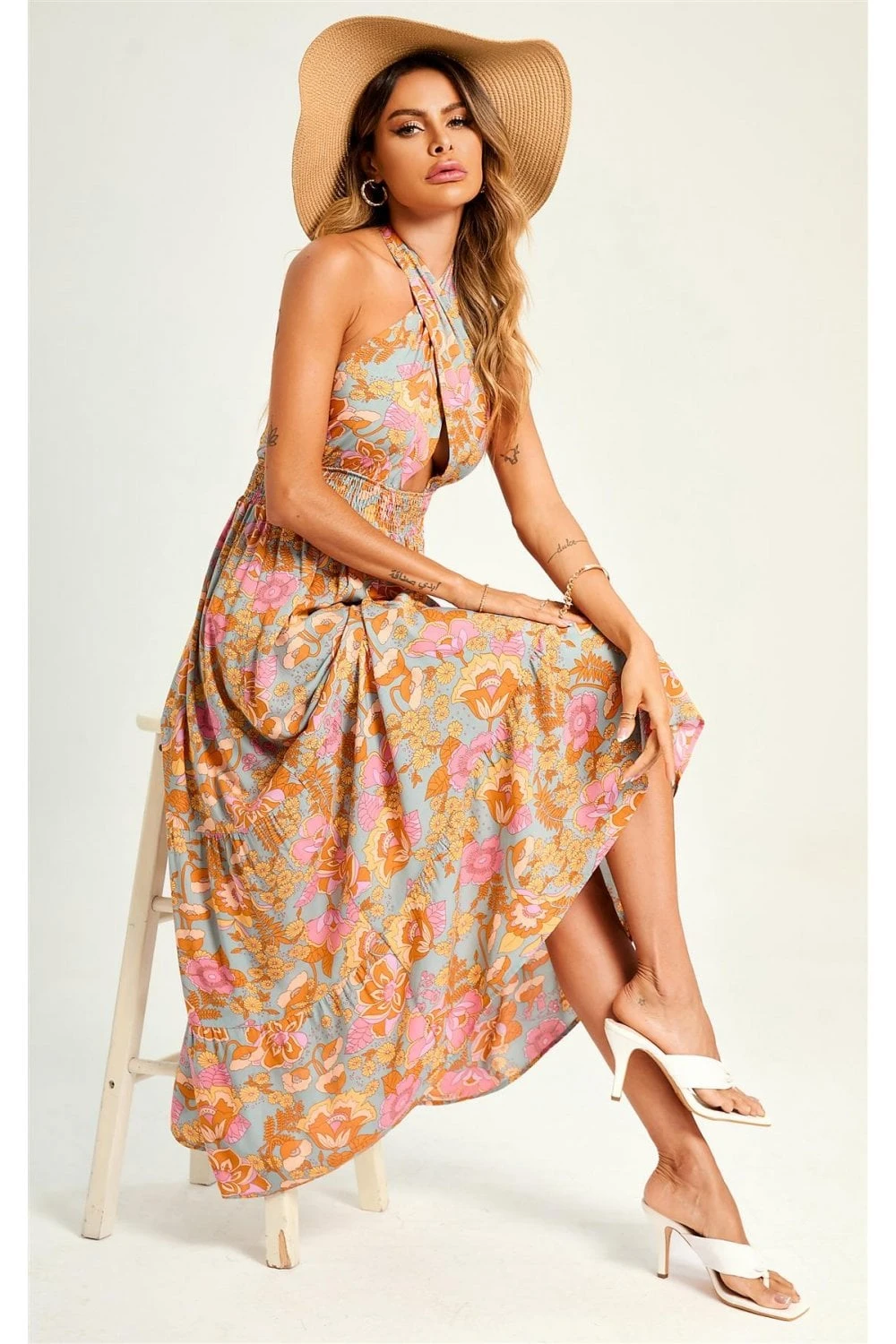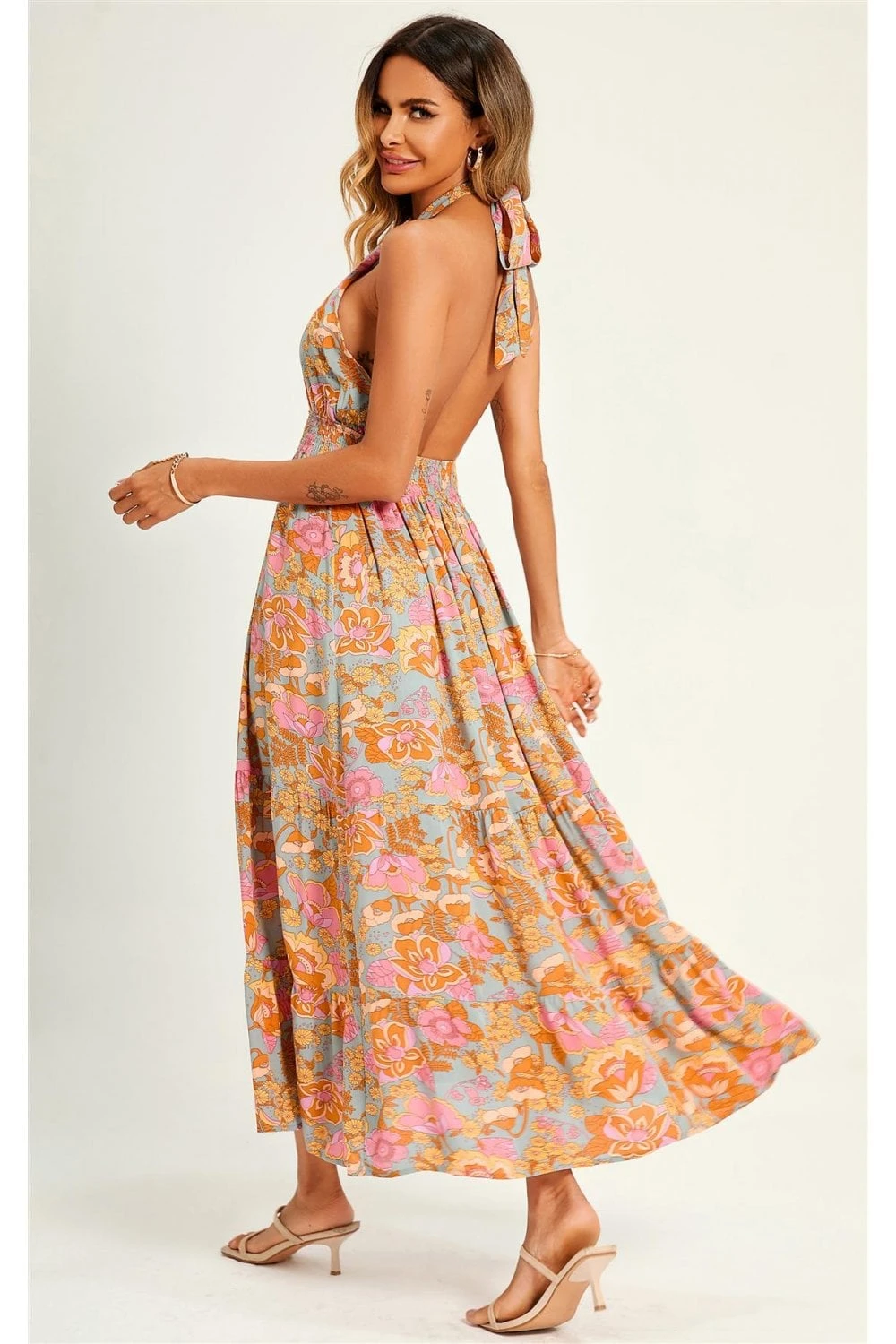 Pink Flora Print Halter Neck Tie Back Maxi Dress In Grey