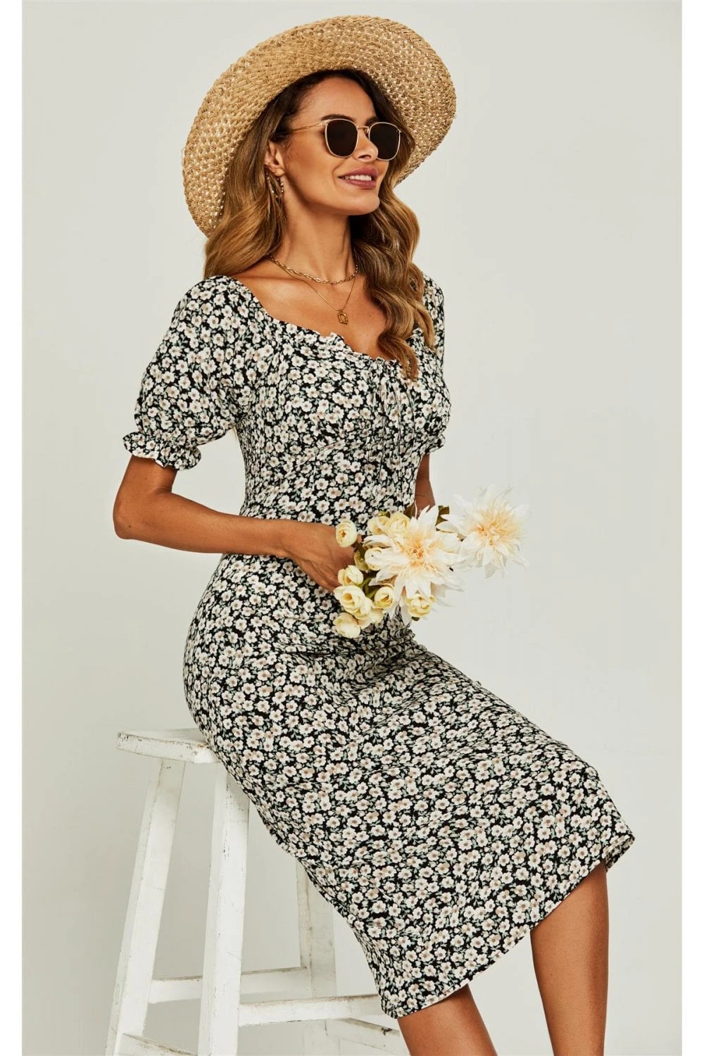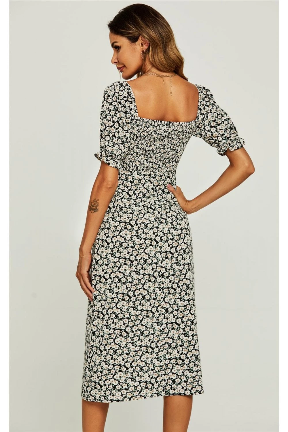 Little White Floral Heart Neck Puff Sleeve Midi Dress In Black