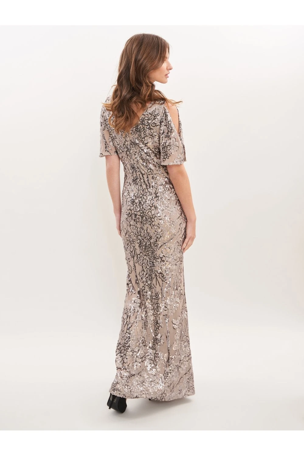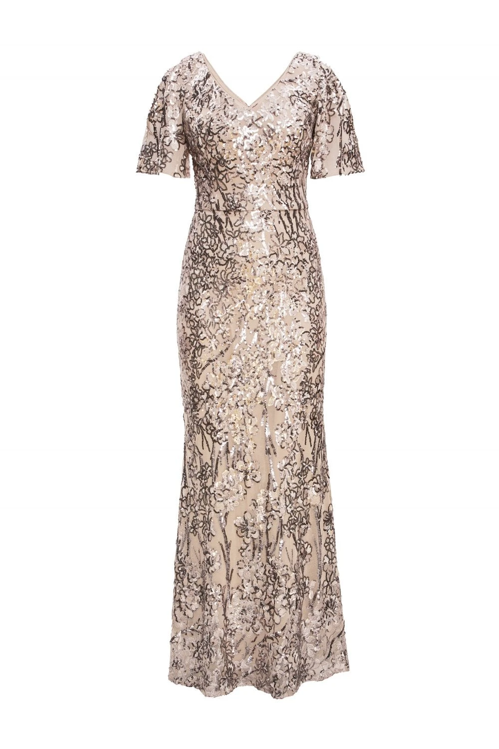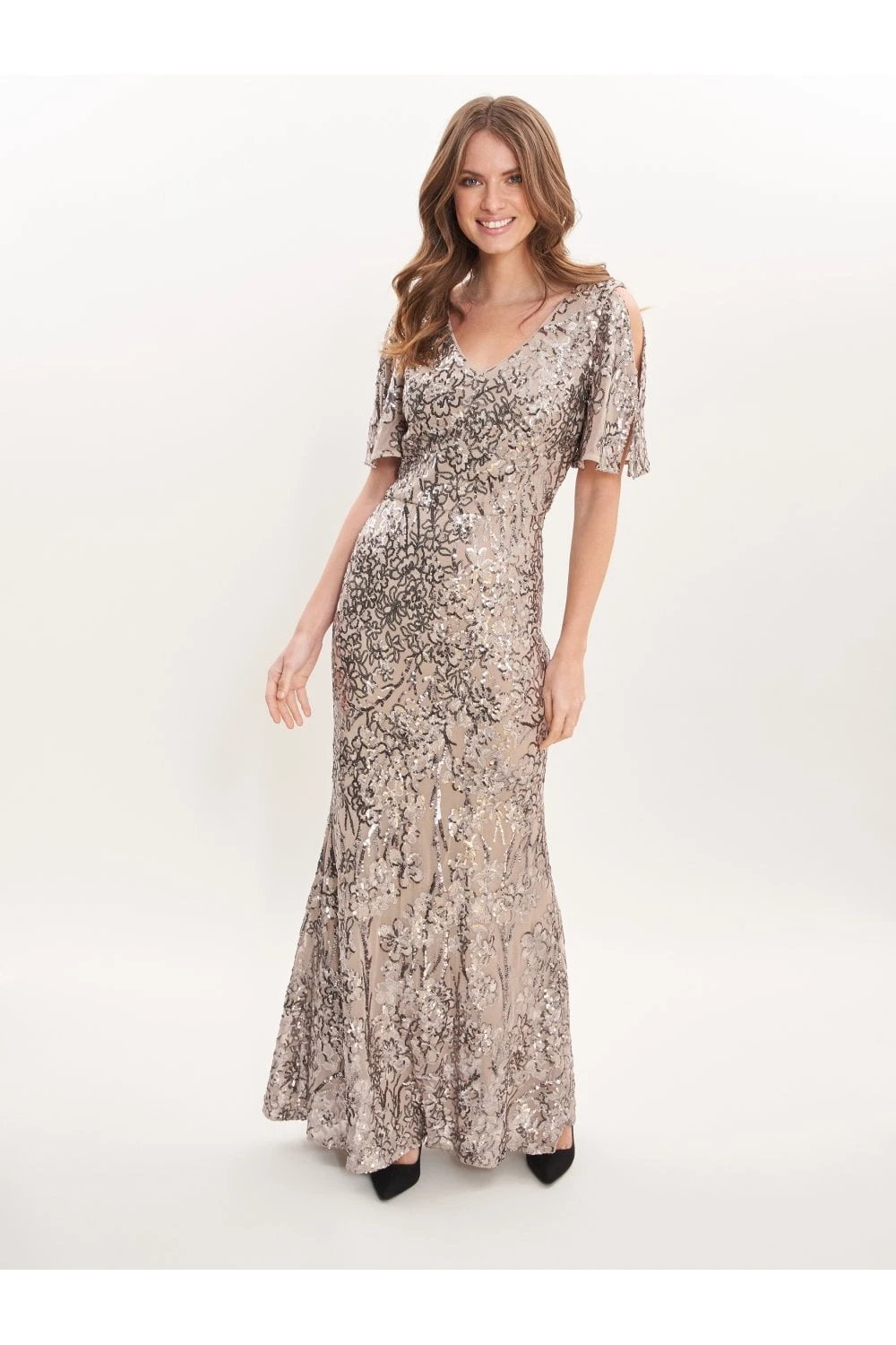 Figure-flattering and full of personality, this floral lace V-neck mermaid gown catches the light with sequin-embroidered blooms. This A-line dress has flowing flutter sleeves, perfect for any occasion.