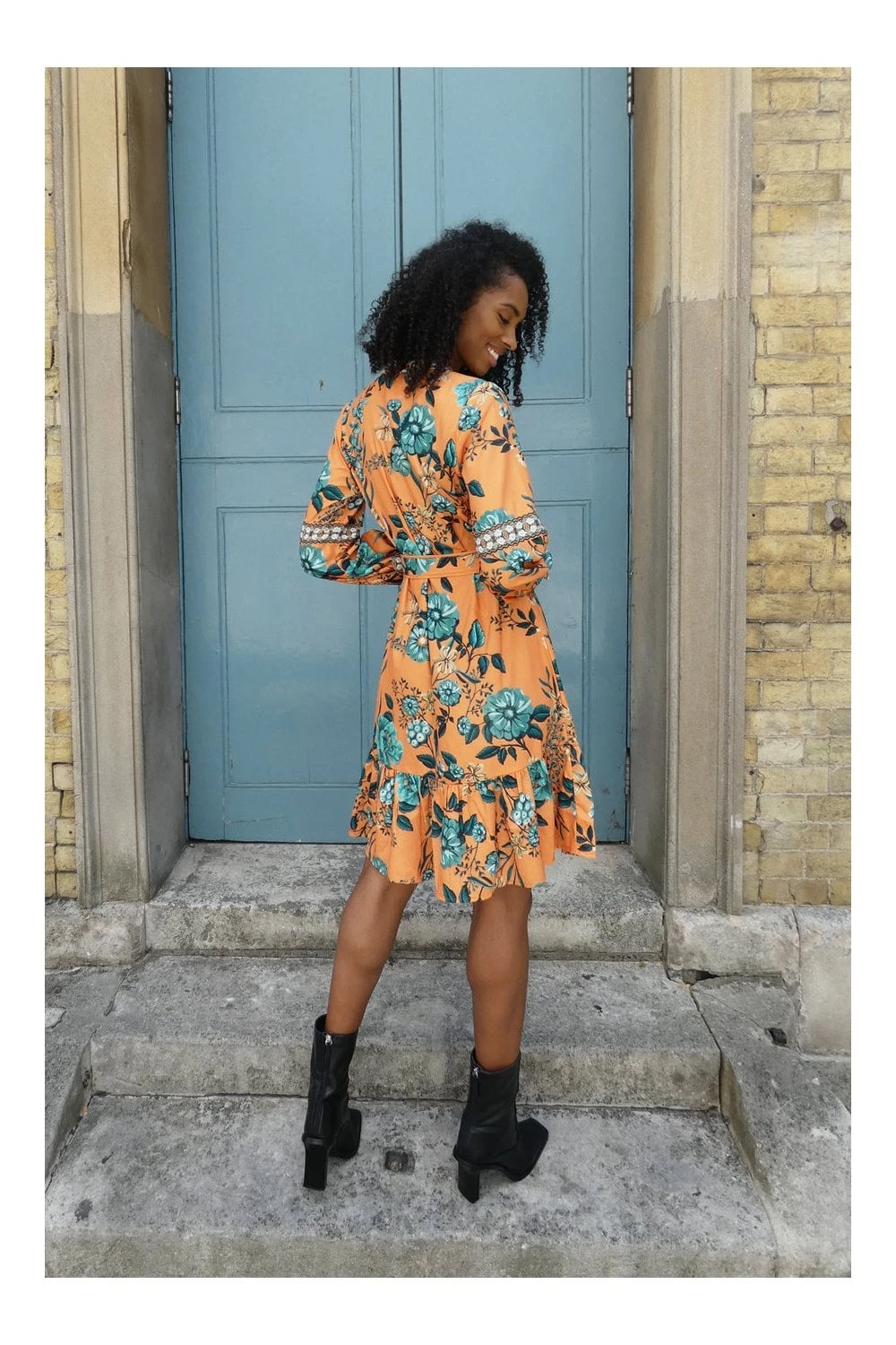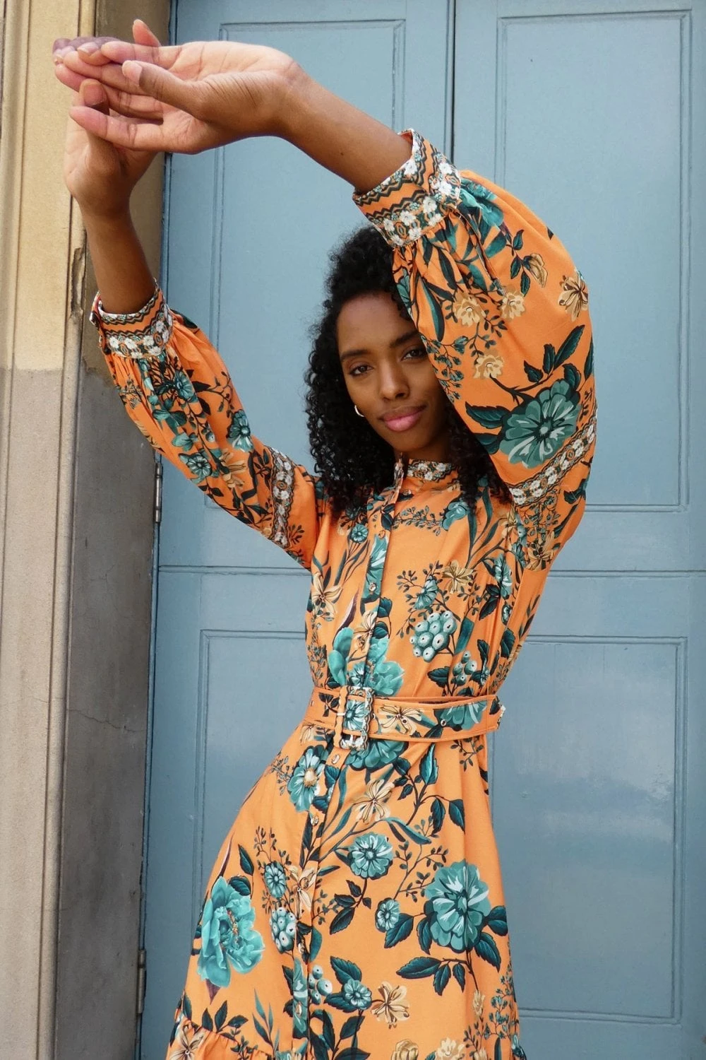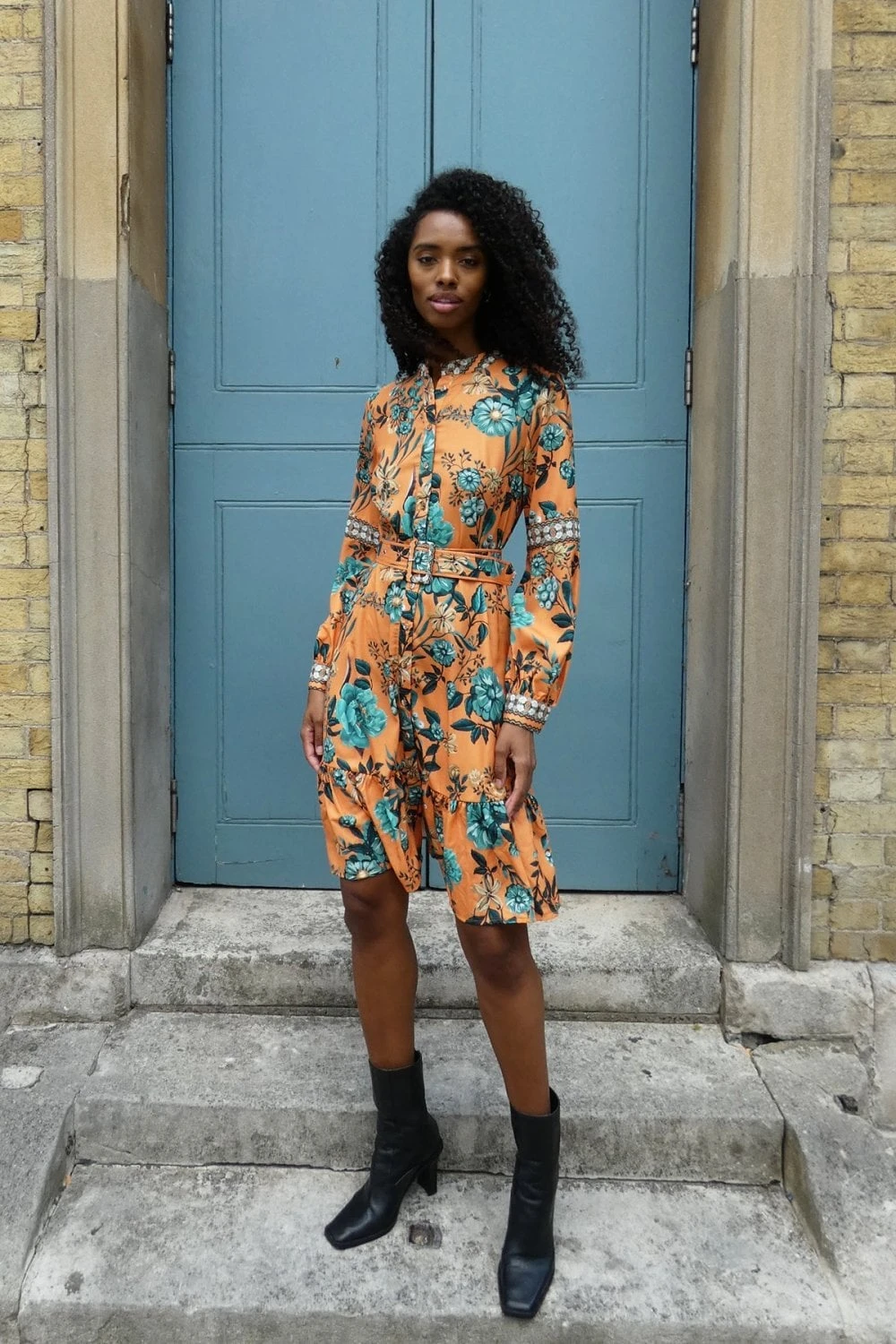 Be ready for every occasion with this beautiful orange and blue printed dress. With a front placket, buckle belt and a high collar this is a great dress for Autumn and Winter adding a pop of colour to your wardrobe.