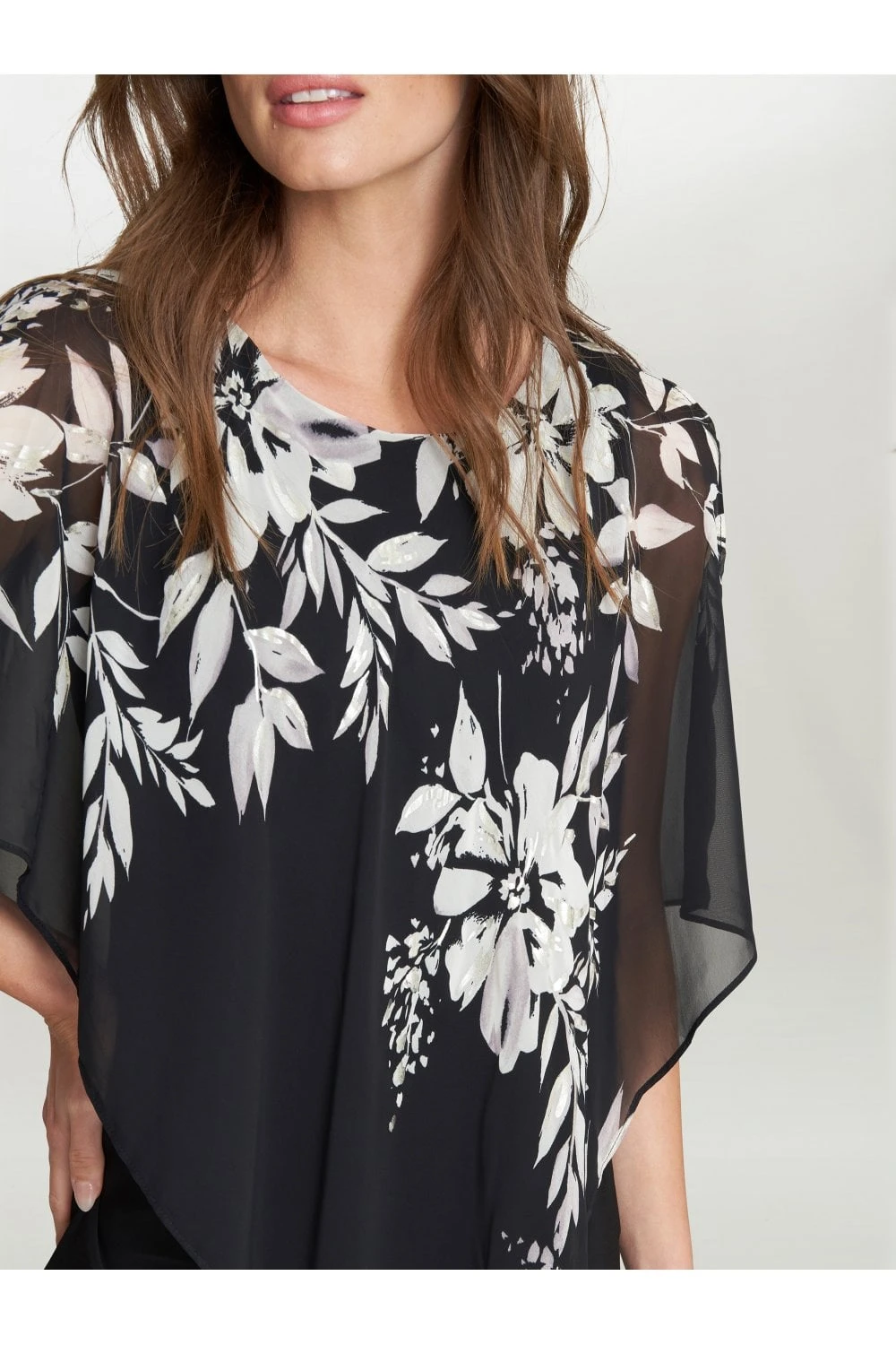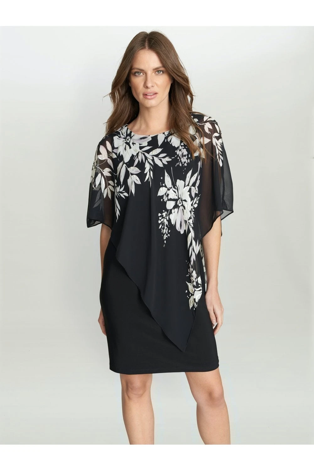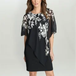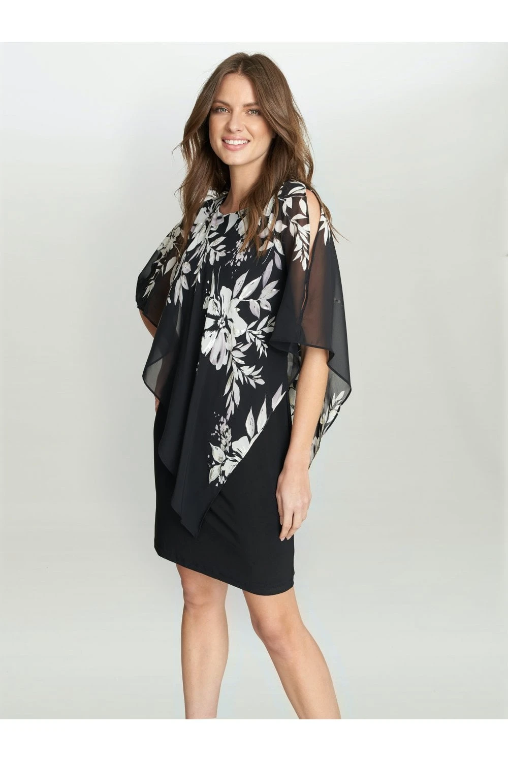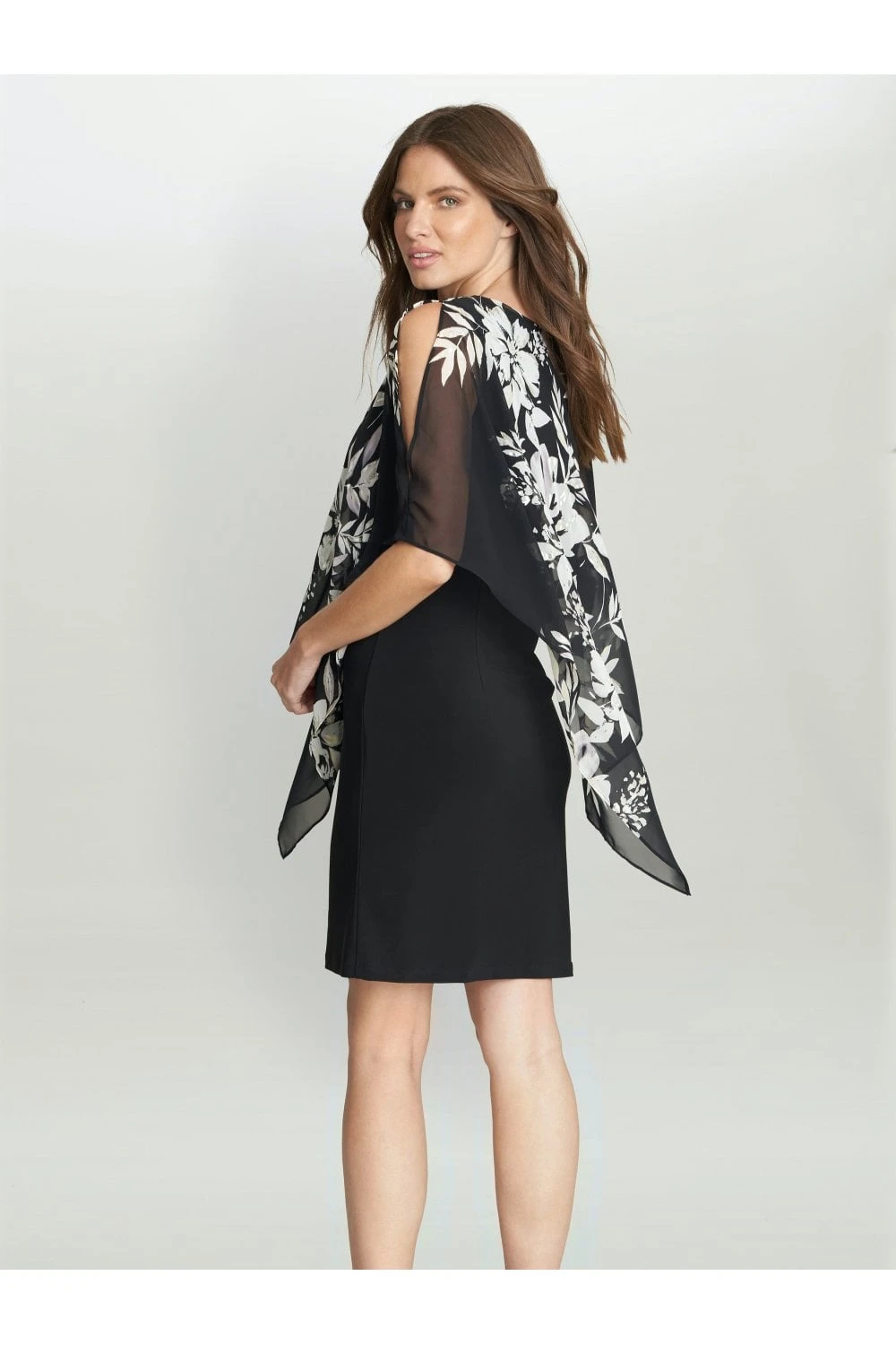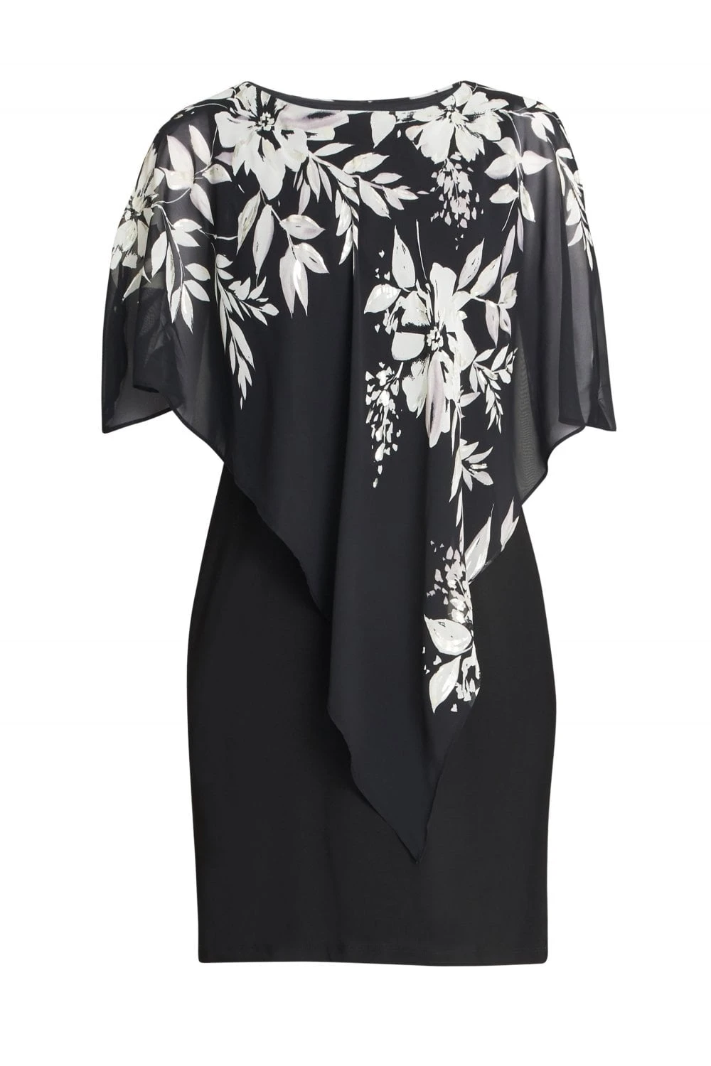 Add a twist to the perfect LBD with our Kiya caped dress. The sleeveless dress is made from a soft, stretch jersey and the chiffon cape features a beautiful black and white floral pink, with touches of metalic. The cape is not detachable.Â