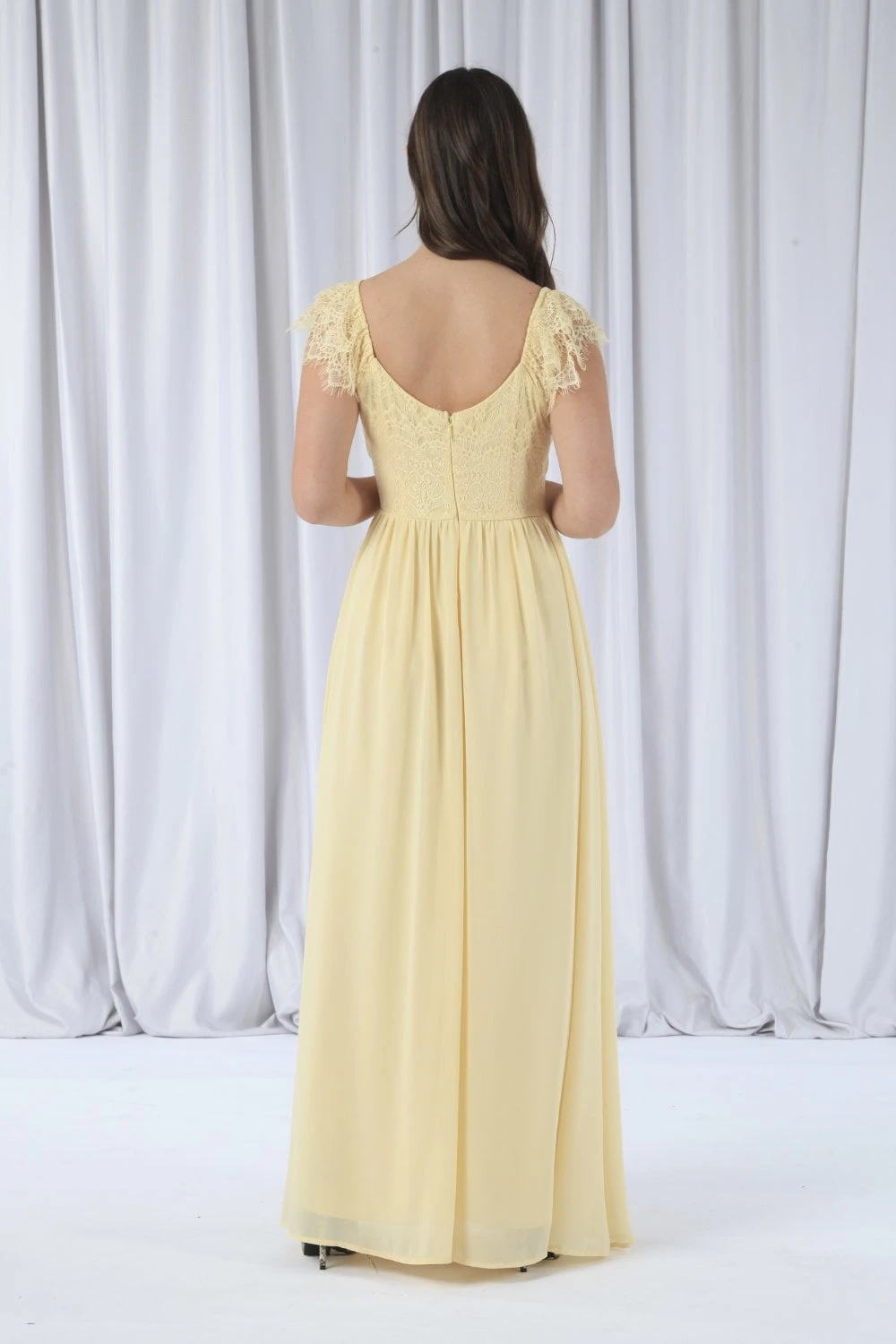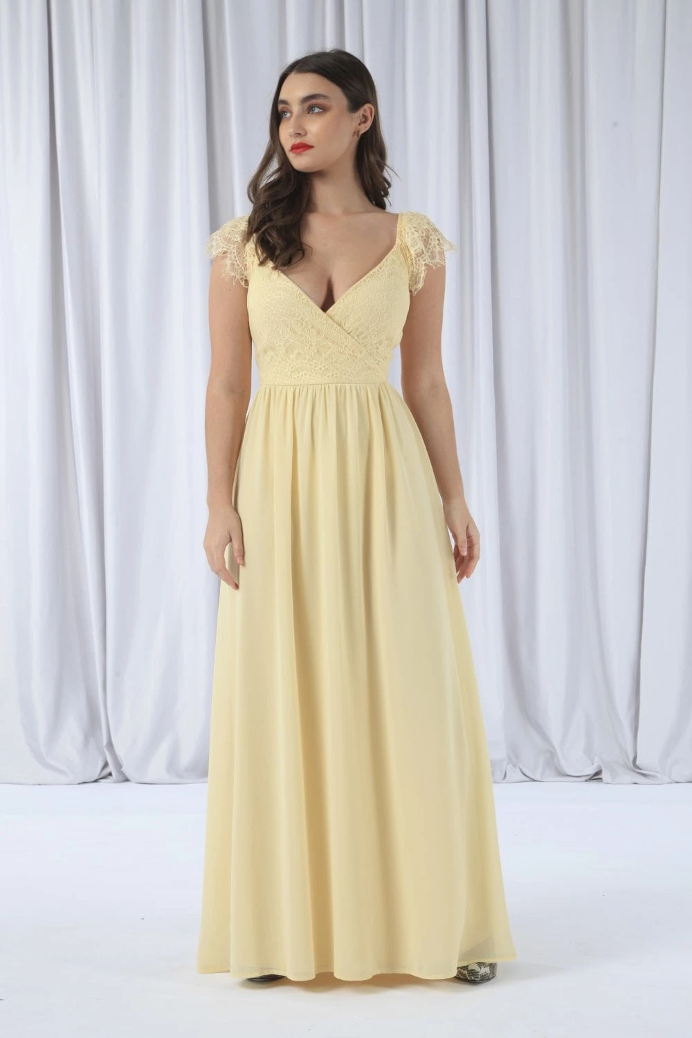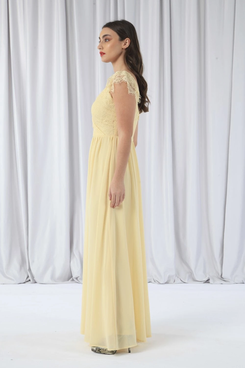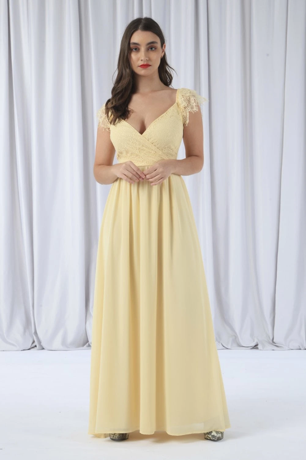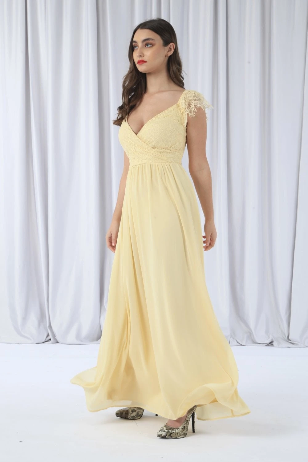This yellow maxi dress is perfect for fancy occasions such as weddings or a prom. It features a wrap front design with a scalloped lace cap sleeve and an invisible zip fastening.