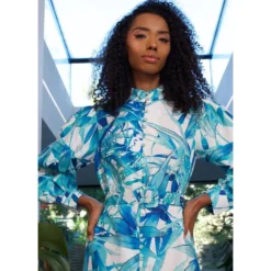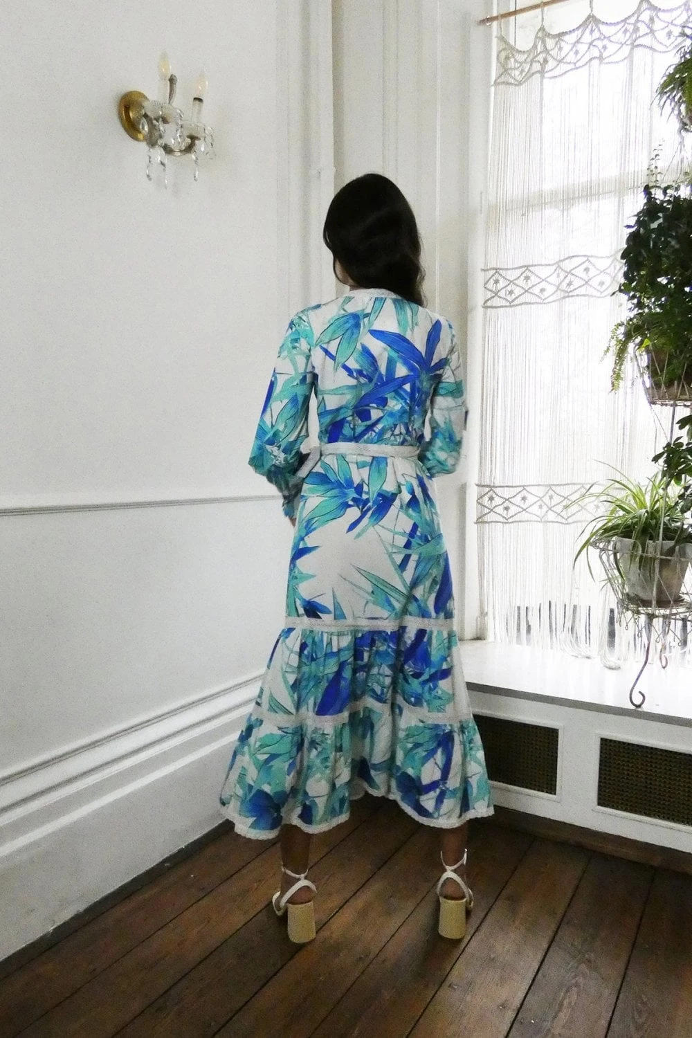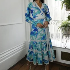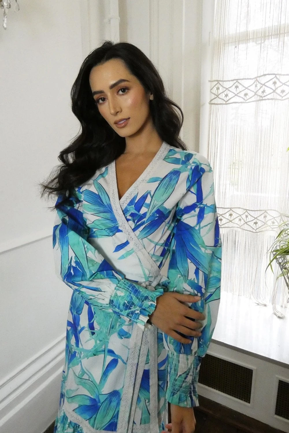 Our Lindsay Blue wrap style dress is the most flattering shape for any body type. Featuring long sleeves with elasticated cuffs and lace trim