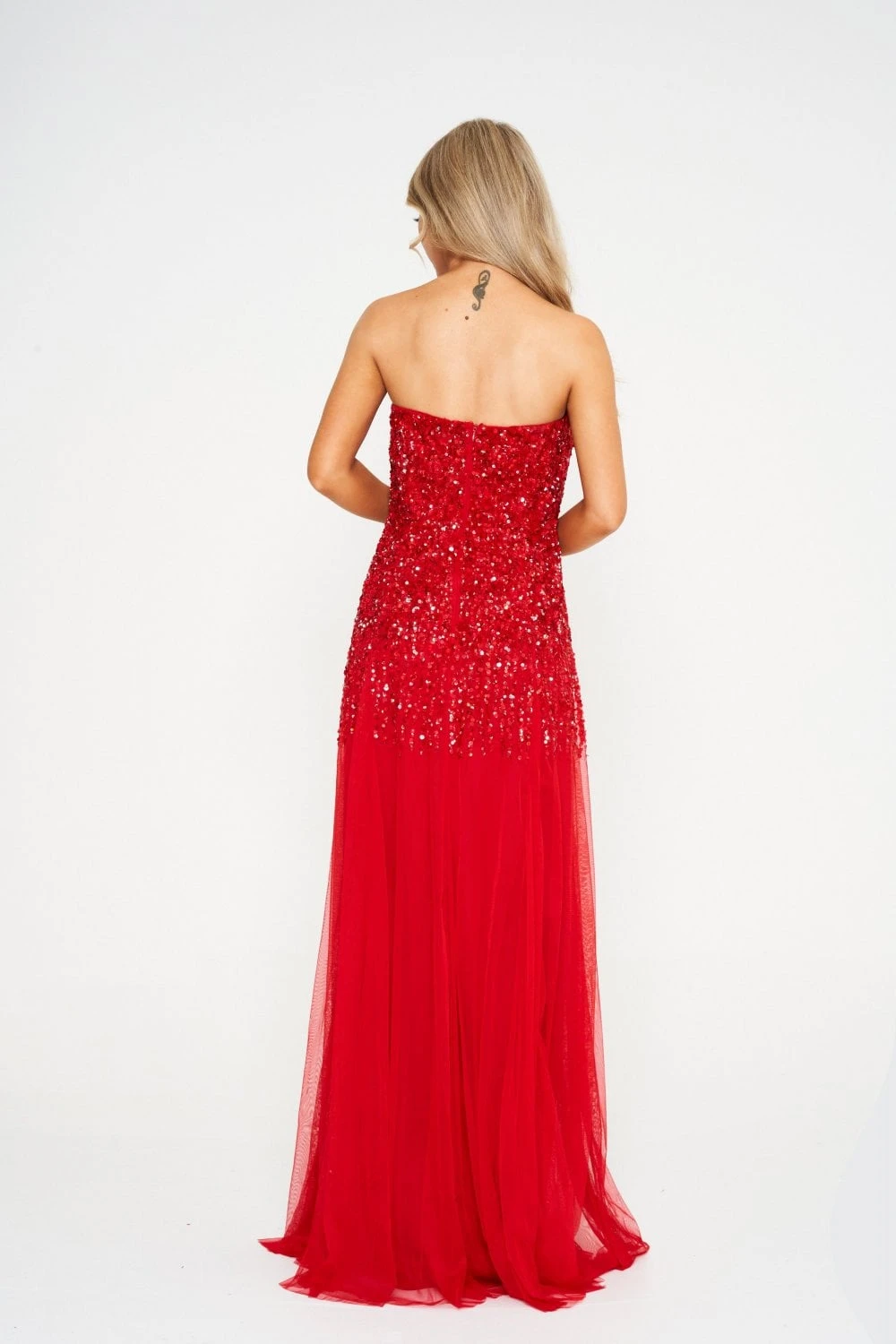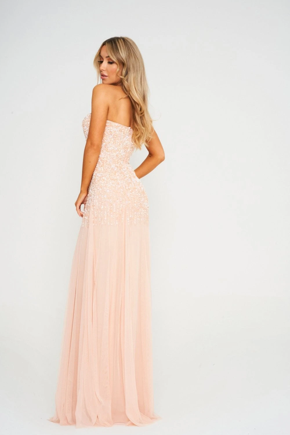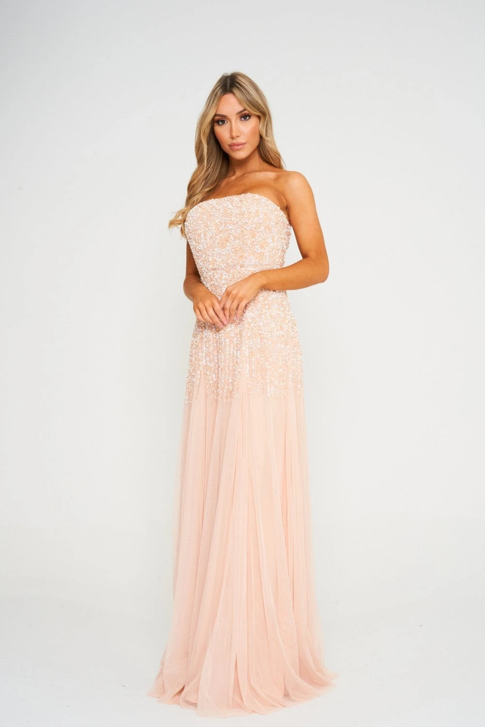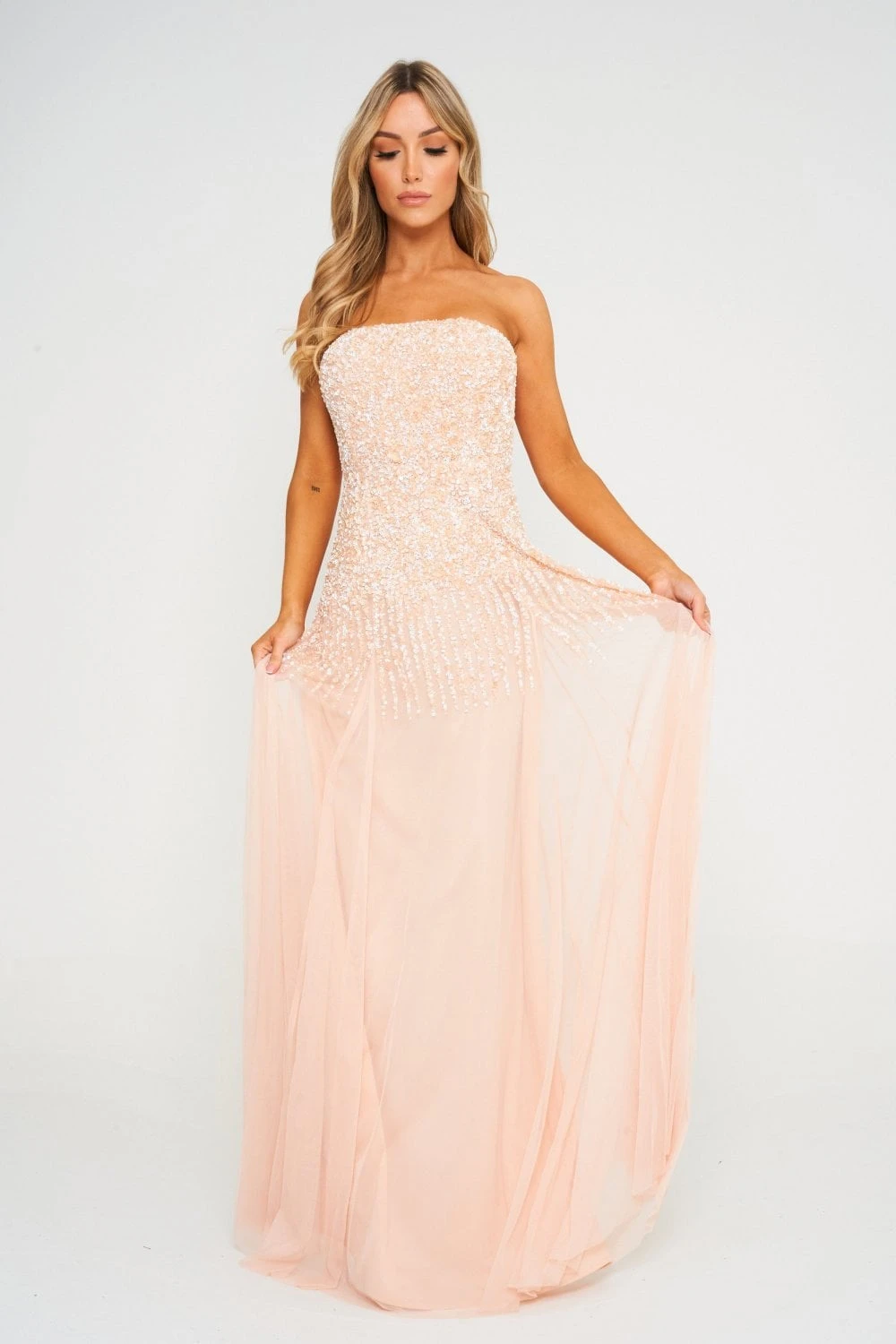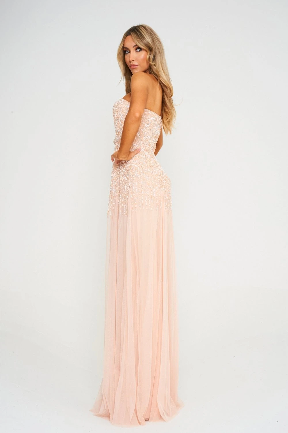 Sparkle all night long in this gorgeous maxi dress. Doubtlessly the most stunning part of this dress is the handmade sequin embellishment which is fully done by hand. It catches the light beautifully and will have you sparkling all night. The fitted top and pleated skirt create that gorgeous silhouette. The perfect bridesmaid or evening dress!