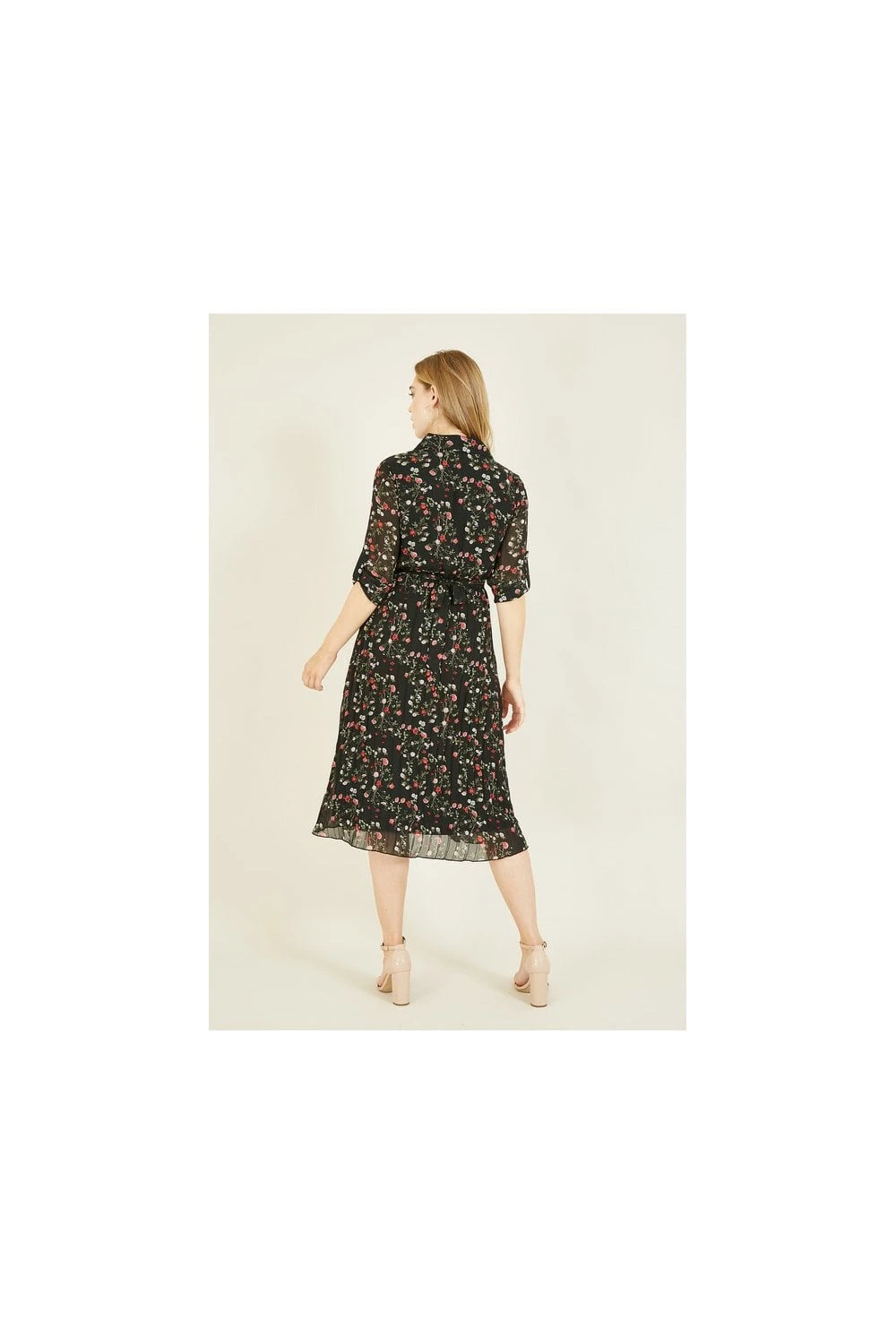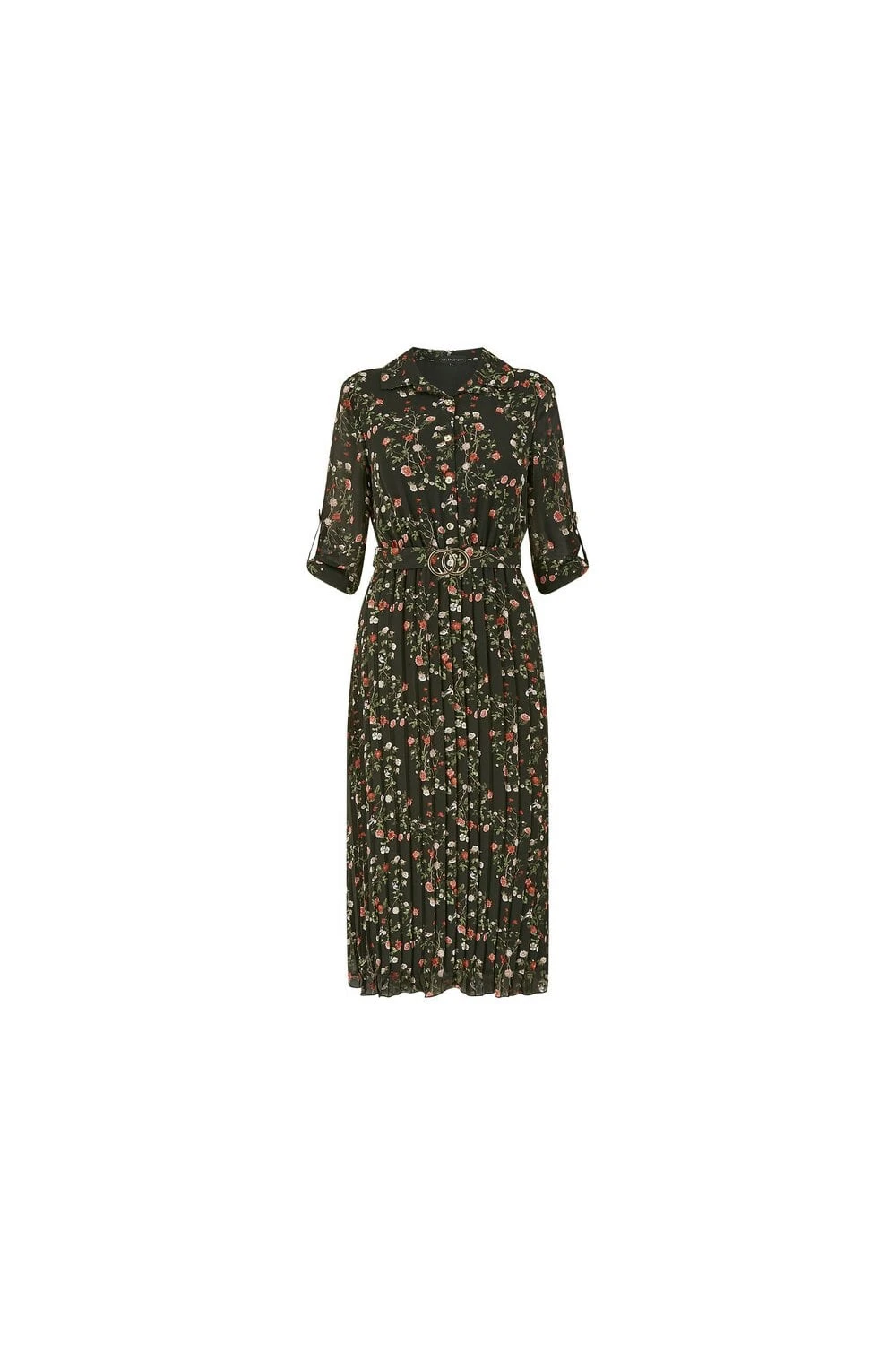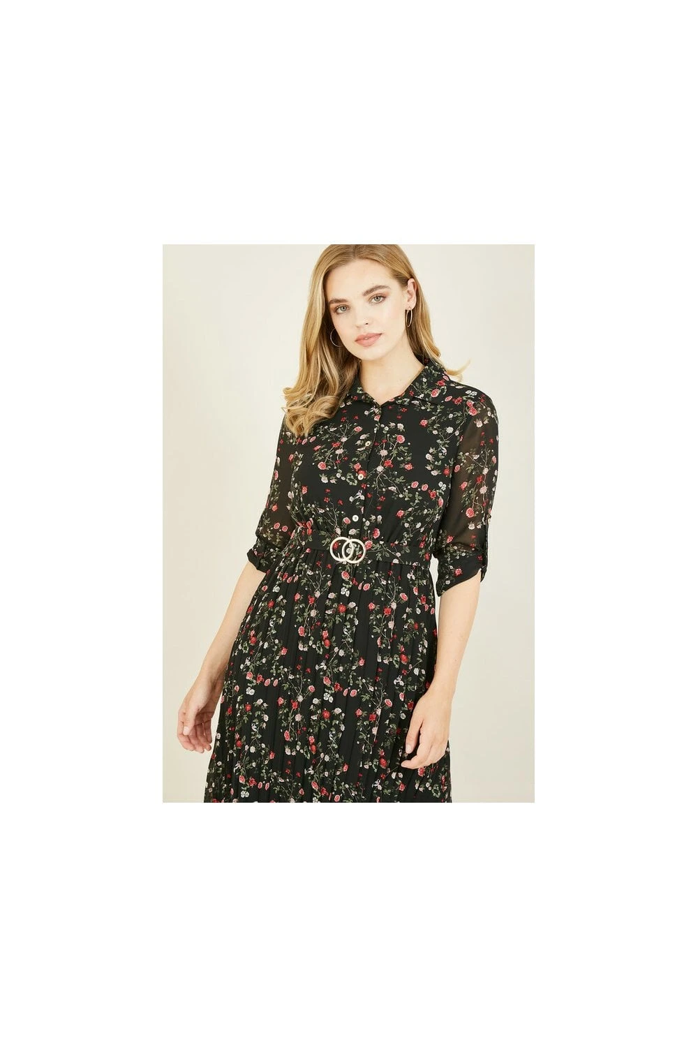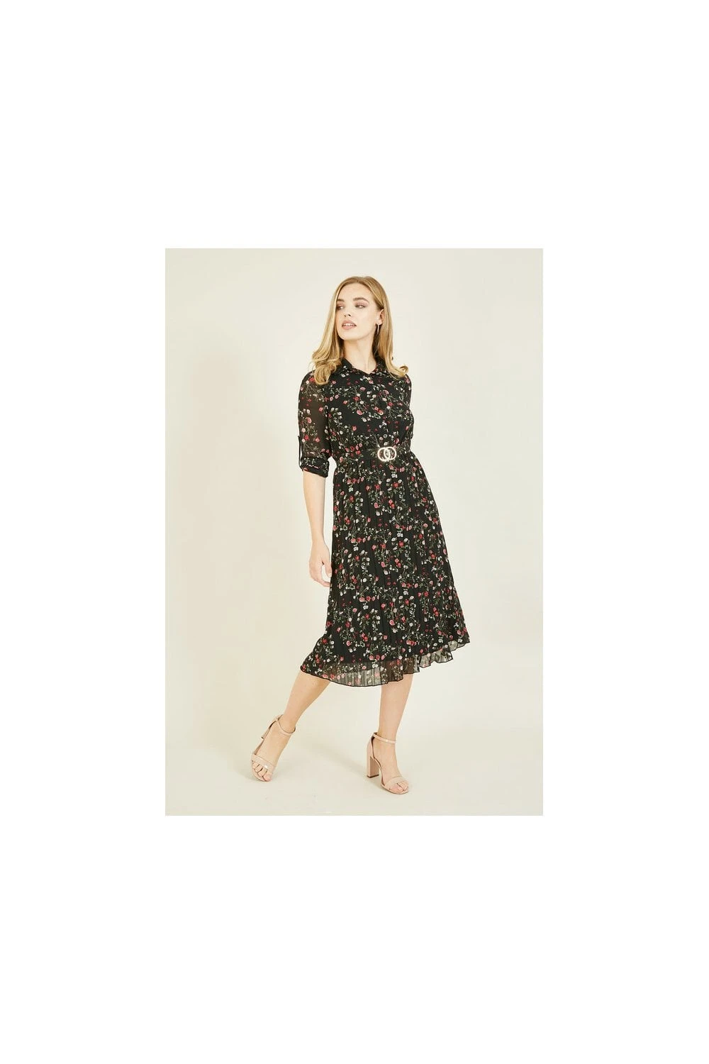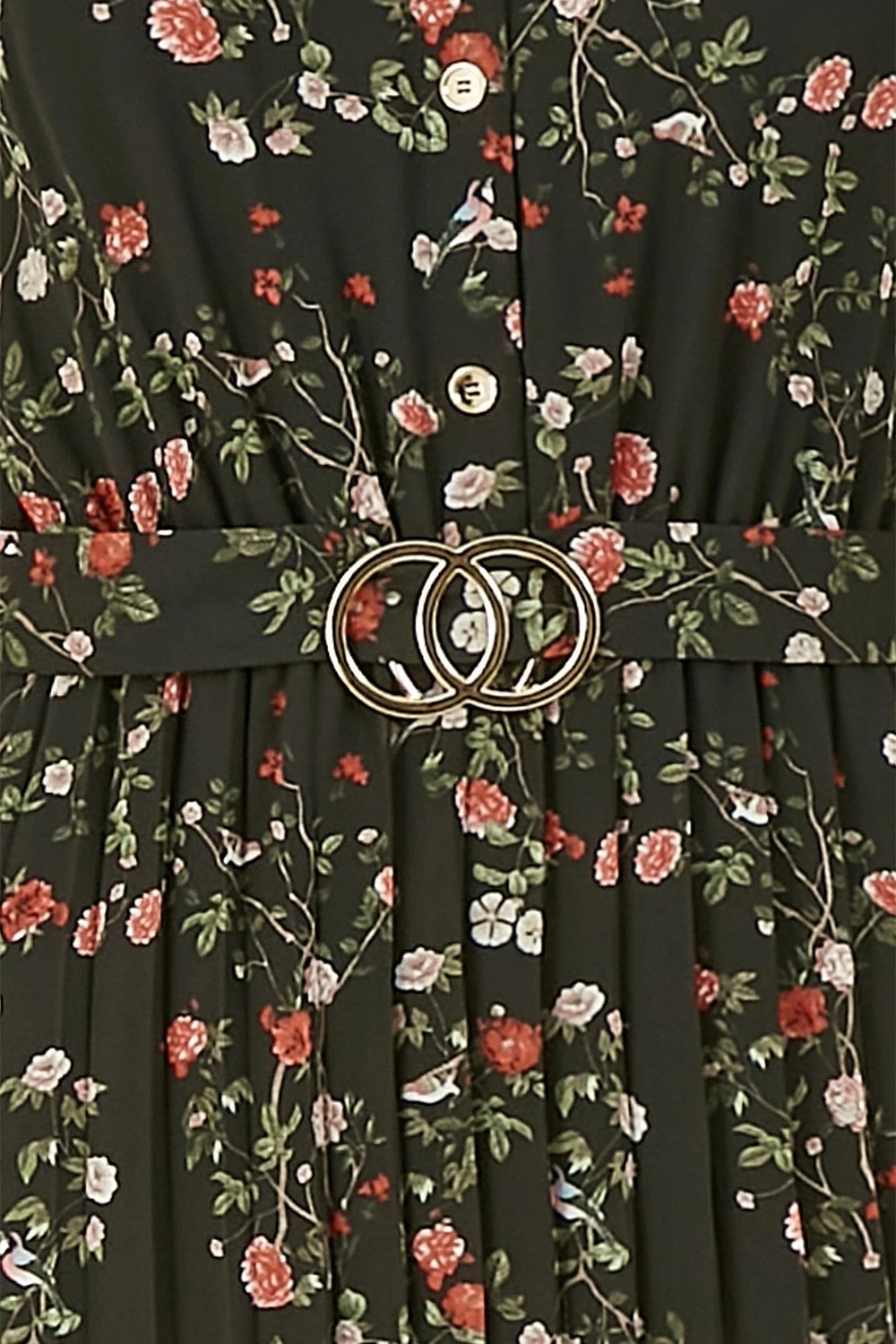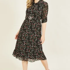 Ditsy florals and frills- what more could a girl want? This stunning Mela Black Ditsy Floral Pleated Skirt Dress is the perfect piece to see you through the seasons. With a shirt style cut, pleated midi skirt, button up 3/4 sleeves and statement gold ring belt. Match with gold jewellery and an oversized black clutch to complete the look.
