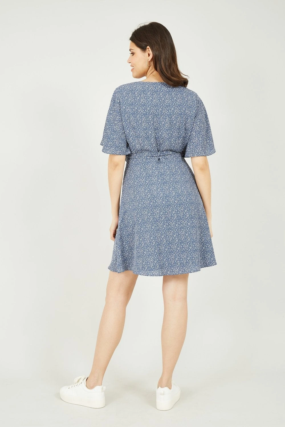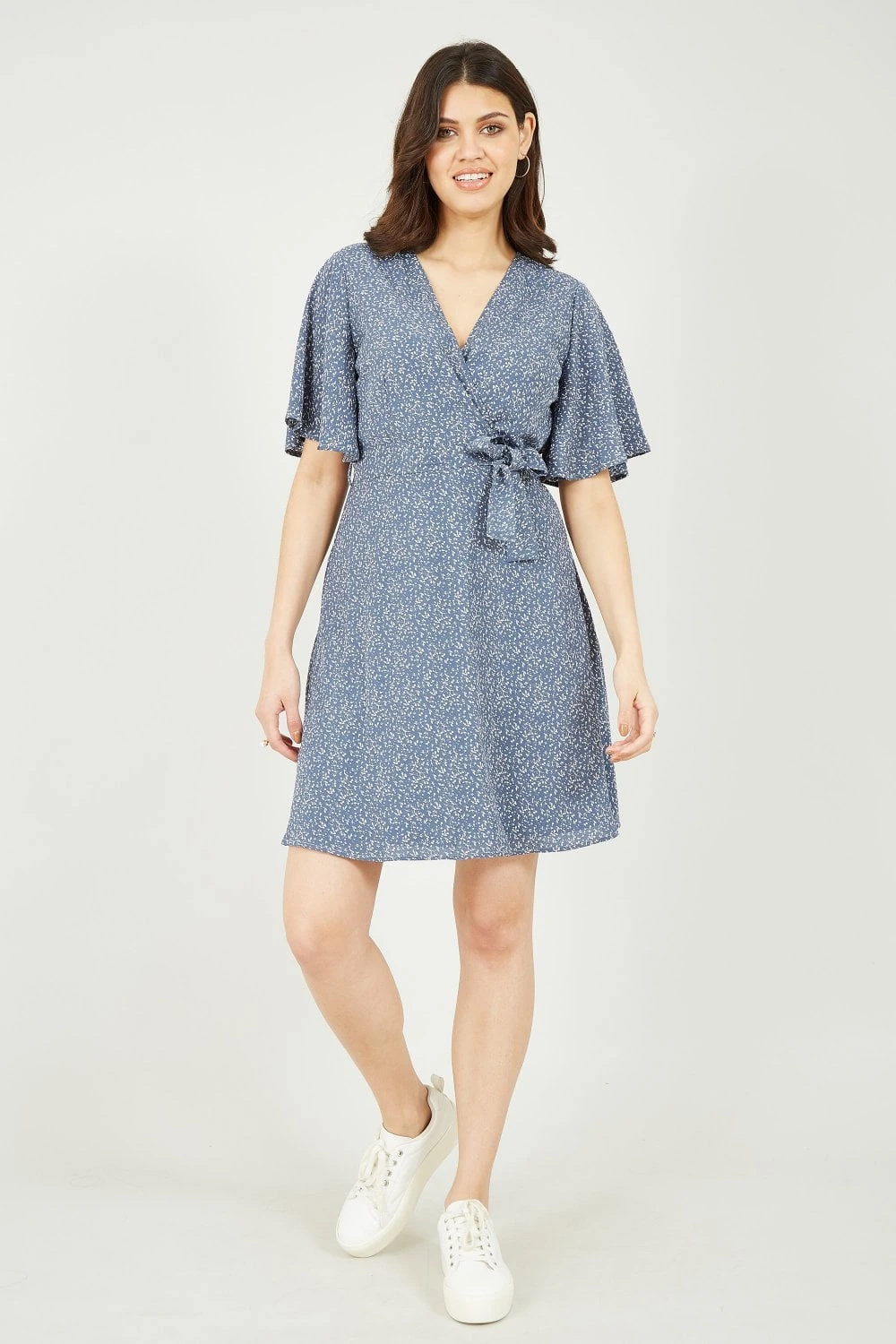 That’s a wrap. This stunning Mela Blue Abstract Dot Wrap Dress is unique, flattering occasionwear. With a figure accentuating v-neck cut, thick waist tie belt, short angel sleeves and abstract pattern. Match this dress with chunky heels and silver accessories.