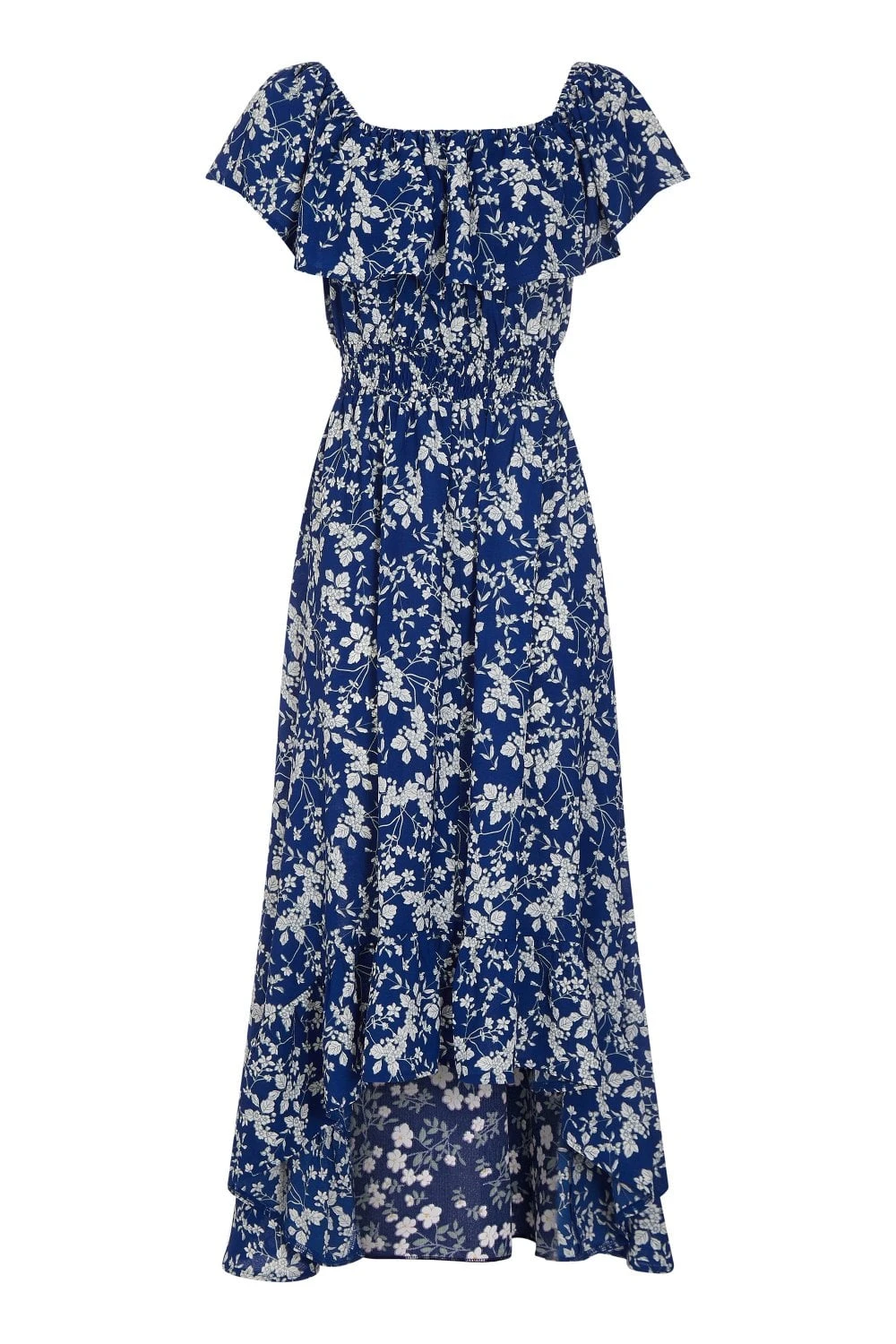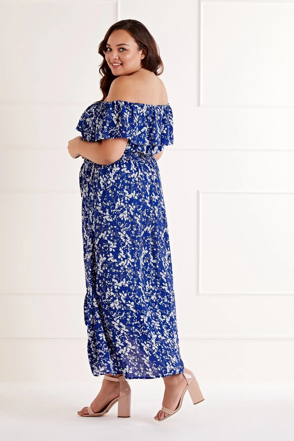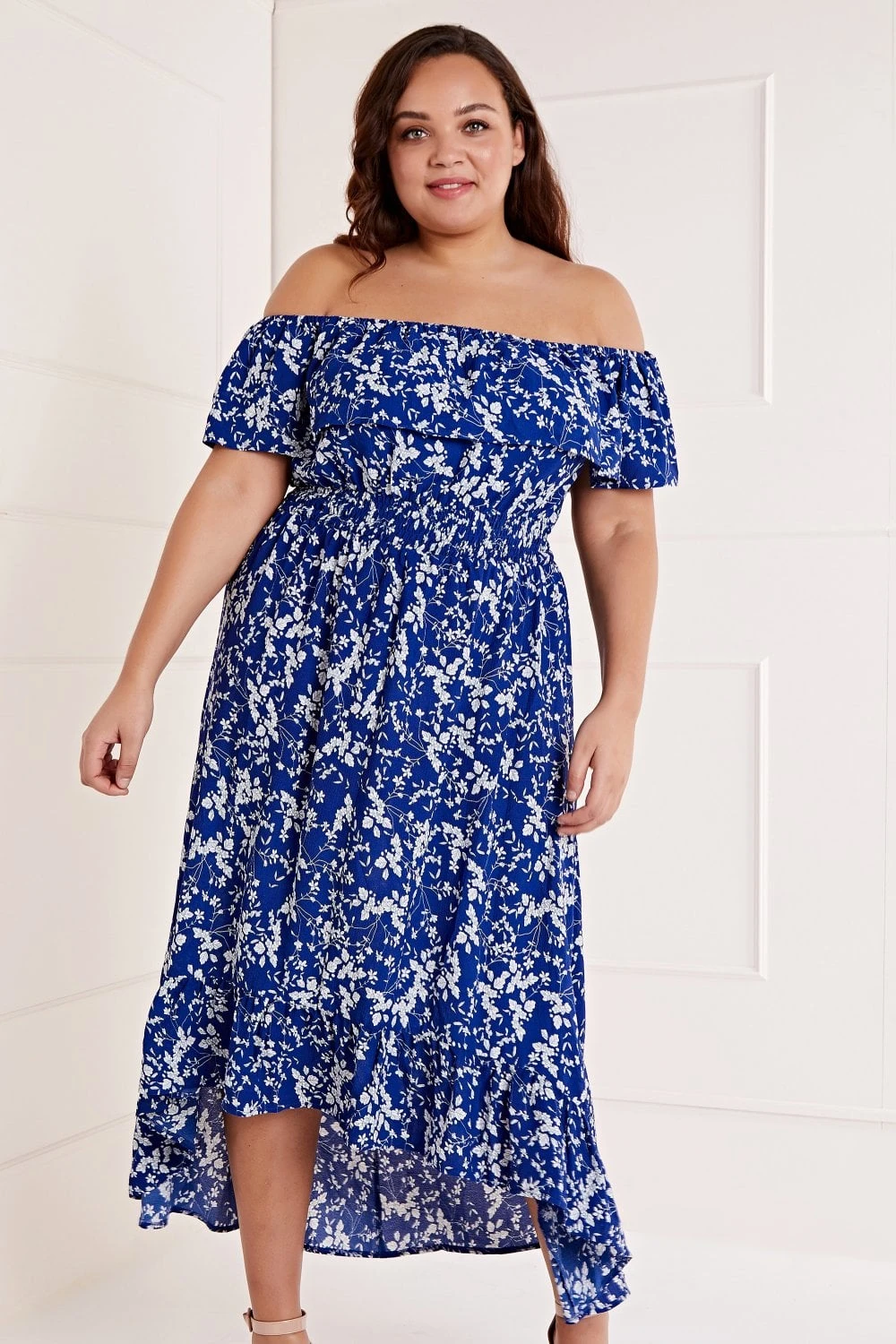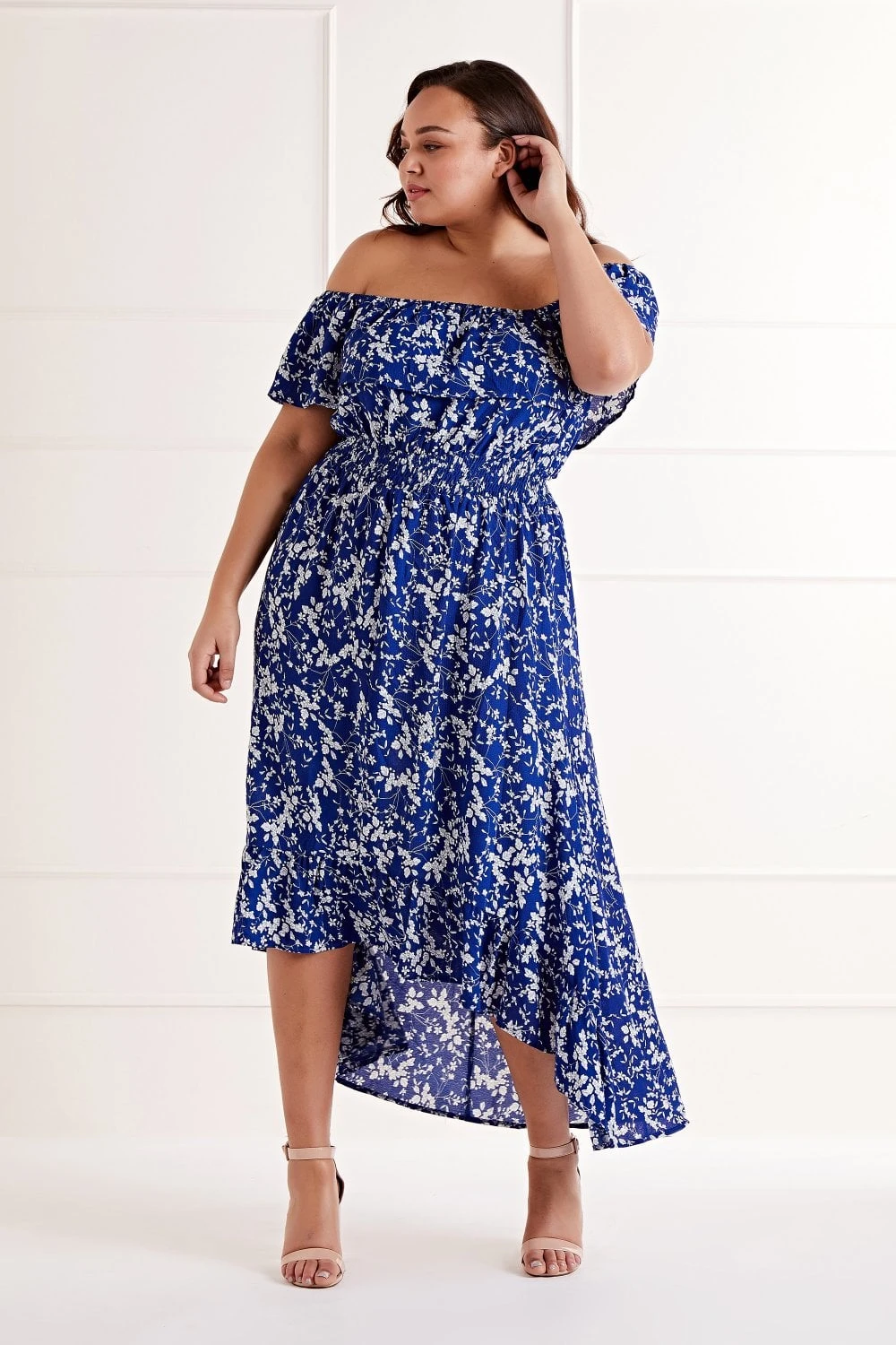 Floating in a feminine shape, our Mela Plus Size Ditsy Floral Bardot Maxi Dress is perfect for the warm weather. Framed by an off-the-shoulder neckline decorated with frills, it’s made from lightweight fabric printed with floral blooms. A tie around the waist accentuates your profile, balanced by an asymmetric hemline. Accessorize with anything from sandals to heels.