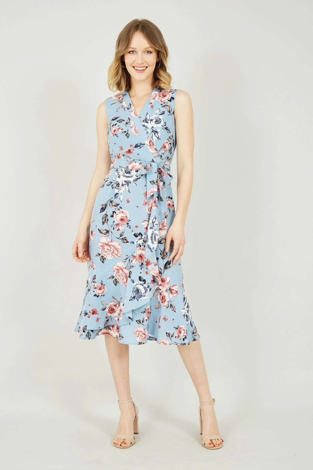 Blue is the colour of the season and this Mela dress is the perfect way to show it off. The subtle sky blue tone of this wrap around dress is finished with a bold all over rose print. The V neckline and slim fitted style is completed with a tie waist and slightly frilled hemline that skims up to the waist. Wear with nude heels and silver accessories for a glamorous look at any occasion.