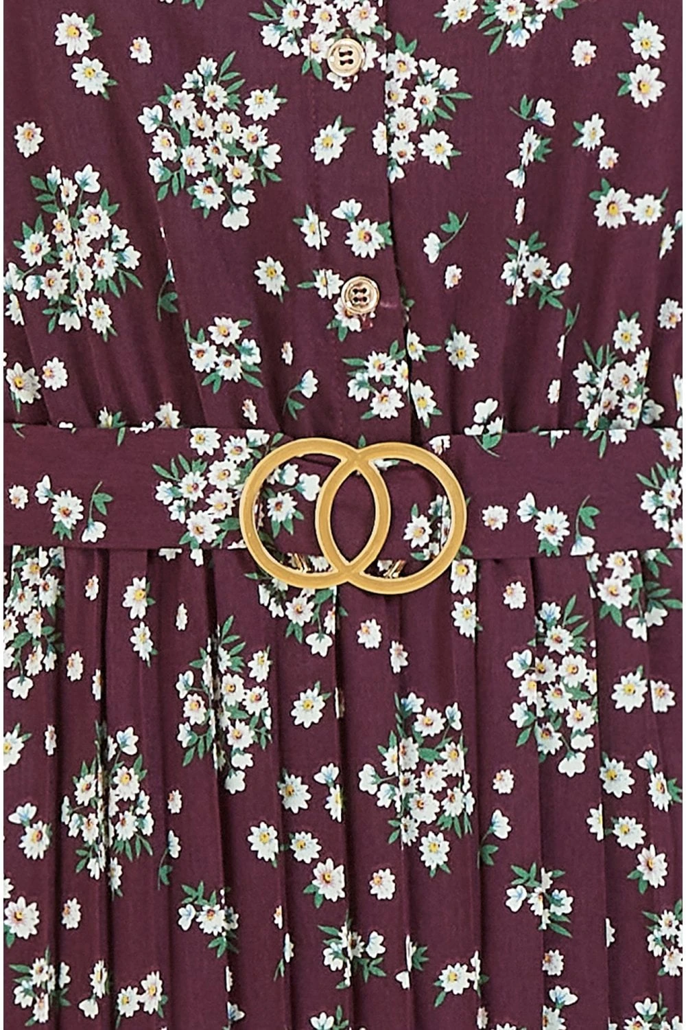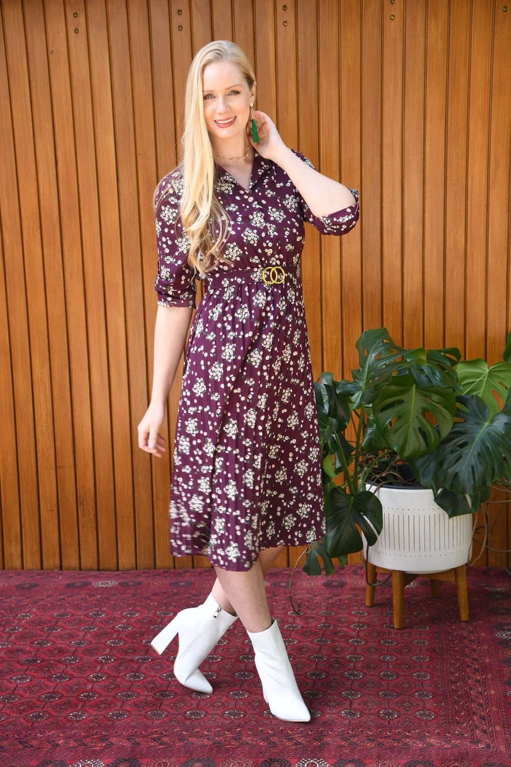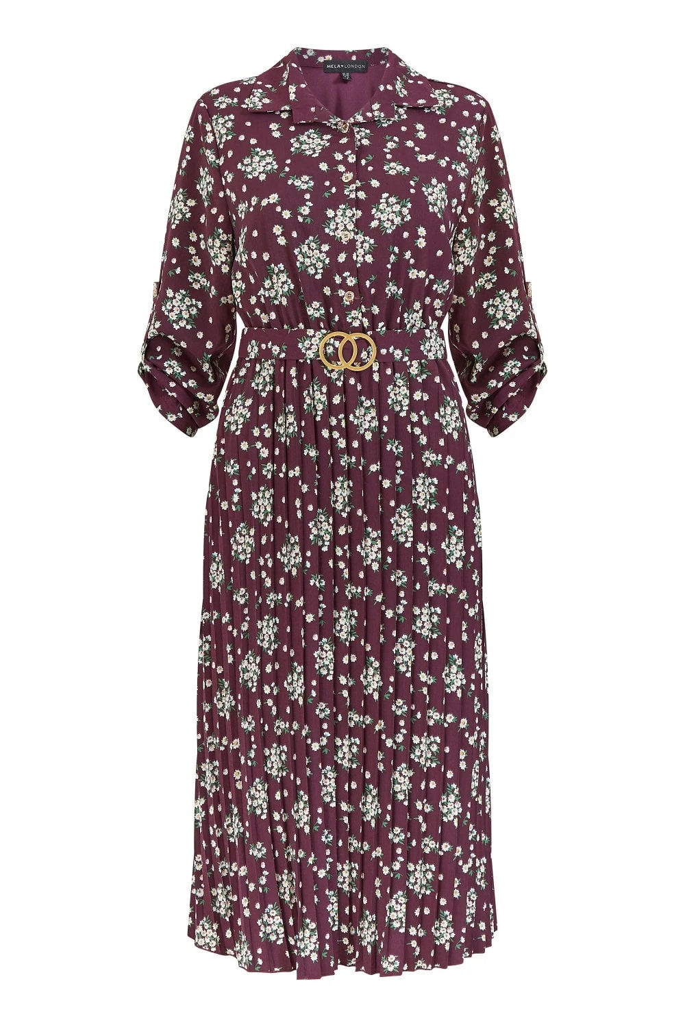 A pretty print update for our best selling dress. The pleated midi skirt, gold hardware and alluring burgundy colour is the only way to go for work to weekend plan. The button up front, 3/4 sleeves and with tie waist with the gold interlocked design belt is ready to wear with boots or trainers.Â