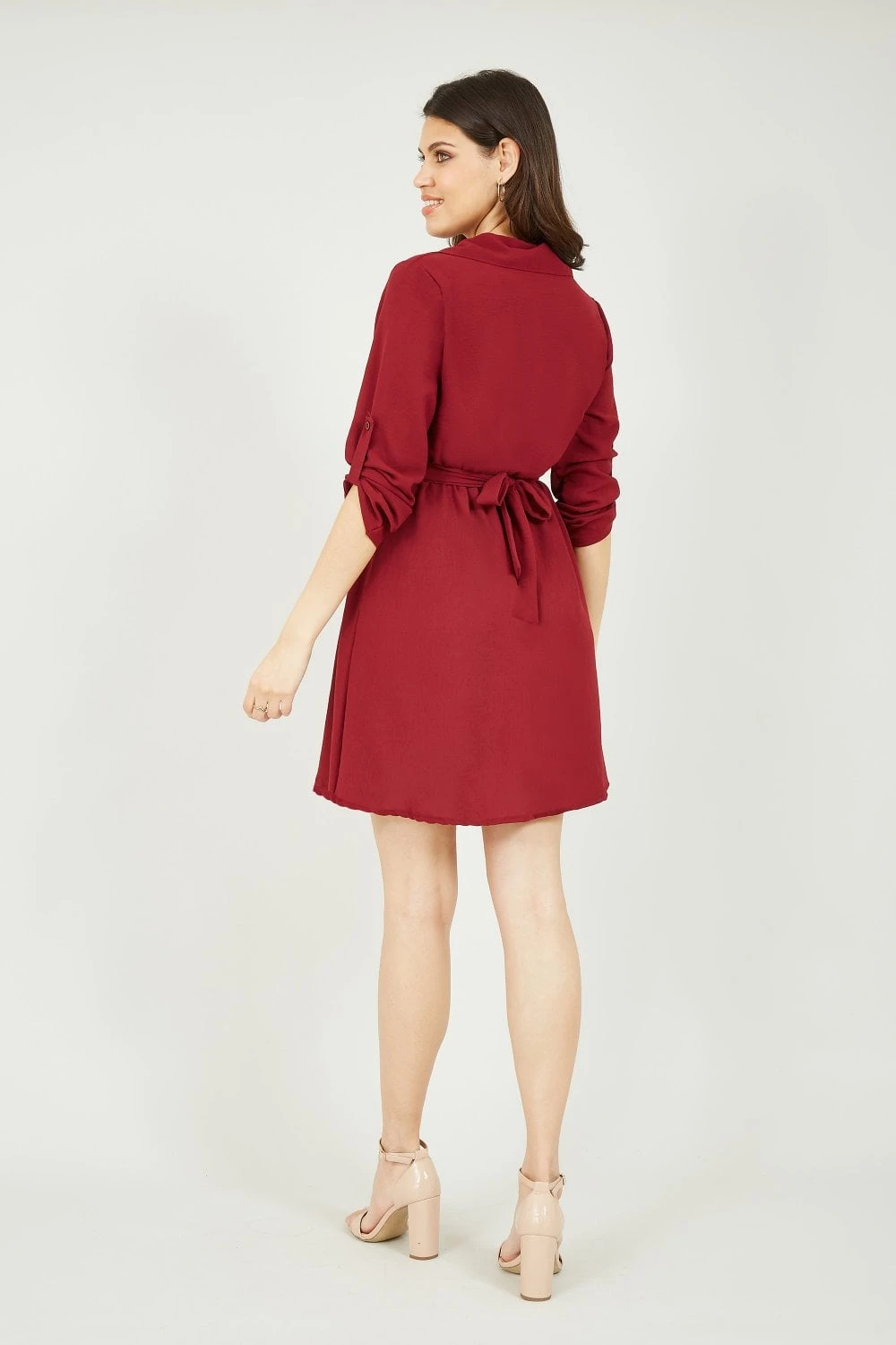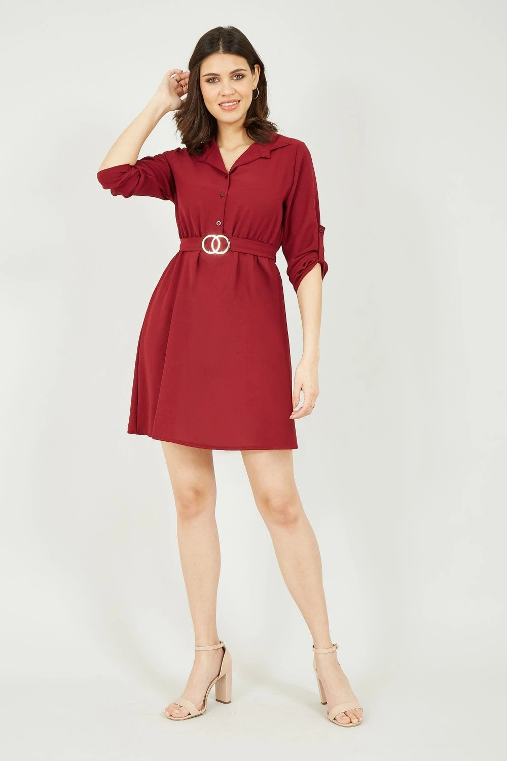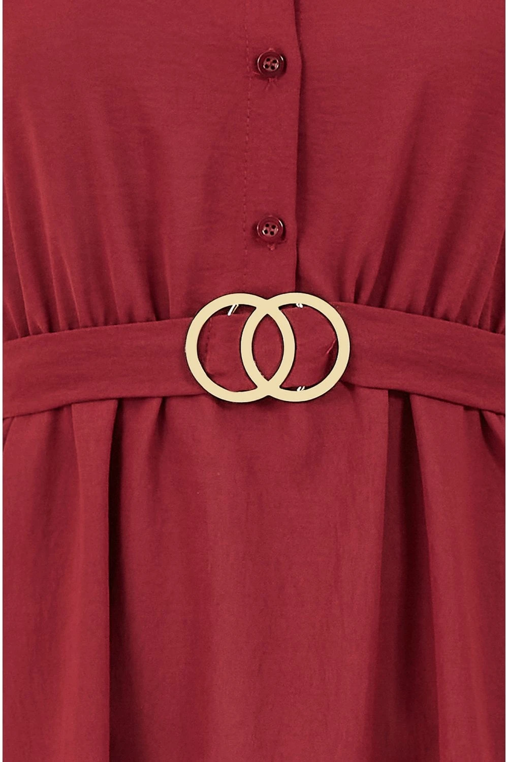 Stay on trend in this Mela Gold Buckle Shirt Dress. In a striking burgundy, this classic fit features collar and button through fastening, a flattering waist cinching belt with gold buckle, and adjustable sleeves. Match with tights and ankle boots for a stylish A/W look.