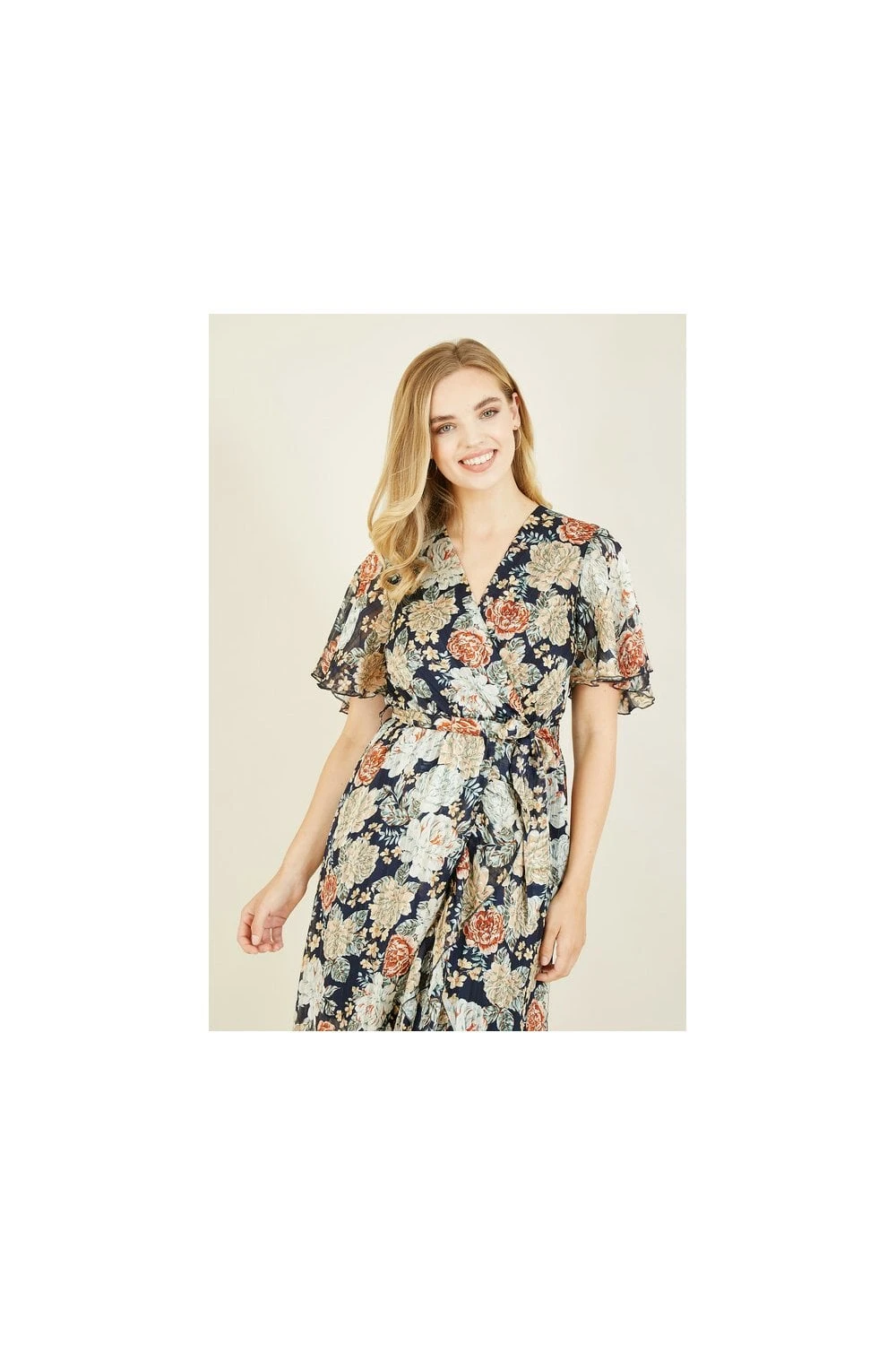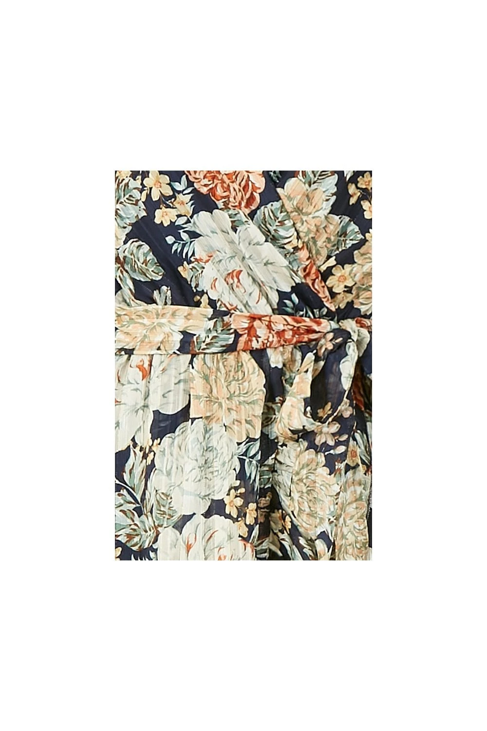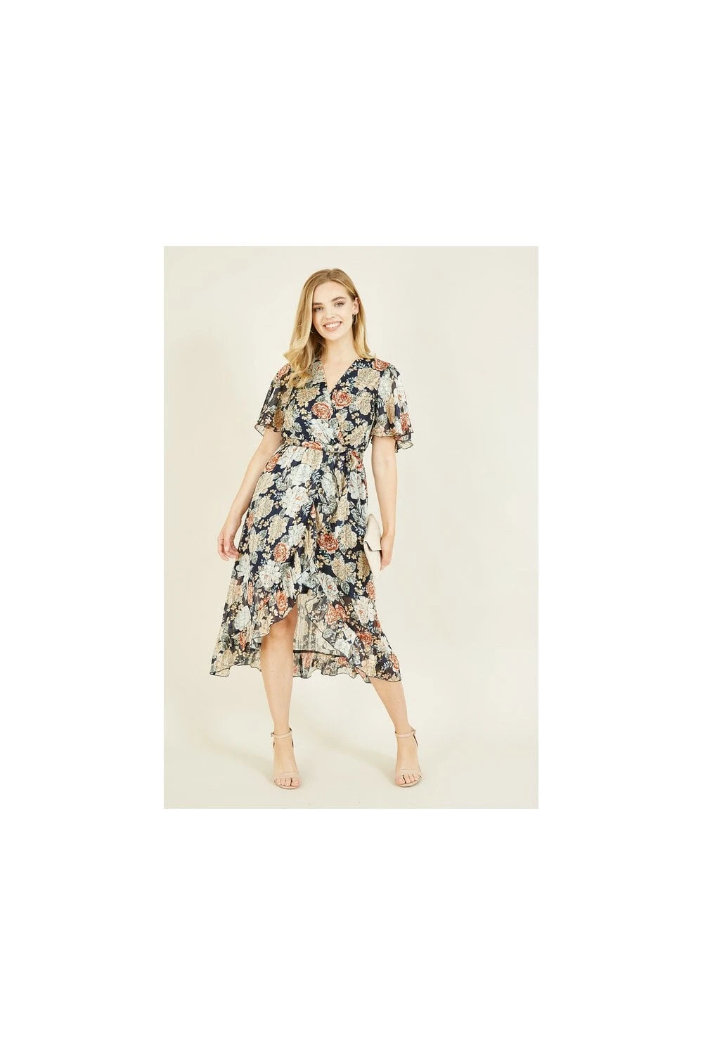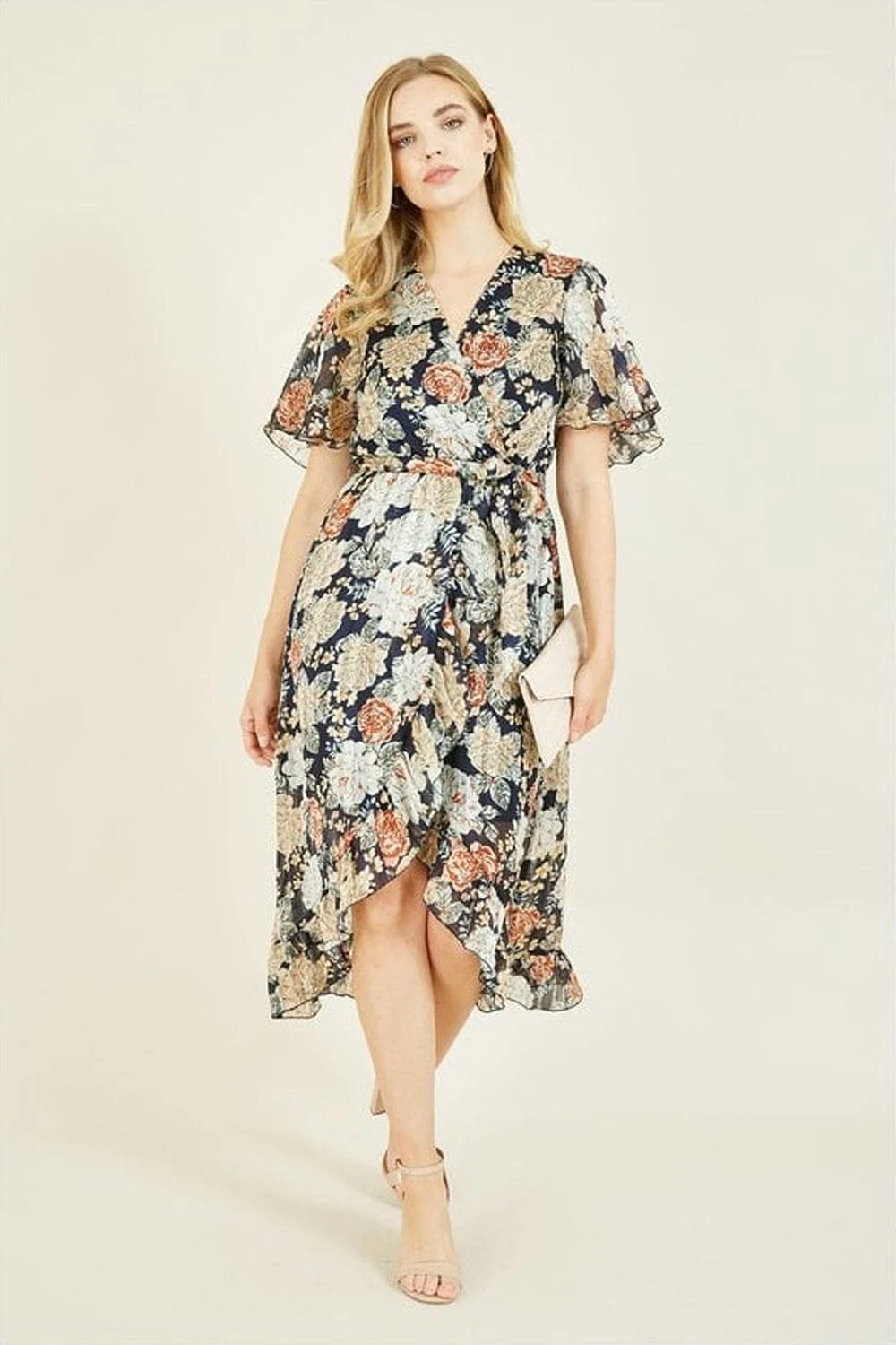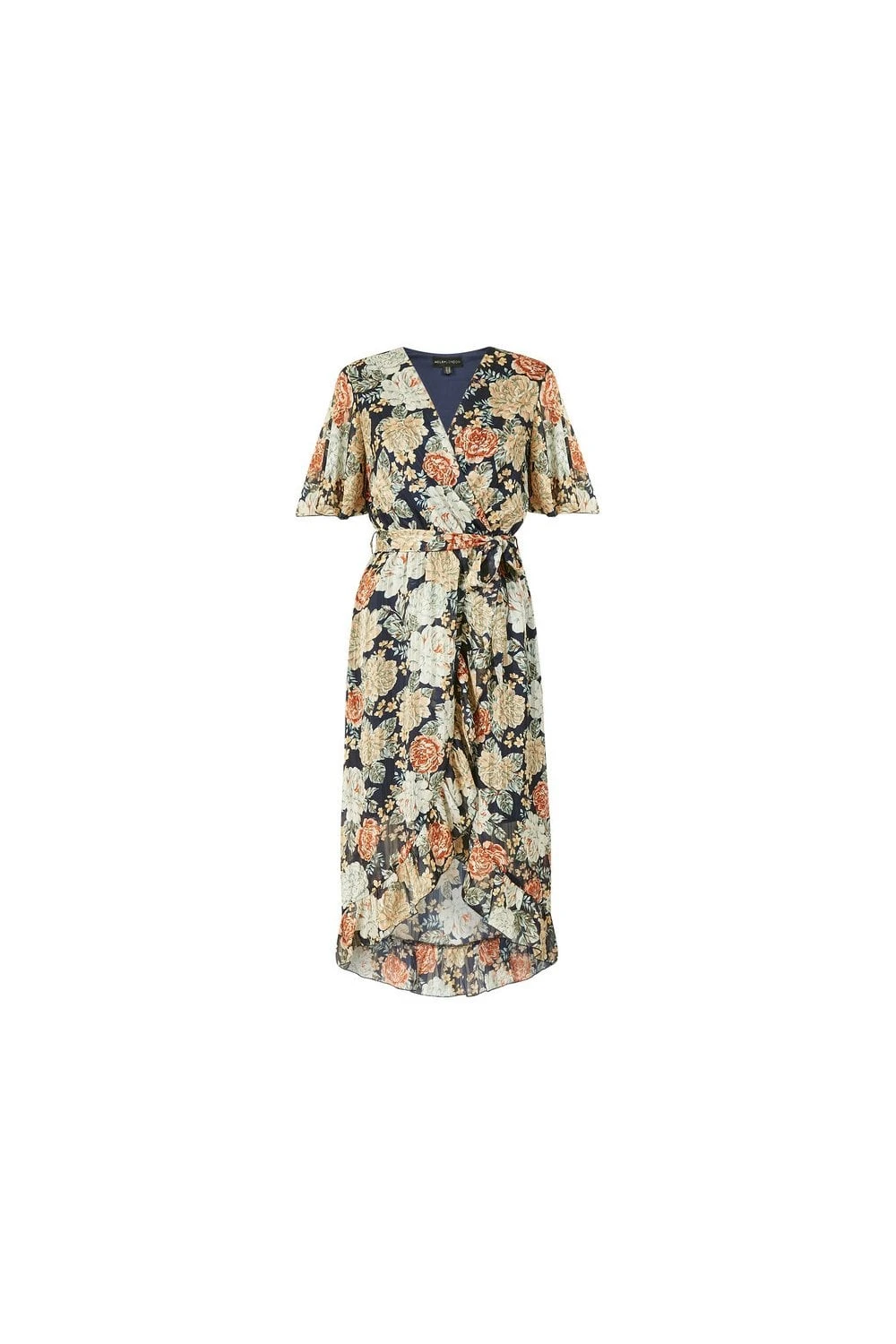 Refresh your partywear with this stunning Mela Floral Lurex Print Wrap Over Dress. This midi dress simply has it all – a gorgeous, timeless floral pattern, a glimmering, metallic lurex effect and a flattering wrap shape, complete with waterfall style hem and figure accentuating waist tie belt. Perfect for special ocassions, just pair with cream accessories.