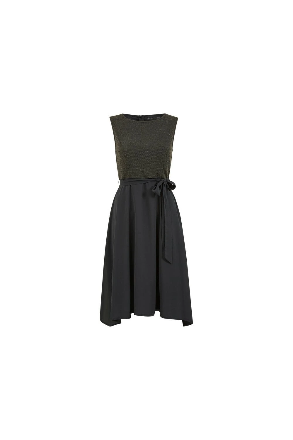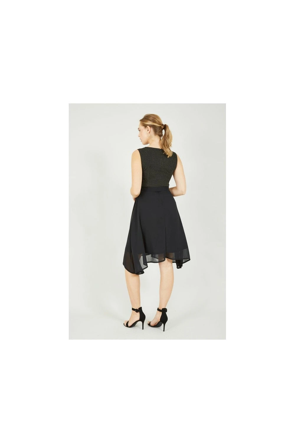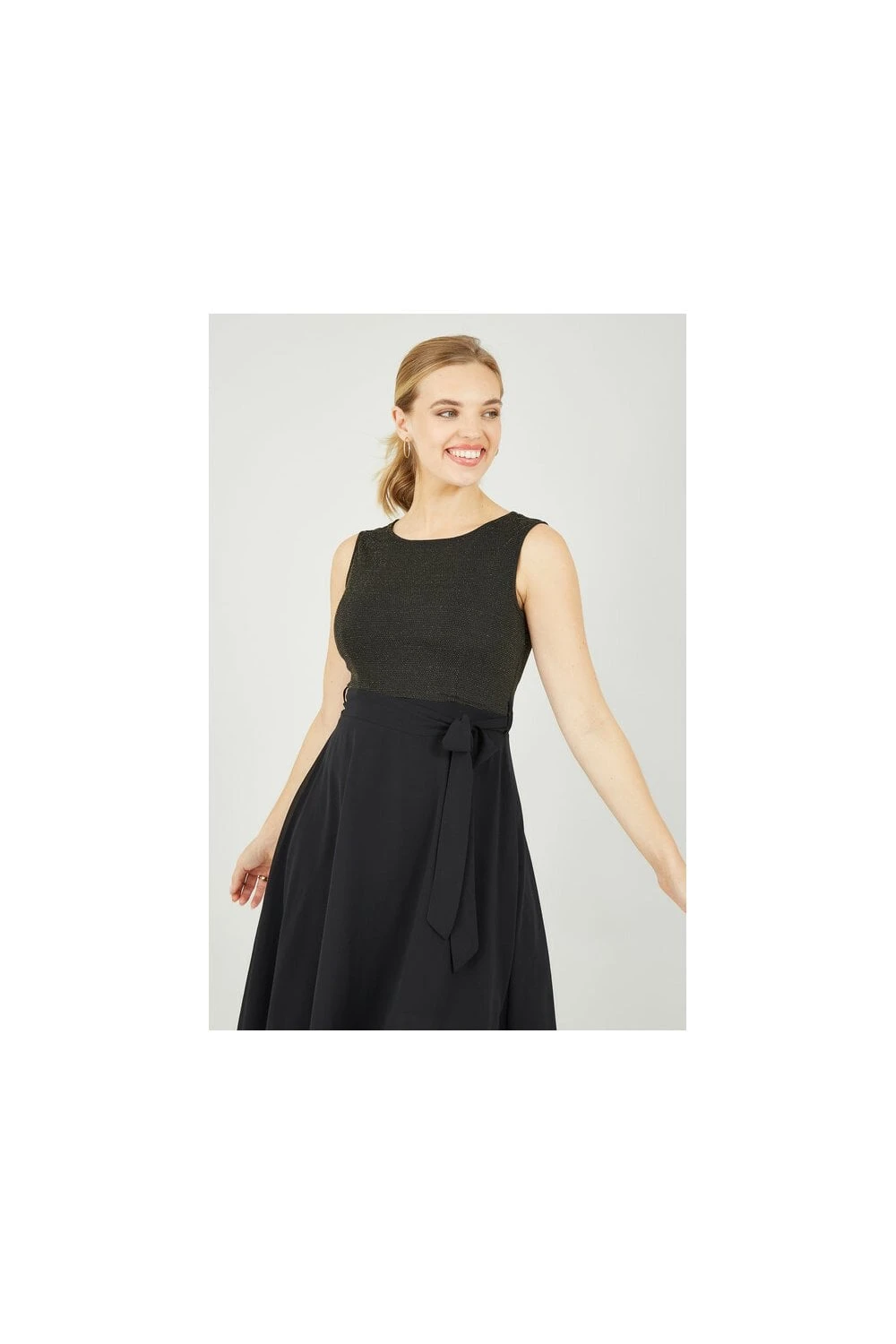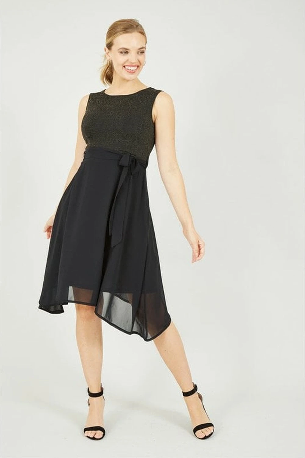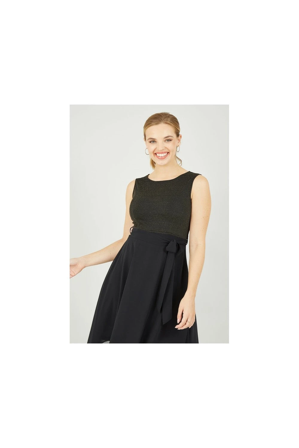 Elegant and flattering, this Mela Gold Sparkle Dress with Woven Skirt is the perfect piece to elevate your partywear. Features a gorgeous woven crescent skirt, a subtle, sparkly top, a flattering waist tie belt and zip fastening to the back. A timeless occasion fit, perfect matched with strappy black heels and a mini clutch.