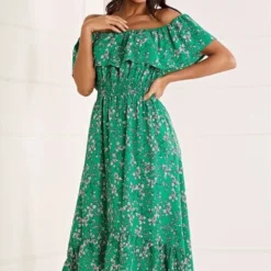 In the print that channels sunnier days, opt for this Mela Bardot Asymmetric Maxi Dress. Featuring an off-the-shoulder neckline decorated with ruffles, it’s styled with a full-length asymmetric hemline. The light fabric tapers at the waist to show off your curves, whilst the ditsy floral print is on-trend for the seasons ahead. Style it with strappy heels for those all-important events.