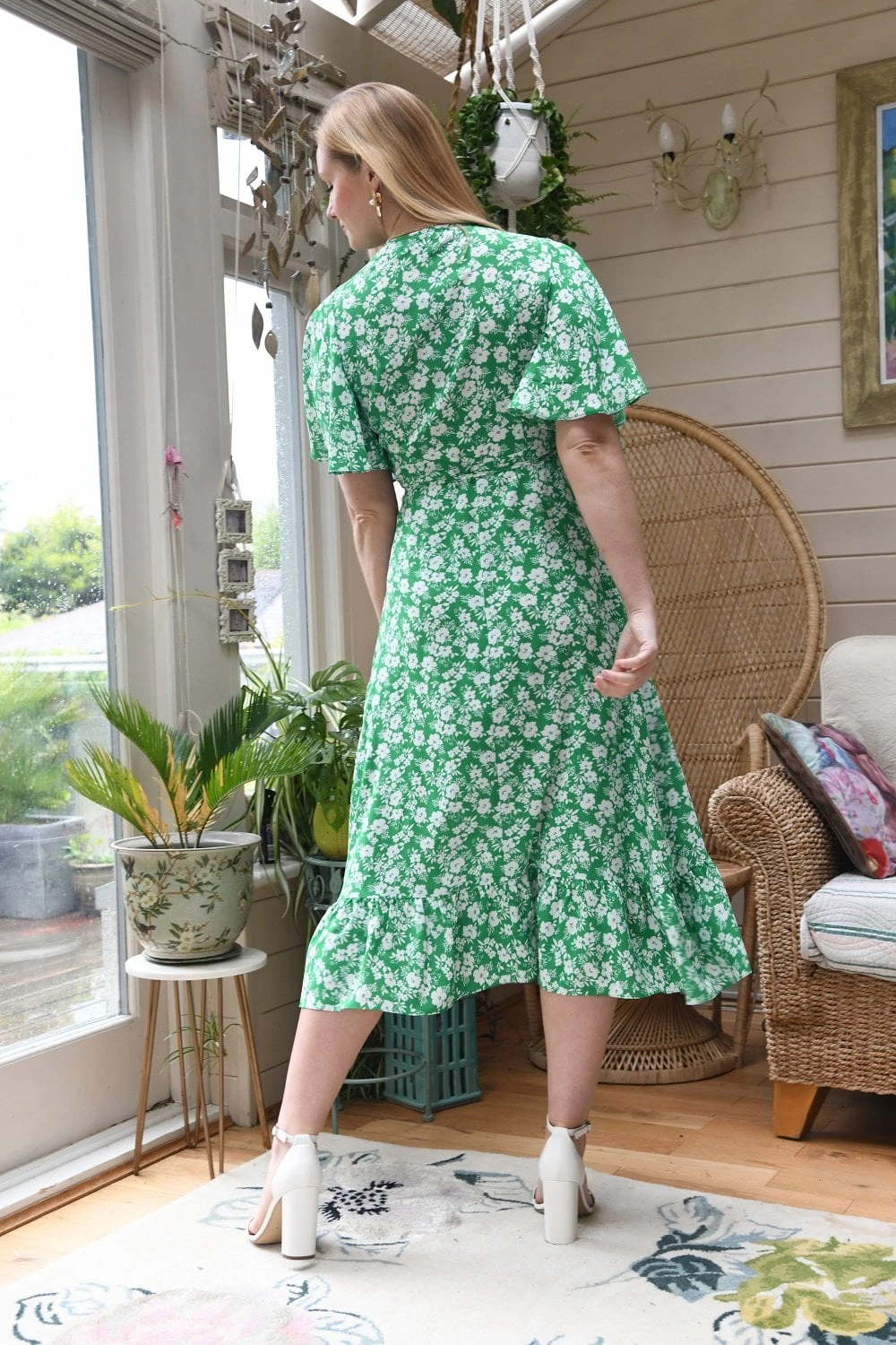 We love a versatile dress than can do it all, add trainers to keep in casual, or chunky heels to dress it up, The Mela Green Ditsy Daisy Wrap Effect Frill Dress has you covered for anything! The flirty hemline has double ruffles to add movement, and the wrap effect neckline is topped with a frilly short sleeve. All wrapped up in that cute micro daisy print!