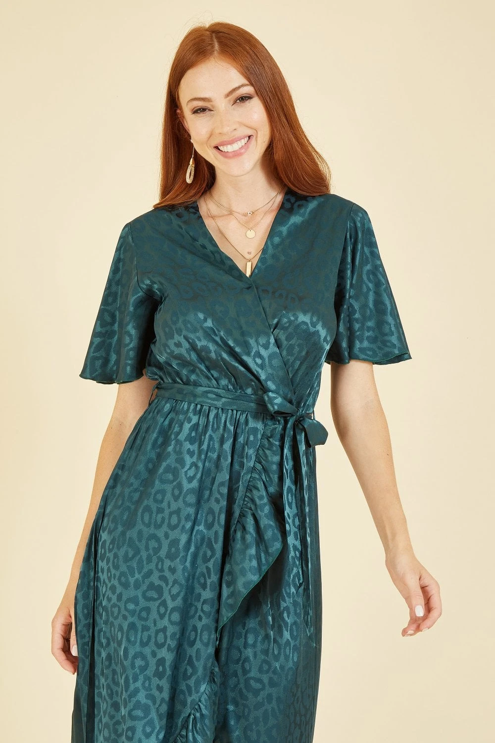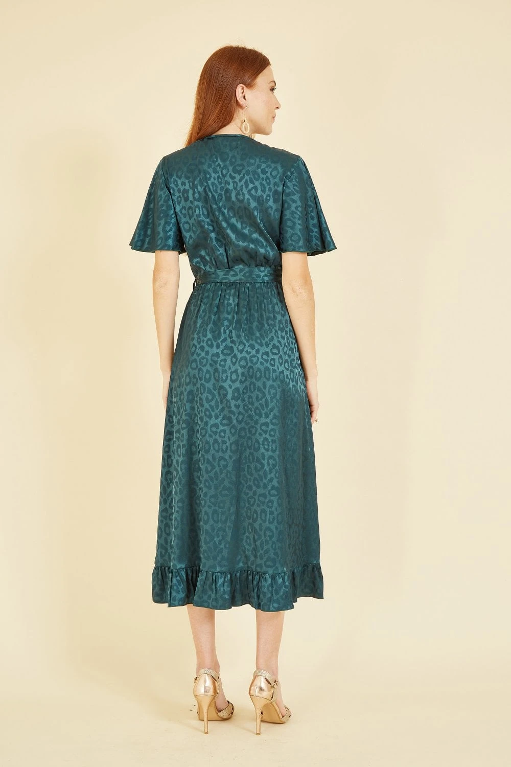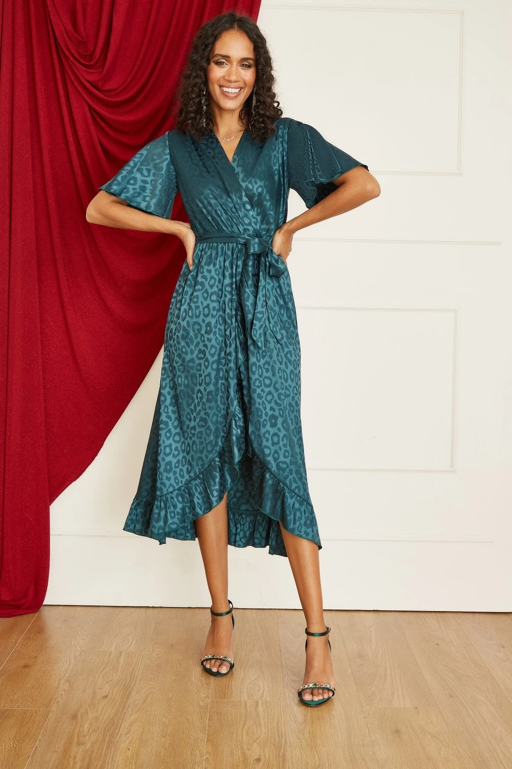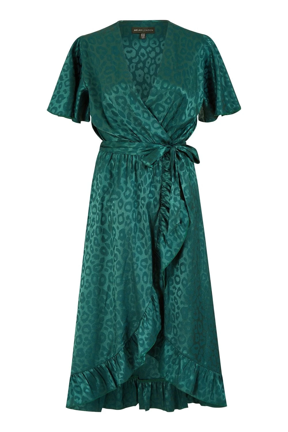 All wrapped up in dazzling satin, this leopard print jacquard fabric is the perfect twist on the classic wrap dress. With floaty sleeves and frill detailed hemline, you’ll feel a million dollars wearing this piece to any occasion. The midi length is perfect for showing off your favourite heels and the wrap around v-neckline will show off gold jewellery perfectly.