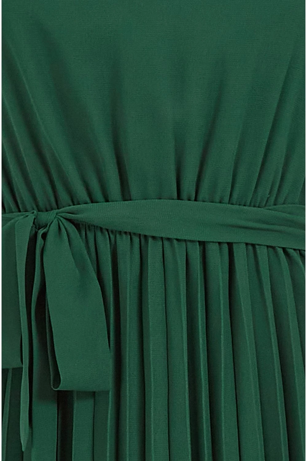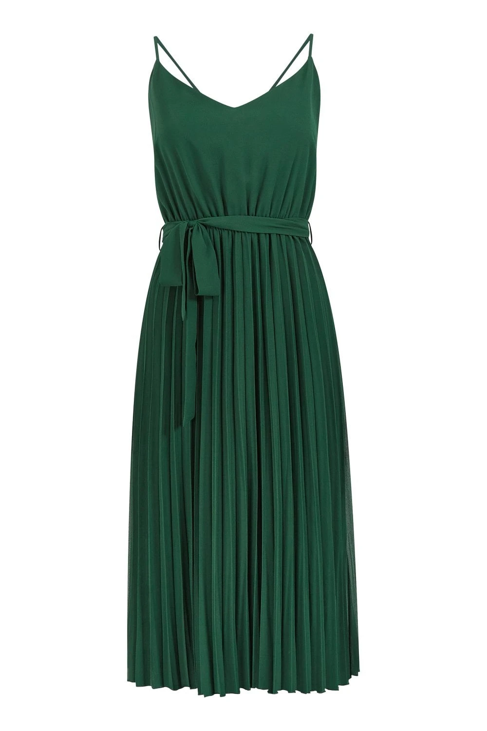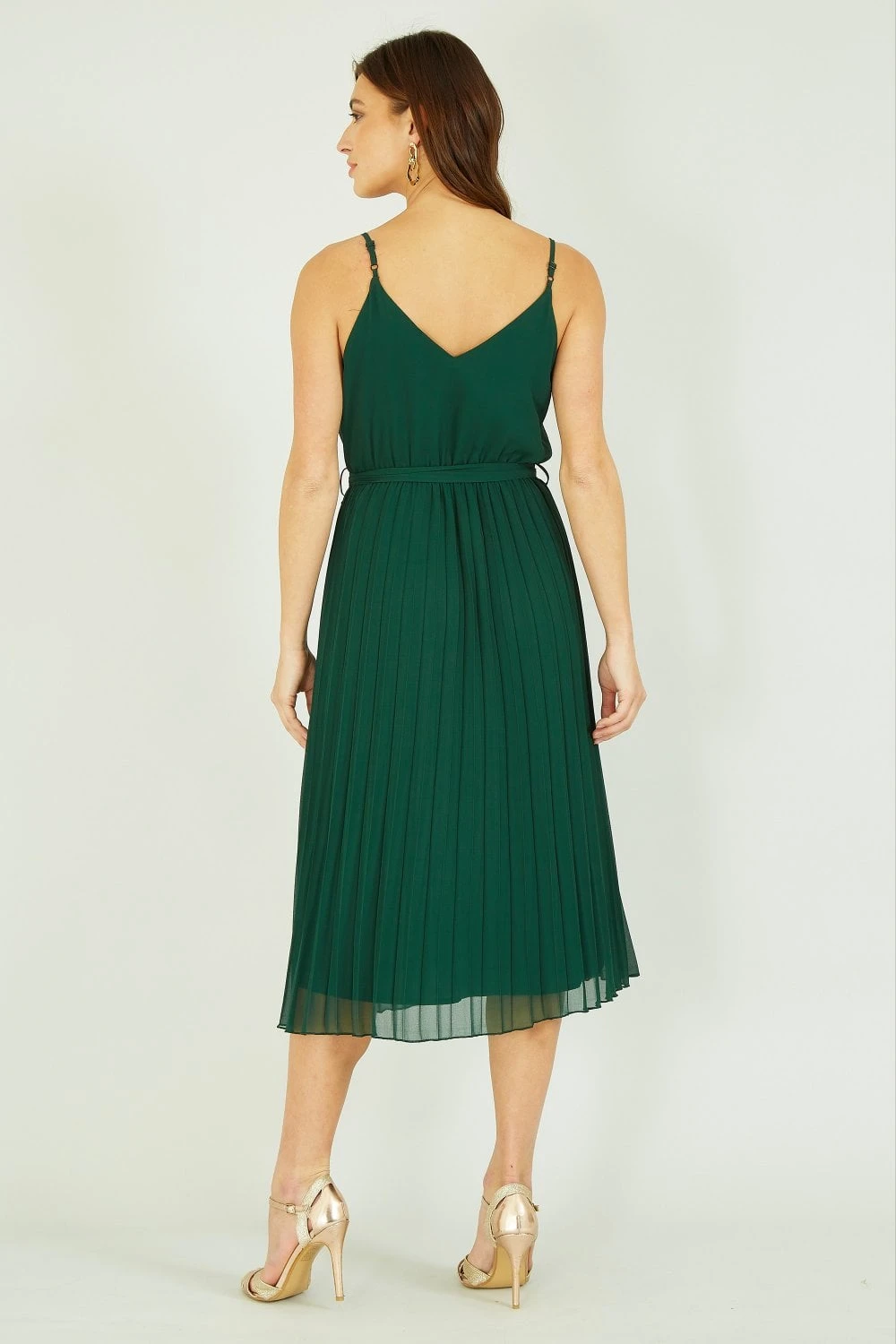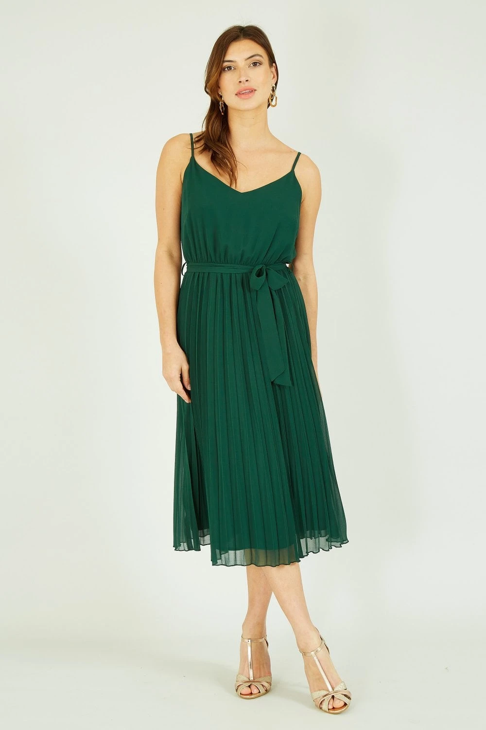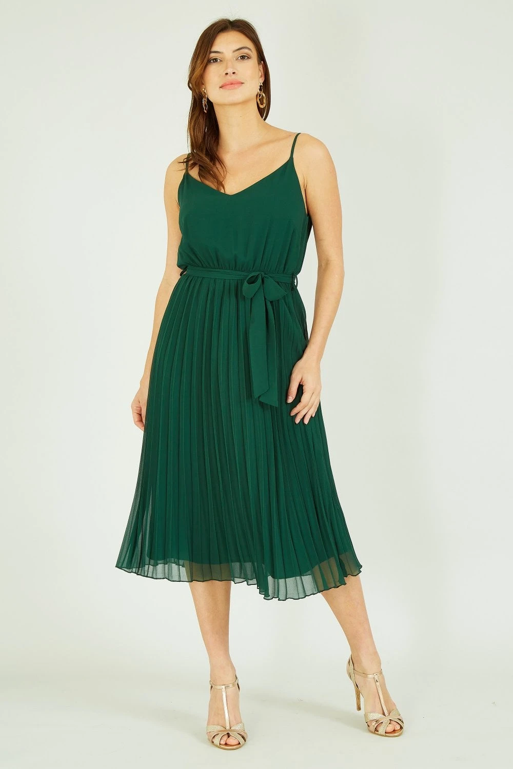 The perfect partner for parties, this dress from Mela sure to have you feeling like a million dollars. The midi length skirt is enhanced with pleats in a rich shade of green. The strappy v neckline balances the shape and the tie waist highlights the silhouette. Wear with sandals and gold jewellery for opulent style.