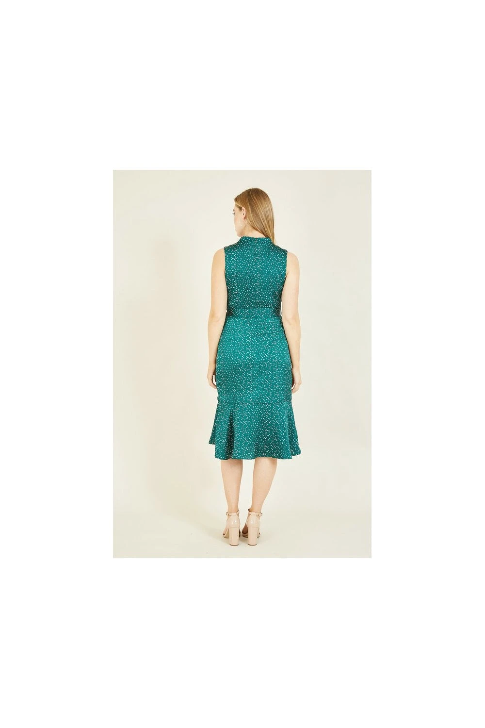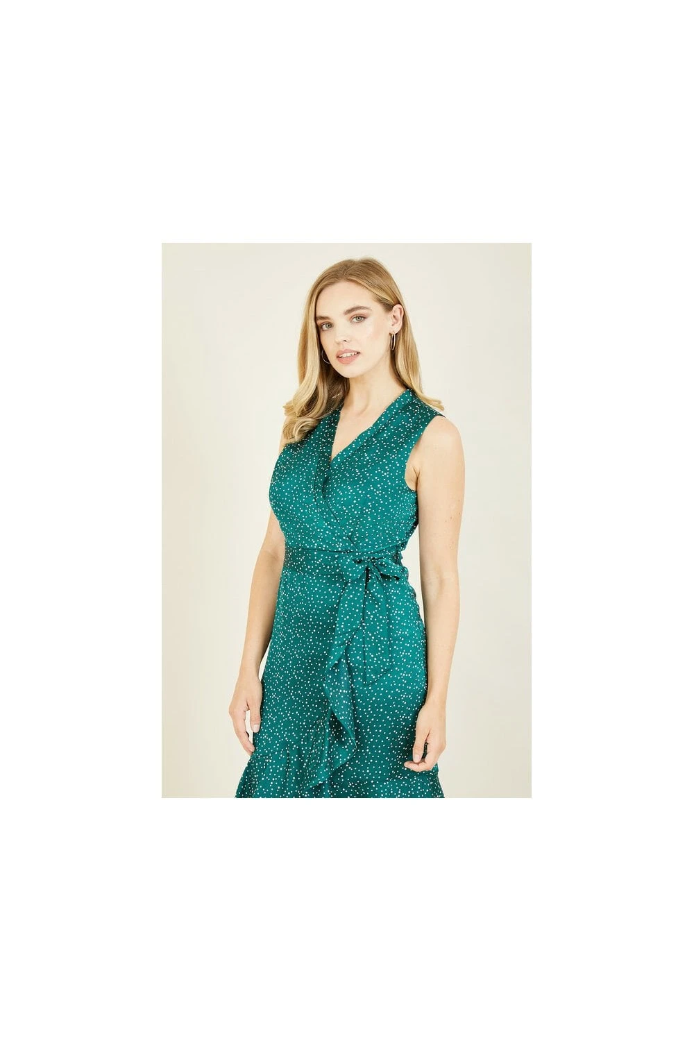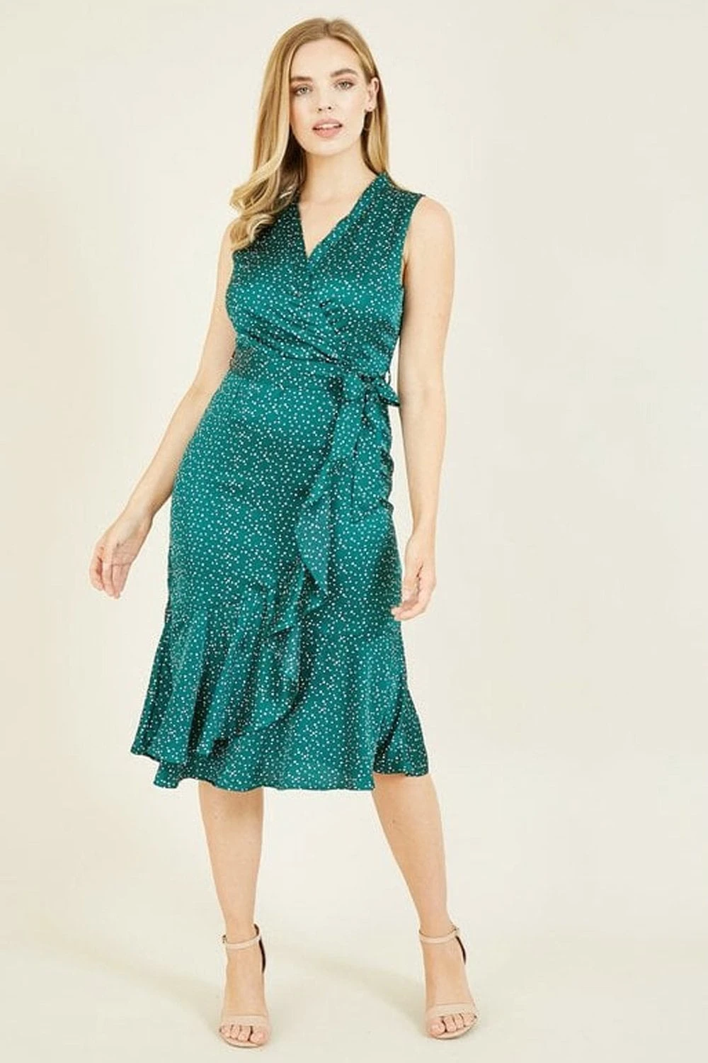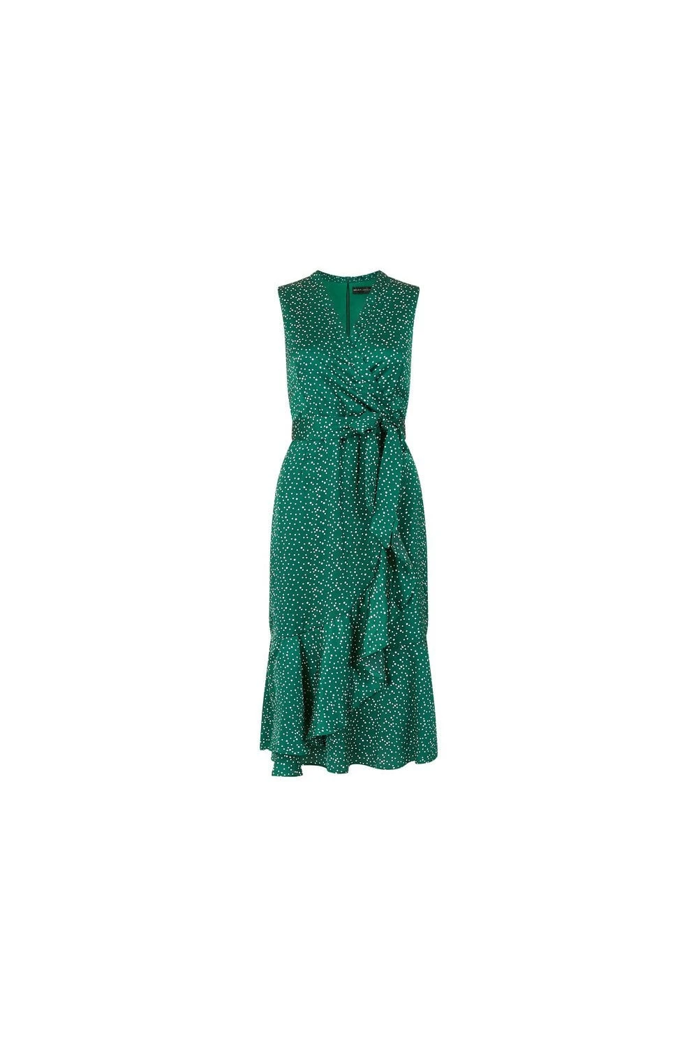 Look gorgeous in green. This Mela Green Spot Wrap Over Midi Dress oozes class. Ideal workwear that can be easily repurposed for date nights or a cute weekend fit. Features a flattering wrap around cut with frill detail, all over polka dot print and sleeveless cut.