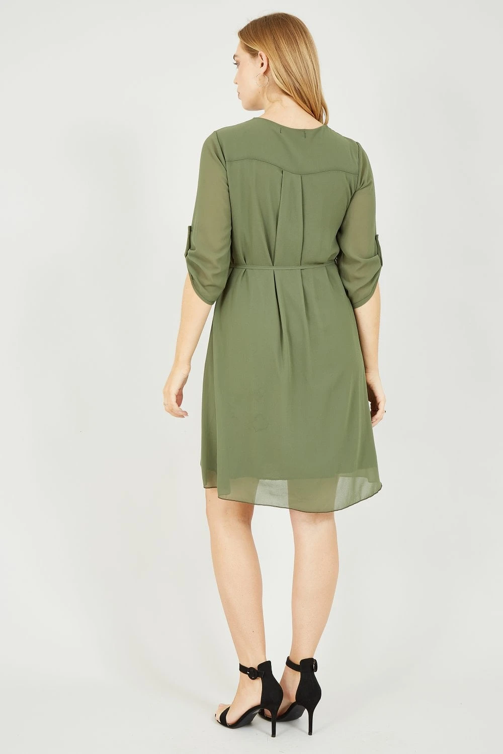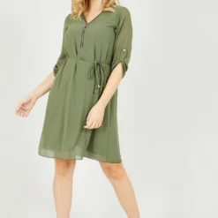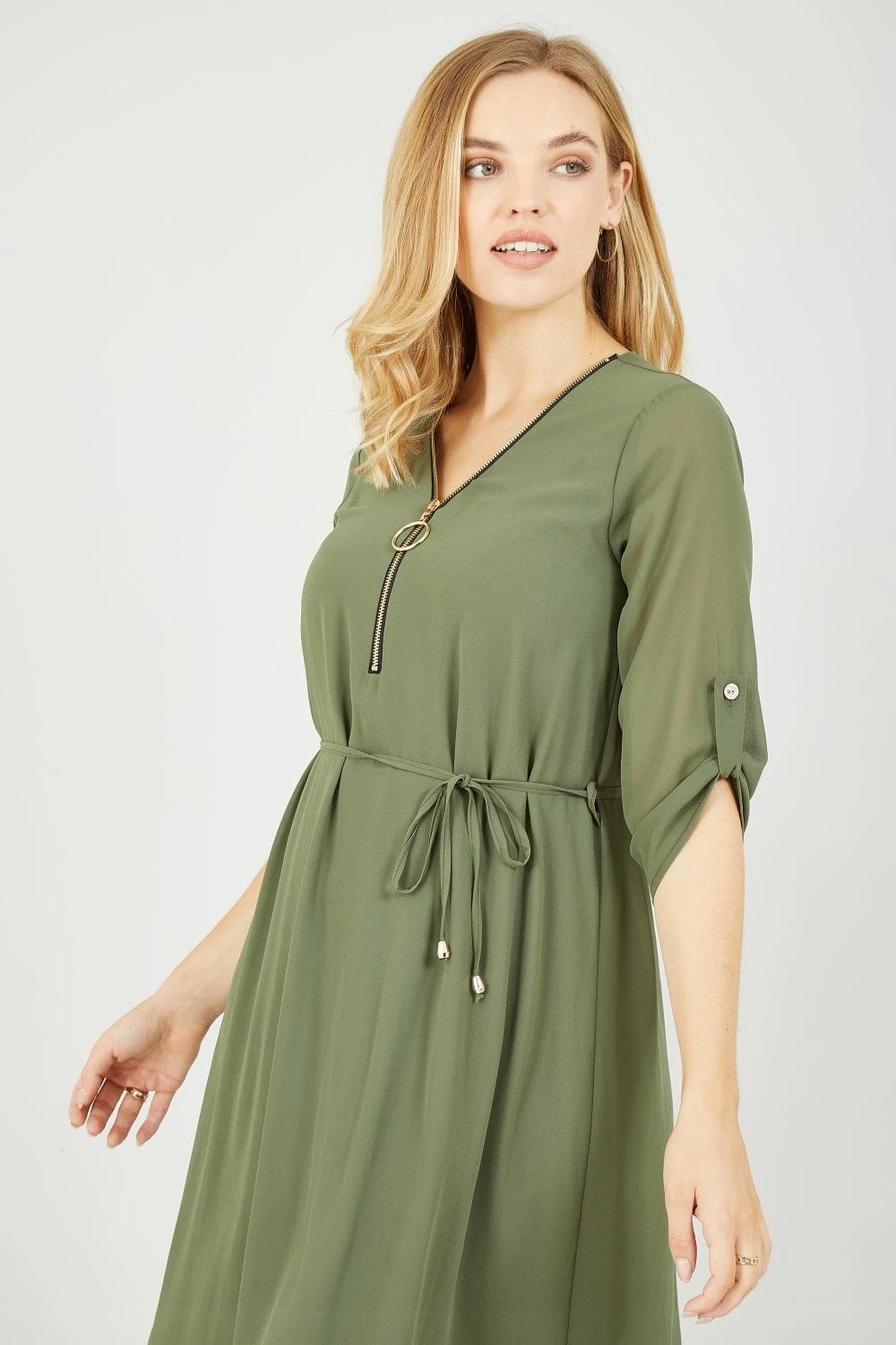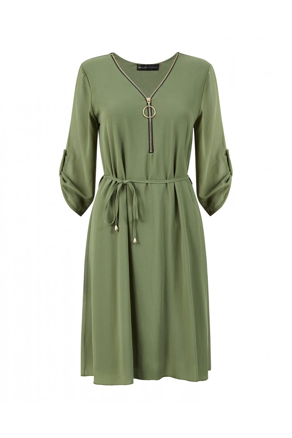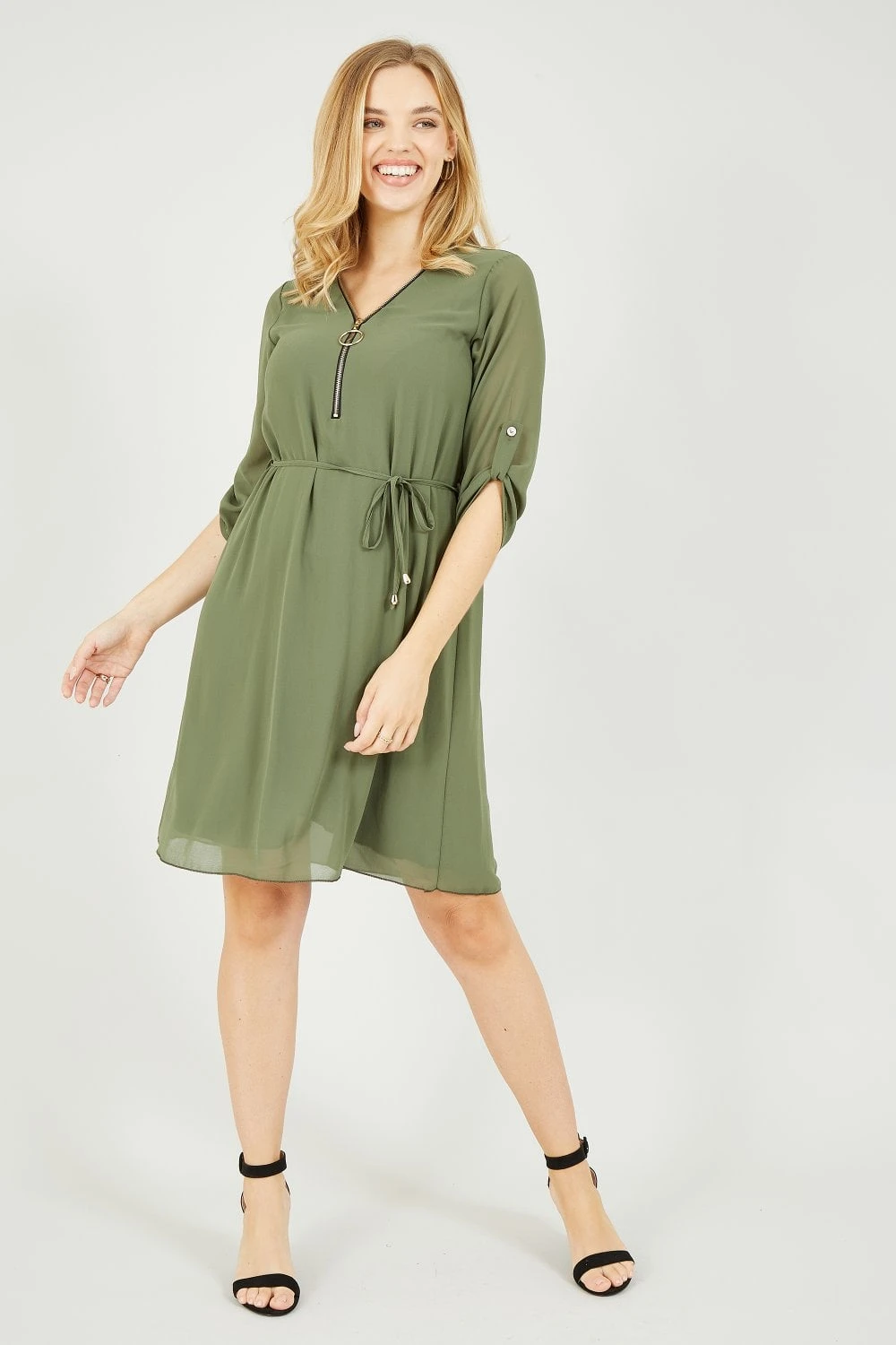 Step out in style in this stunning Mela Khaki Green Zip Detail Tunic Dress. This dress is all about the detail – from the black and gold zip front detail with pull ring, to the adjustable sleeves and flattering self-tie waist belt. Pair with ankle boots and gold and black accessories to complete the look.