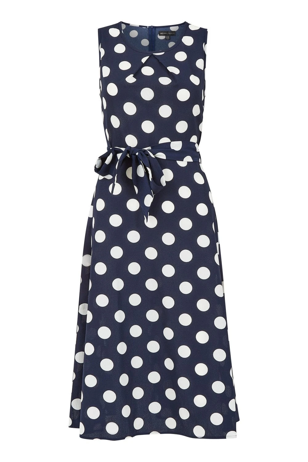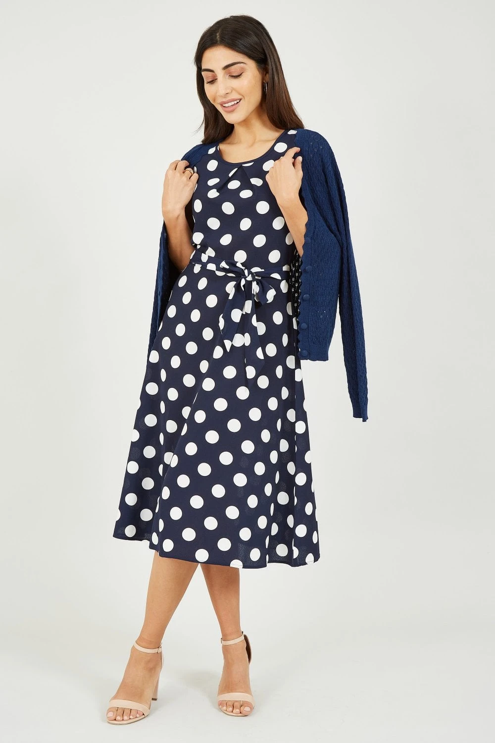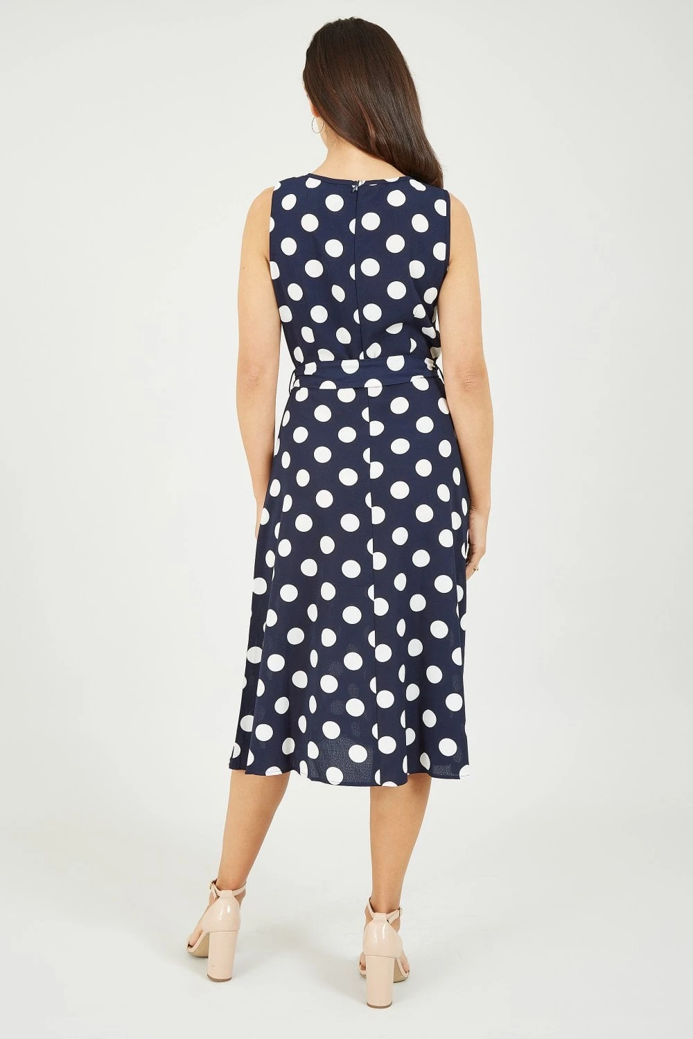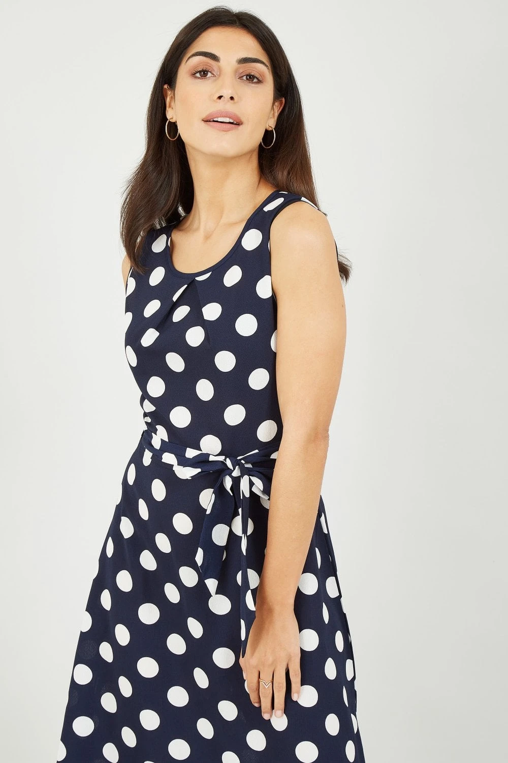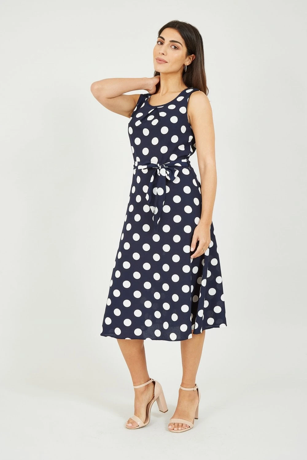 Meet the dress ready to take the number one spot in your summer wardrobe. Between the midi length, classic polka dot print and tie waist, this skater dress will see you through this season. The Mela Polka Dot Sleeveless Midi Dress in navy is perfect for any event, pair it with heels in a neutral shade, or trainers and a denim jacket for a relaxed day time fit.