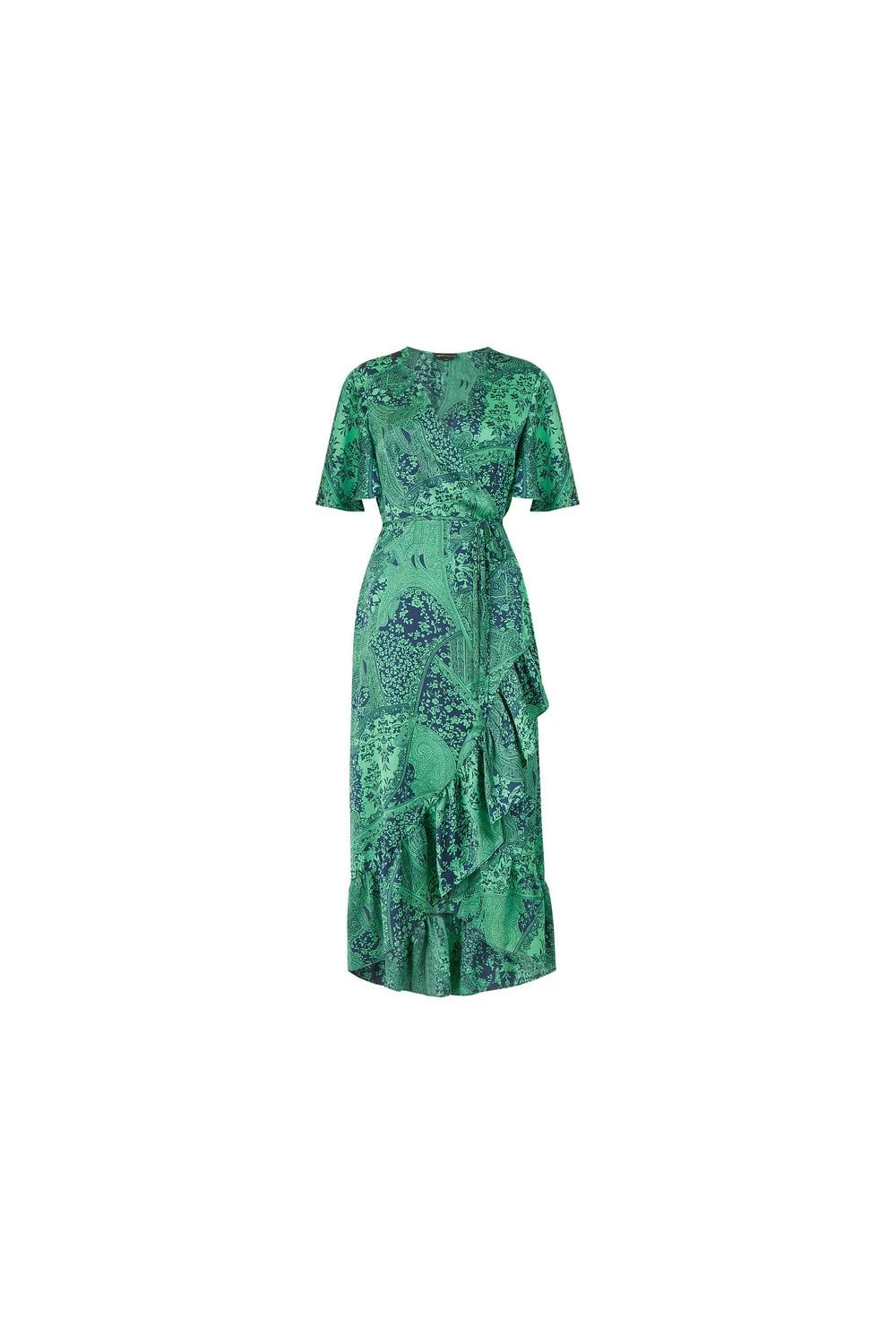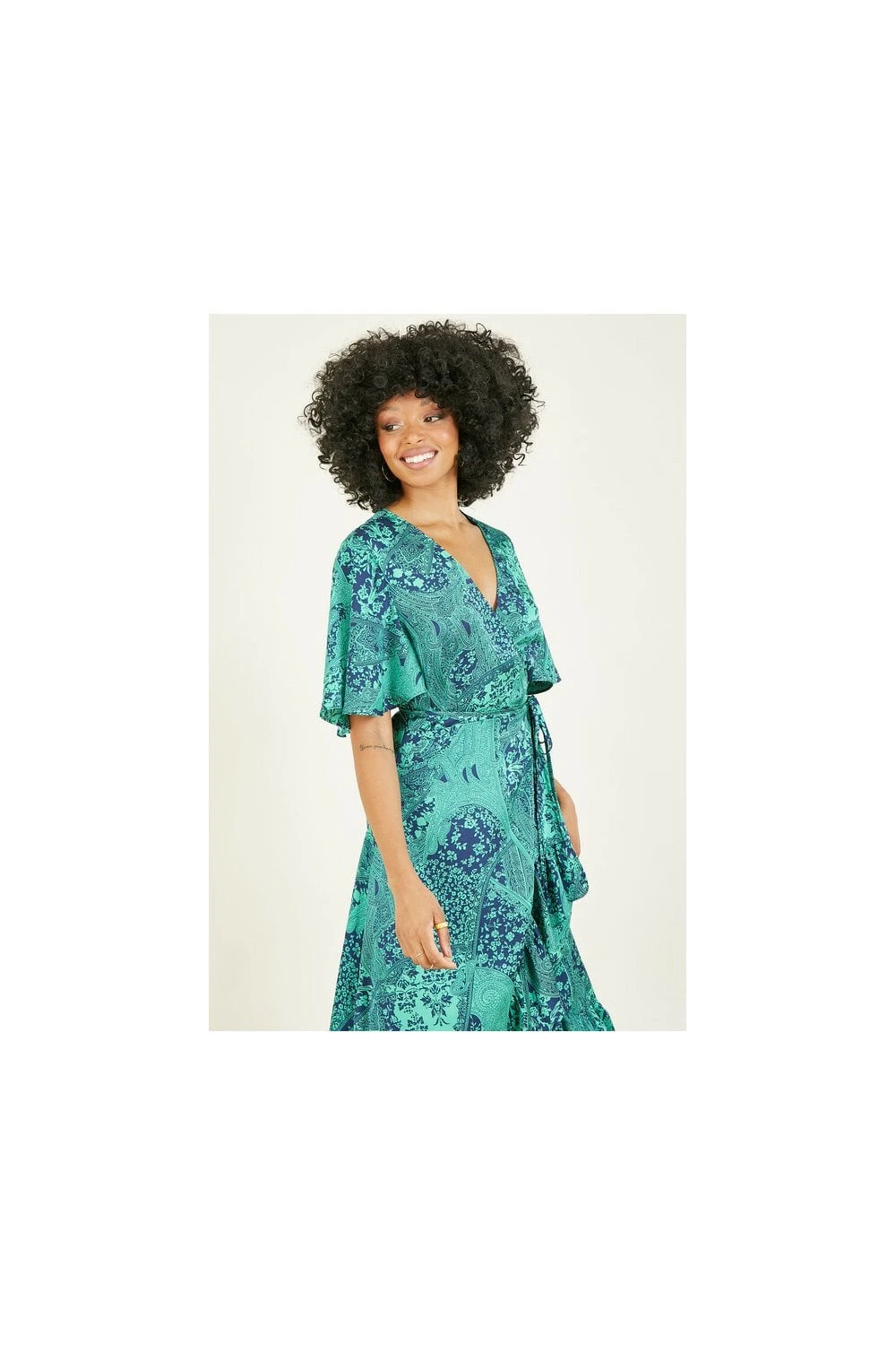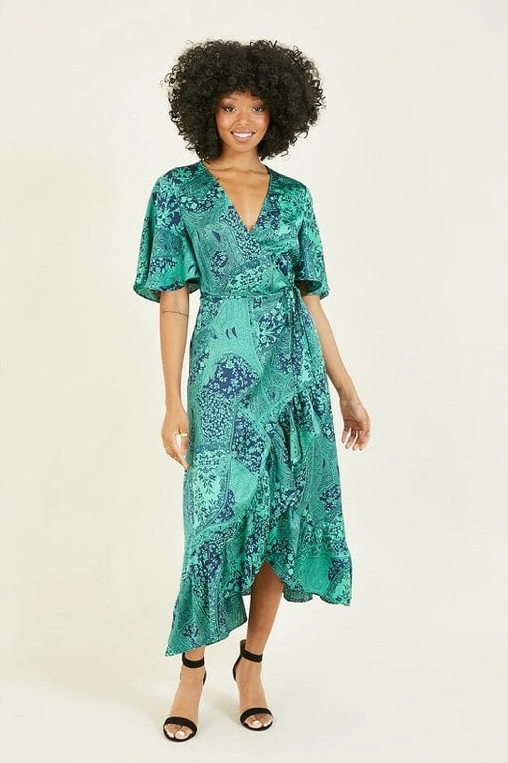 Up your glam game in this wrap midi dress. Featuring a gorgeous blue and green paisley scarf print, ruffled dipped hem detailing and a flattering v neck cut. Perfect for special occasions.