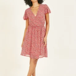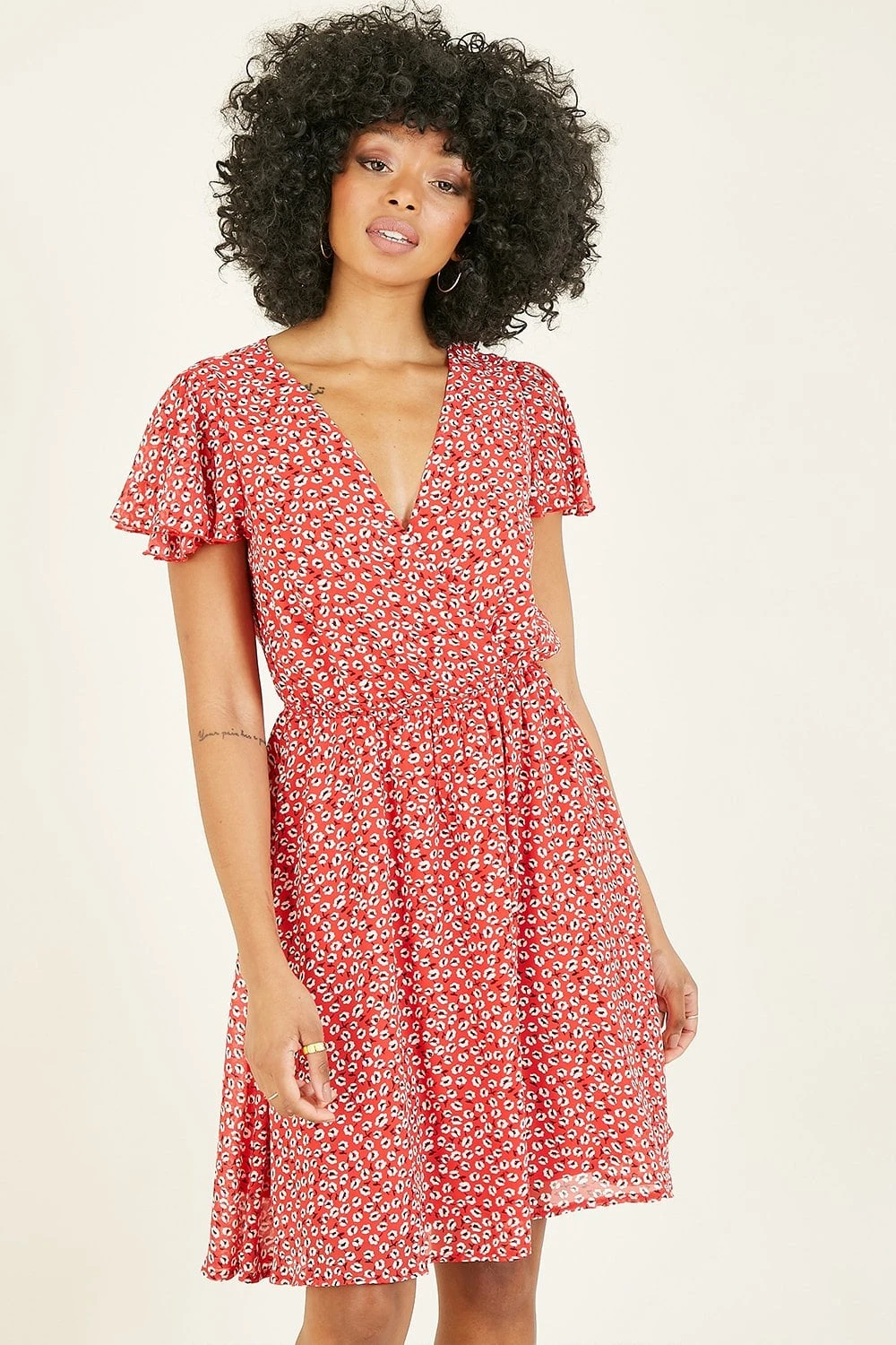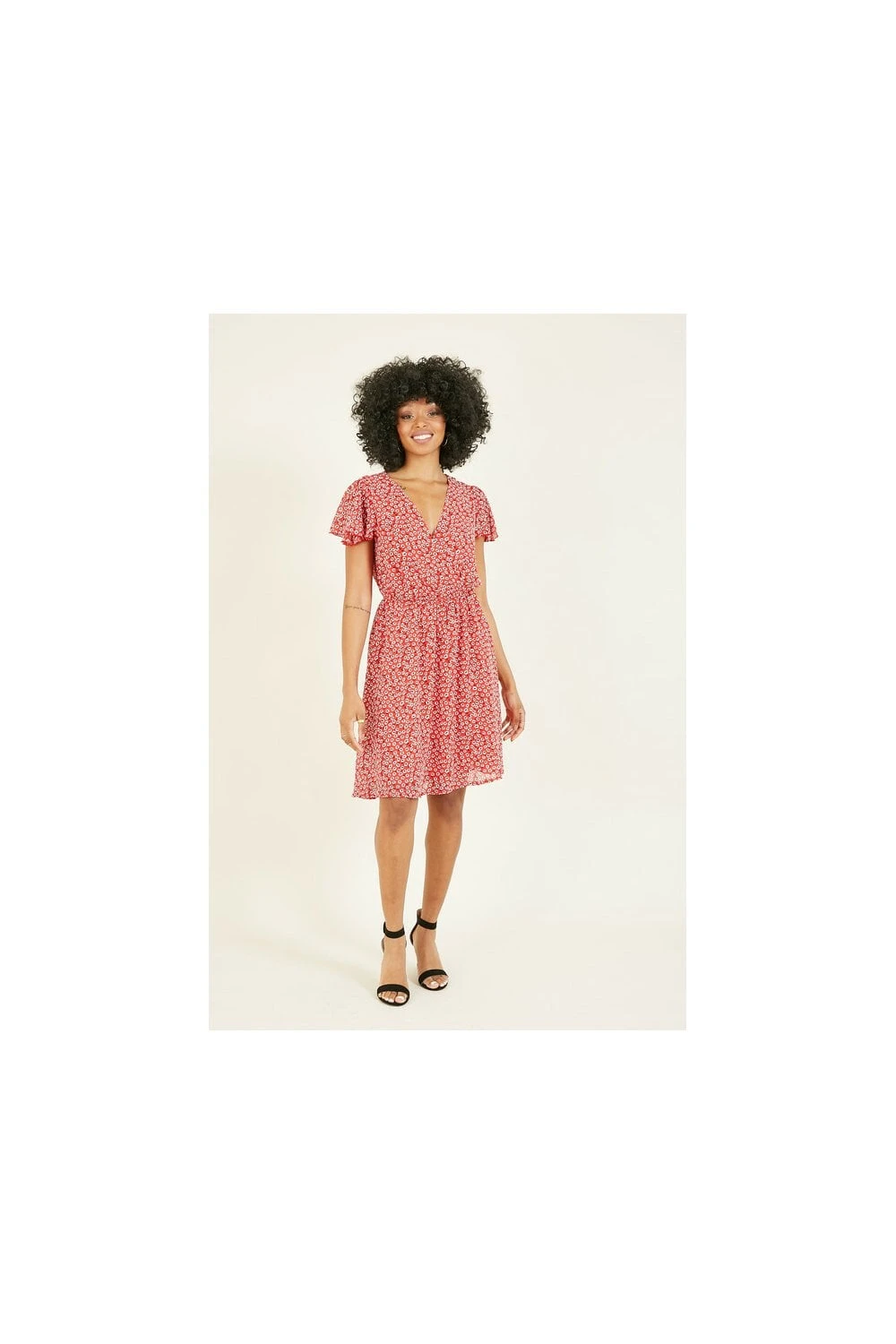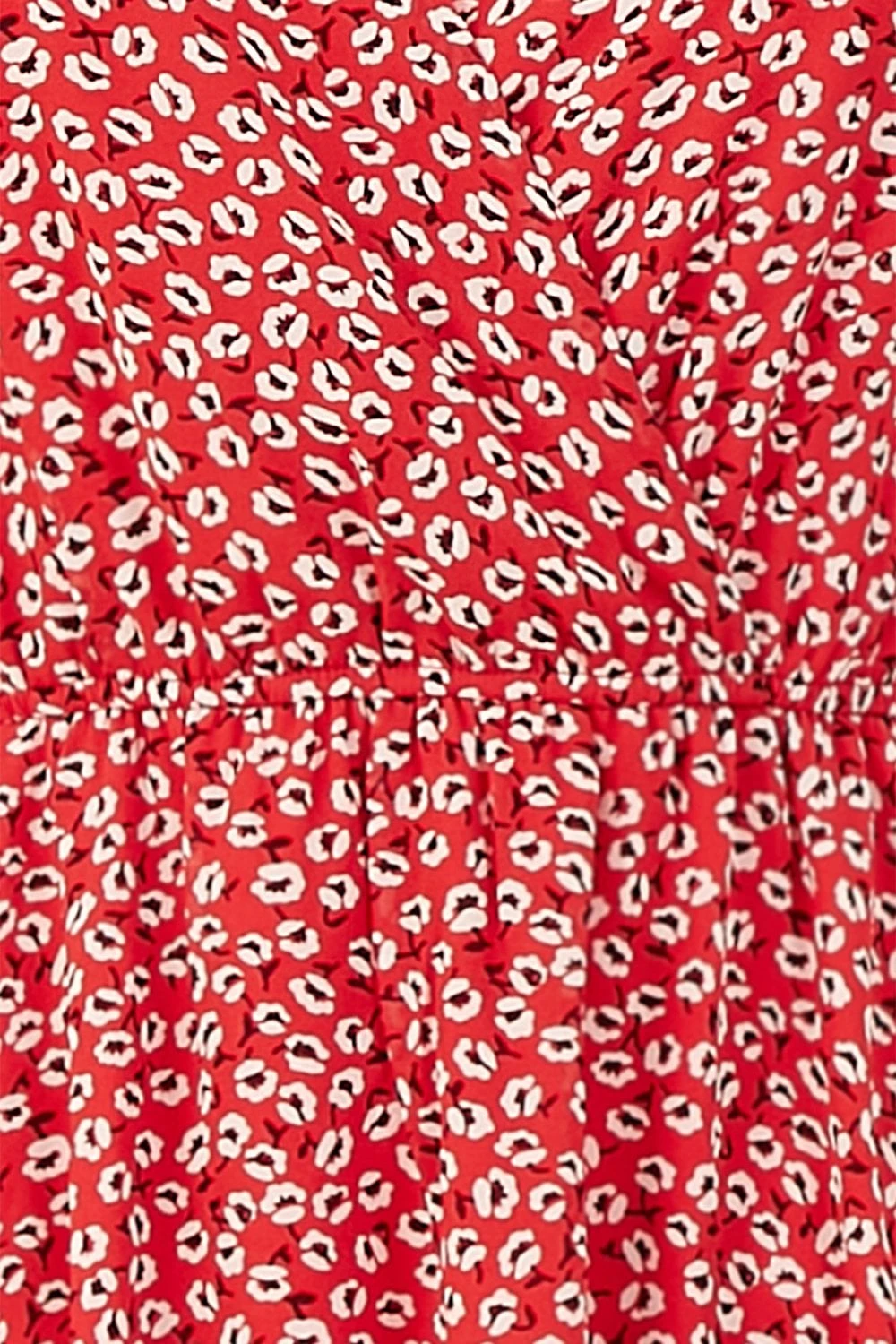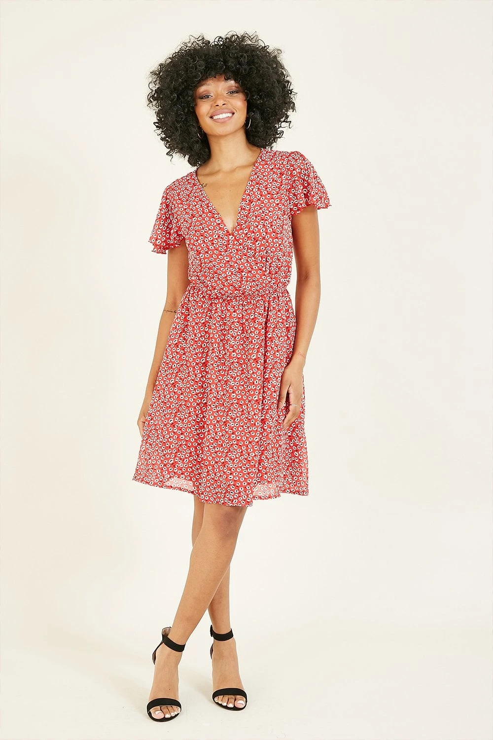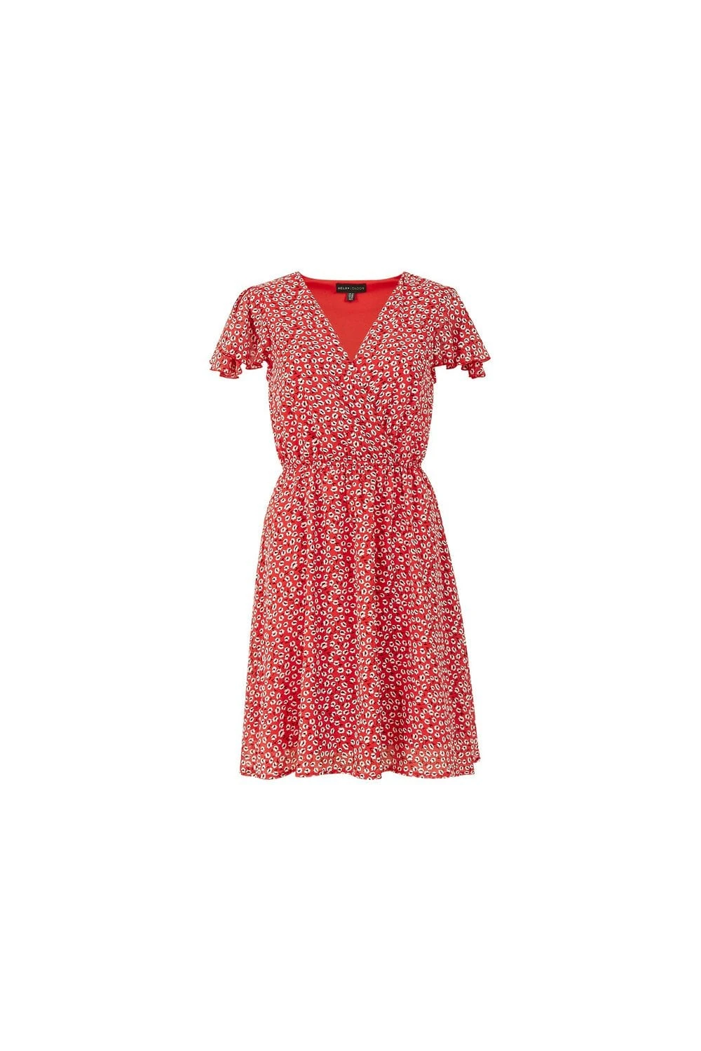 The dress your wardrobe won’t tire of. Bright and bold, this all over distry floral printed dress comes in a stunning red and features a fitted waist and subtle frilled sleeves.