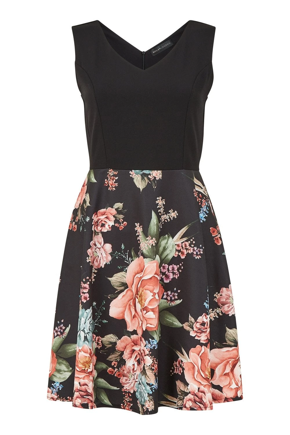 Sculpt your figure this season in this stunning Mela Two Tone V Neck Floral Dress. A timeless, flattering fit, this dress features a close-fit sleeveless v-neck top, with a floaty, floral contrast skirt. Perfect matched with ankle boots or strappy heels and a matching clutch.