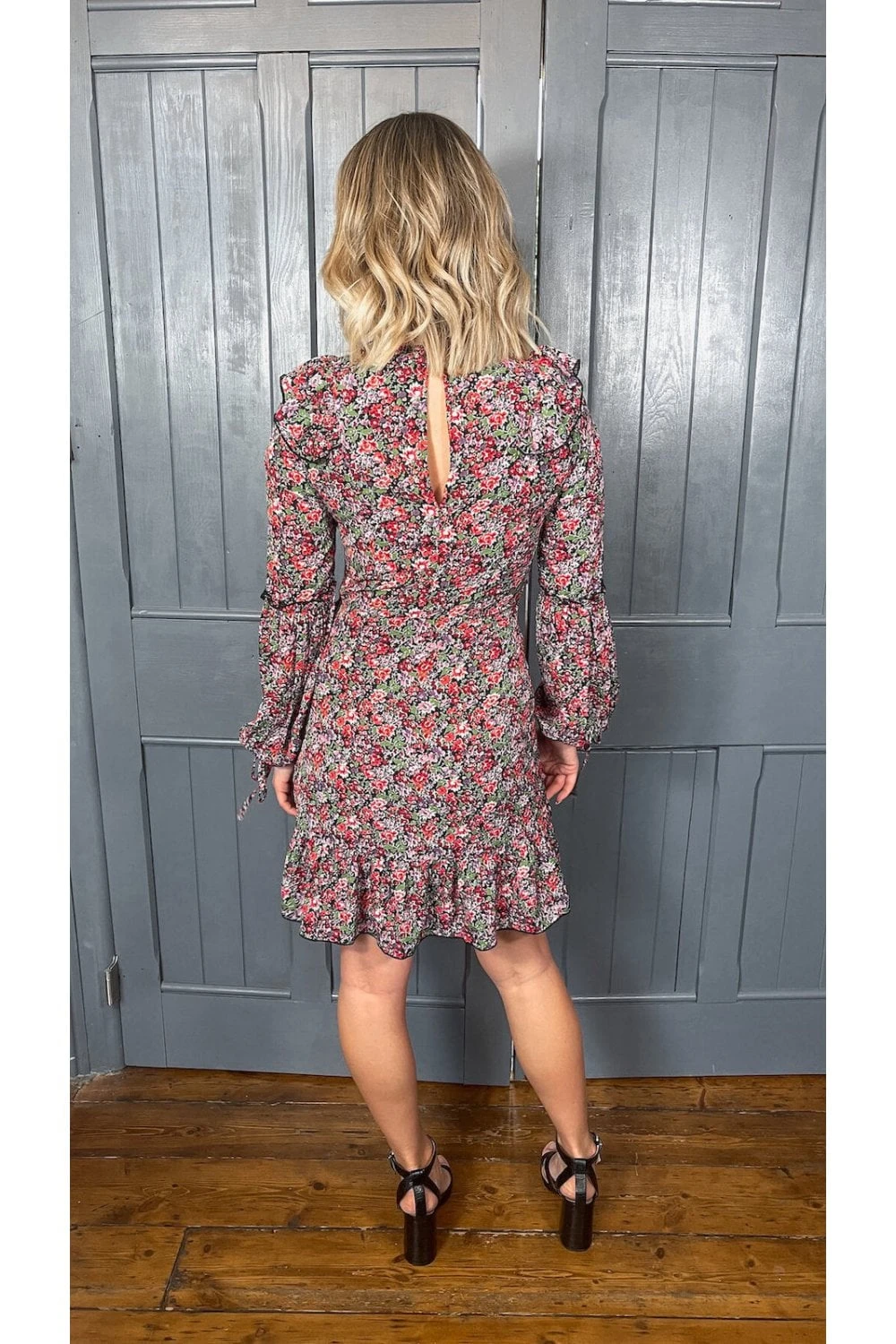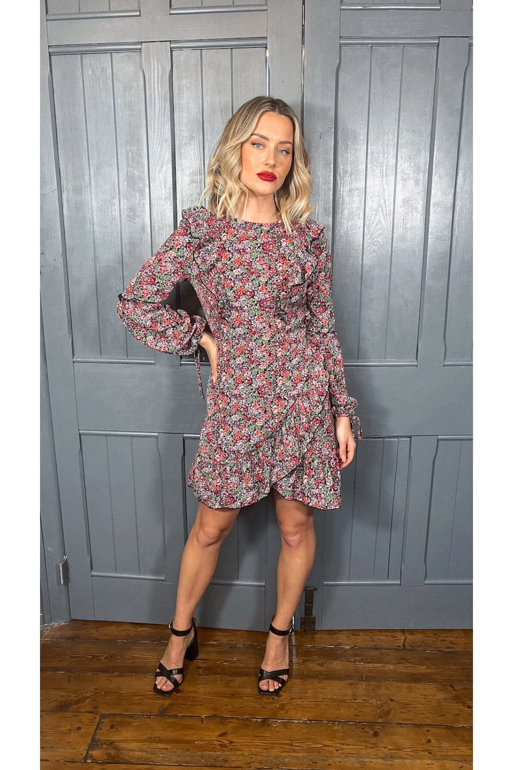 Red and pink multicoloured floral printed mini dress The perfect spring dress with long puff sleeves, ties on the cuff, a ruffle detail hem with wrap detailÂ