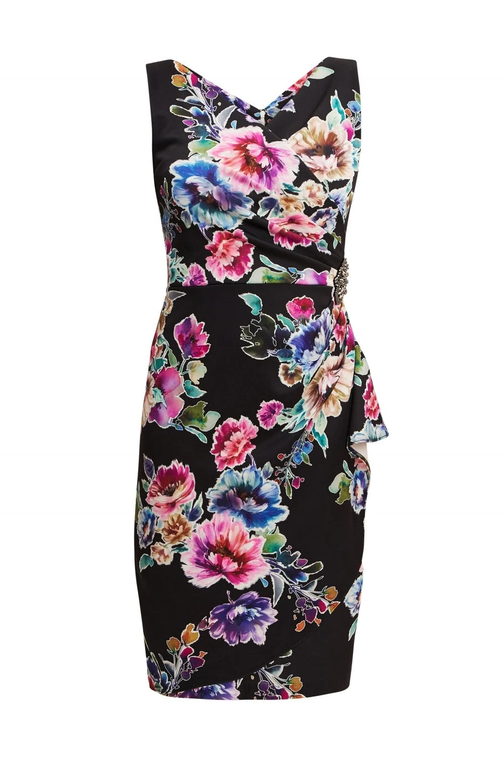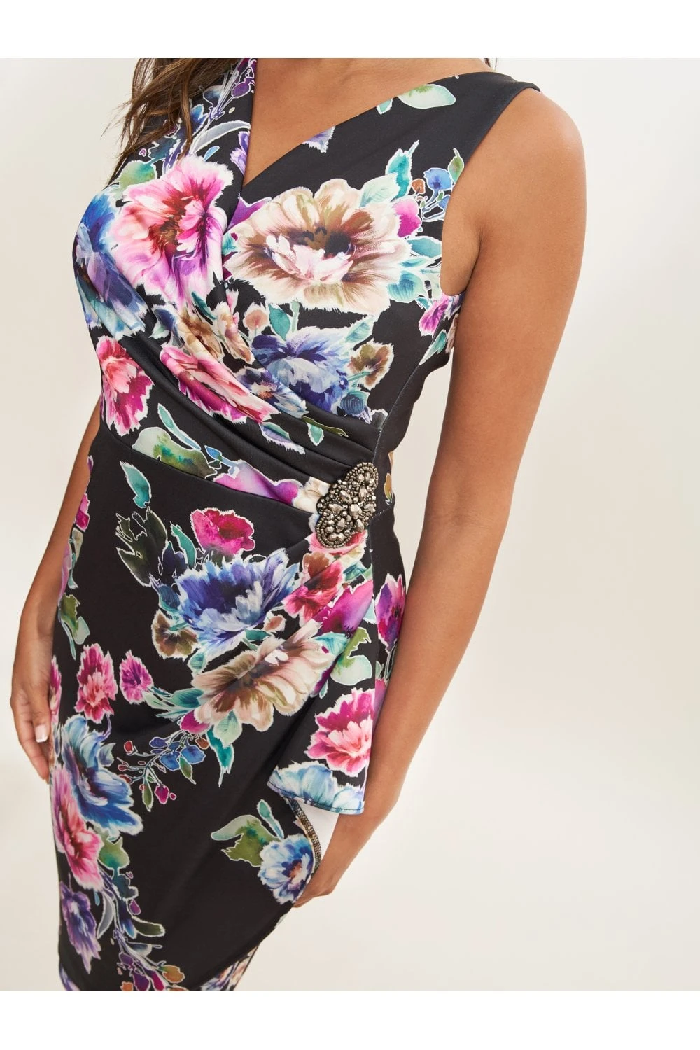 Classic Gina Bacconi wrap dress in a bright floral printed stretch fabric. With a embelished trim and waterfall frill this dress will be sure to wow! It features a centre back zip.
