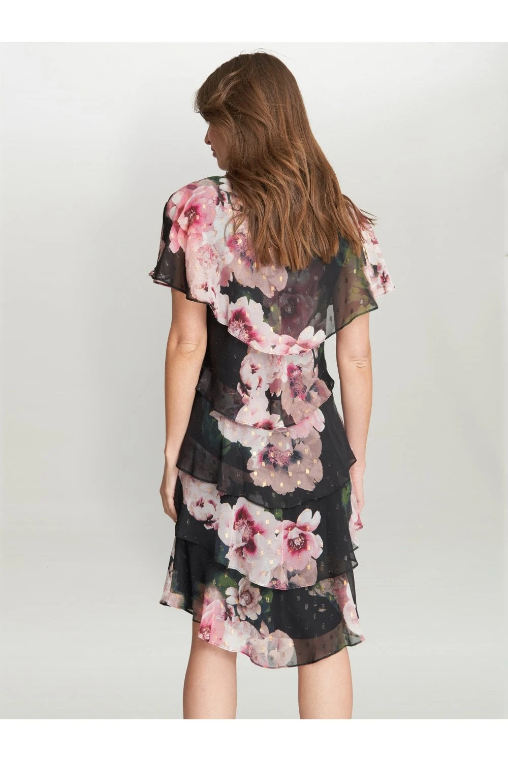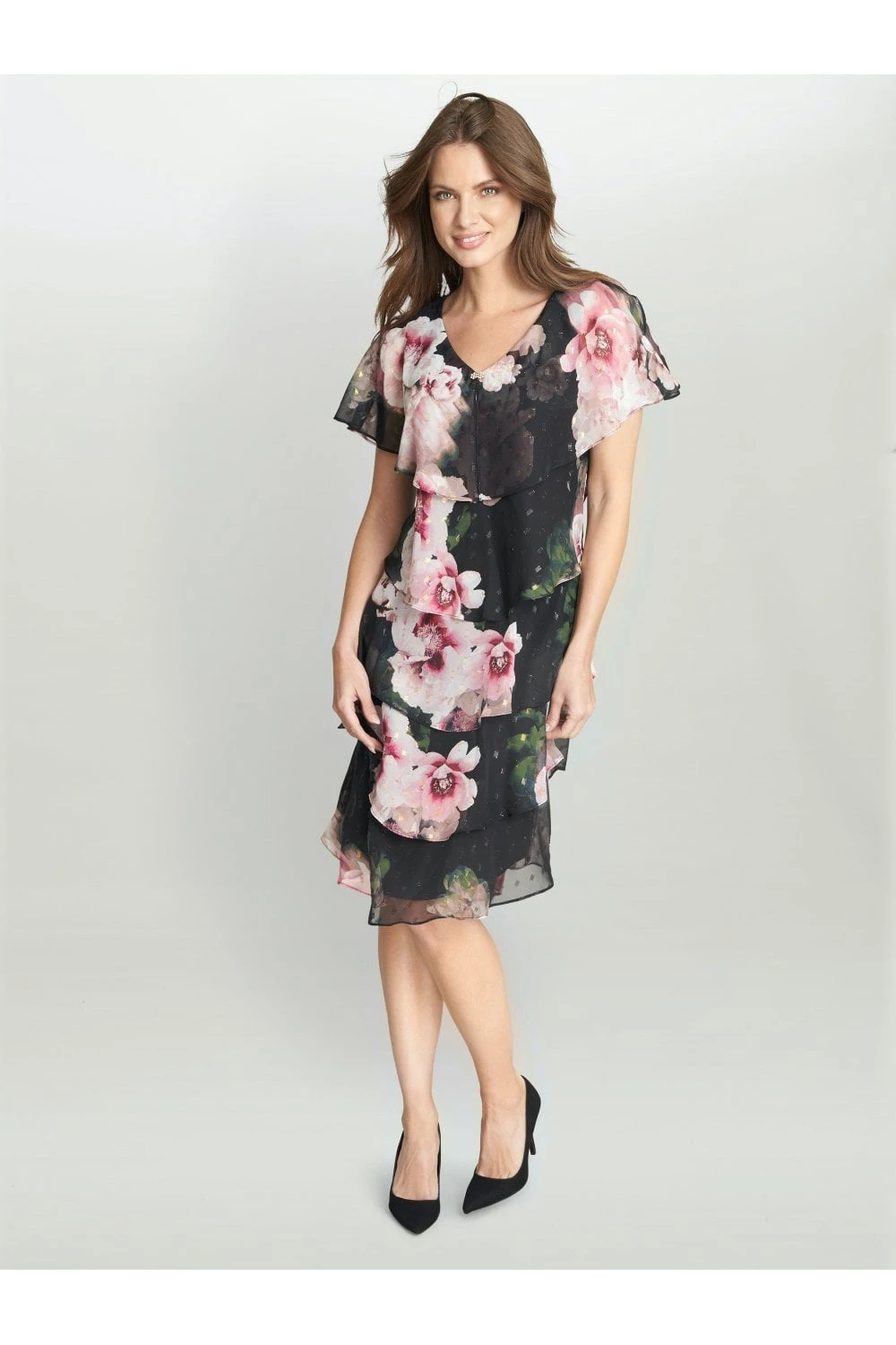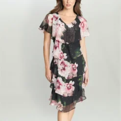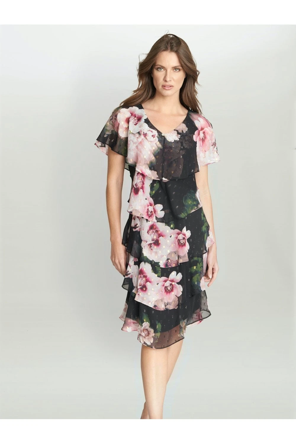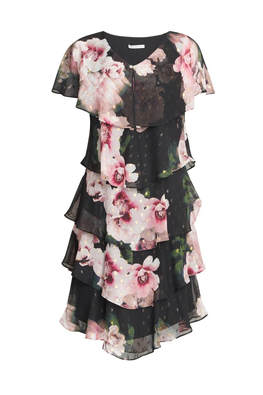 Feel wonderful in this floaty tiered cape dress by Gina Bacconi. This dress takes a modern and flattering shape in layered floral chiffon with diamante detailing at the neck. Perfect for an event, this piece offers both comfort and elegance.