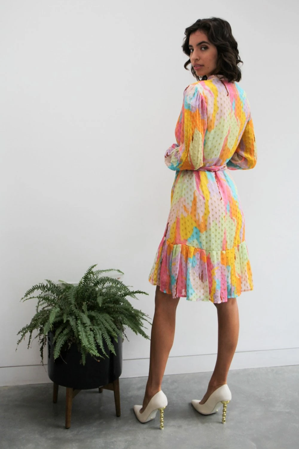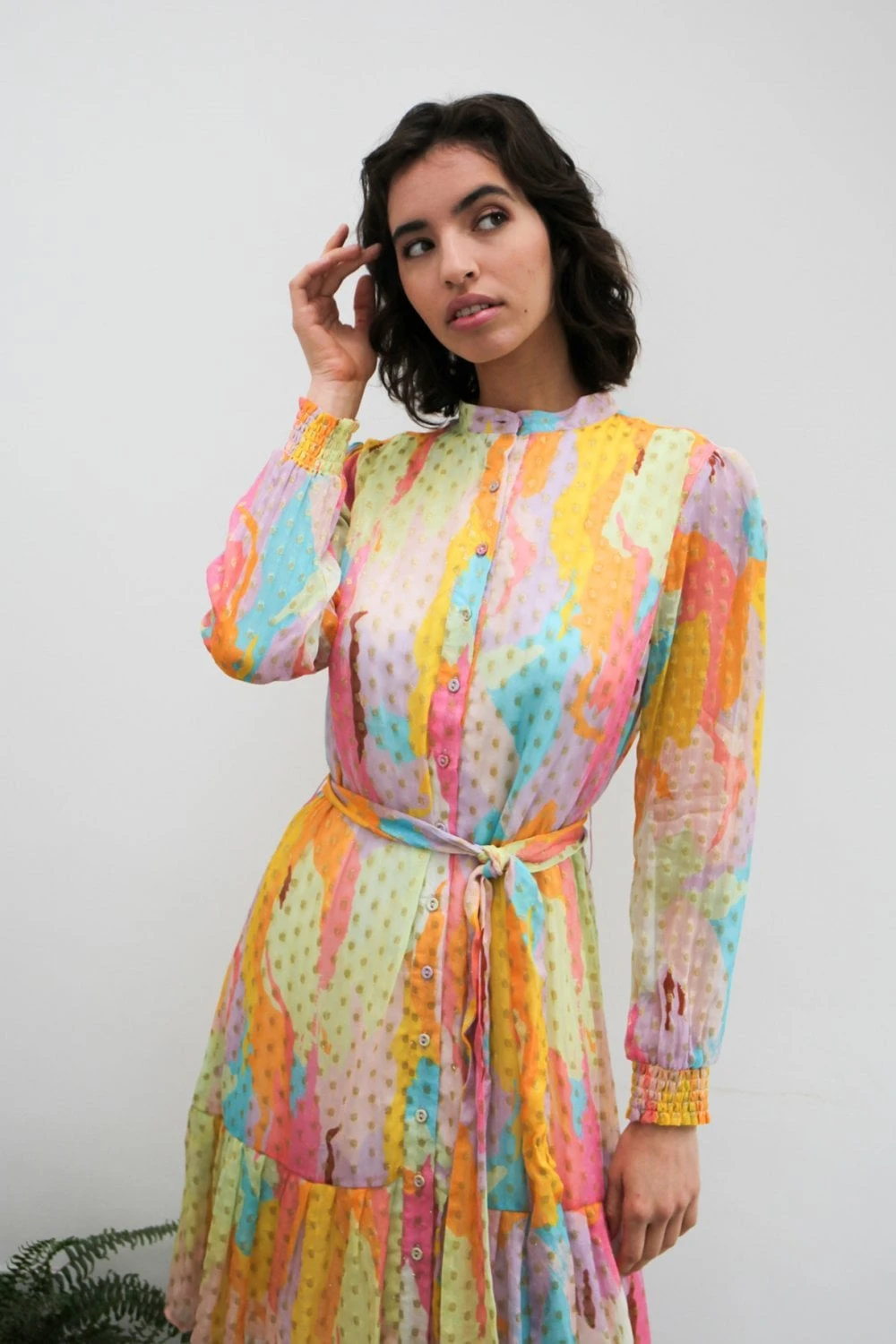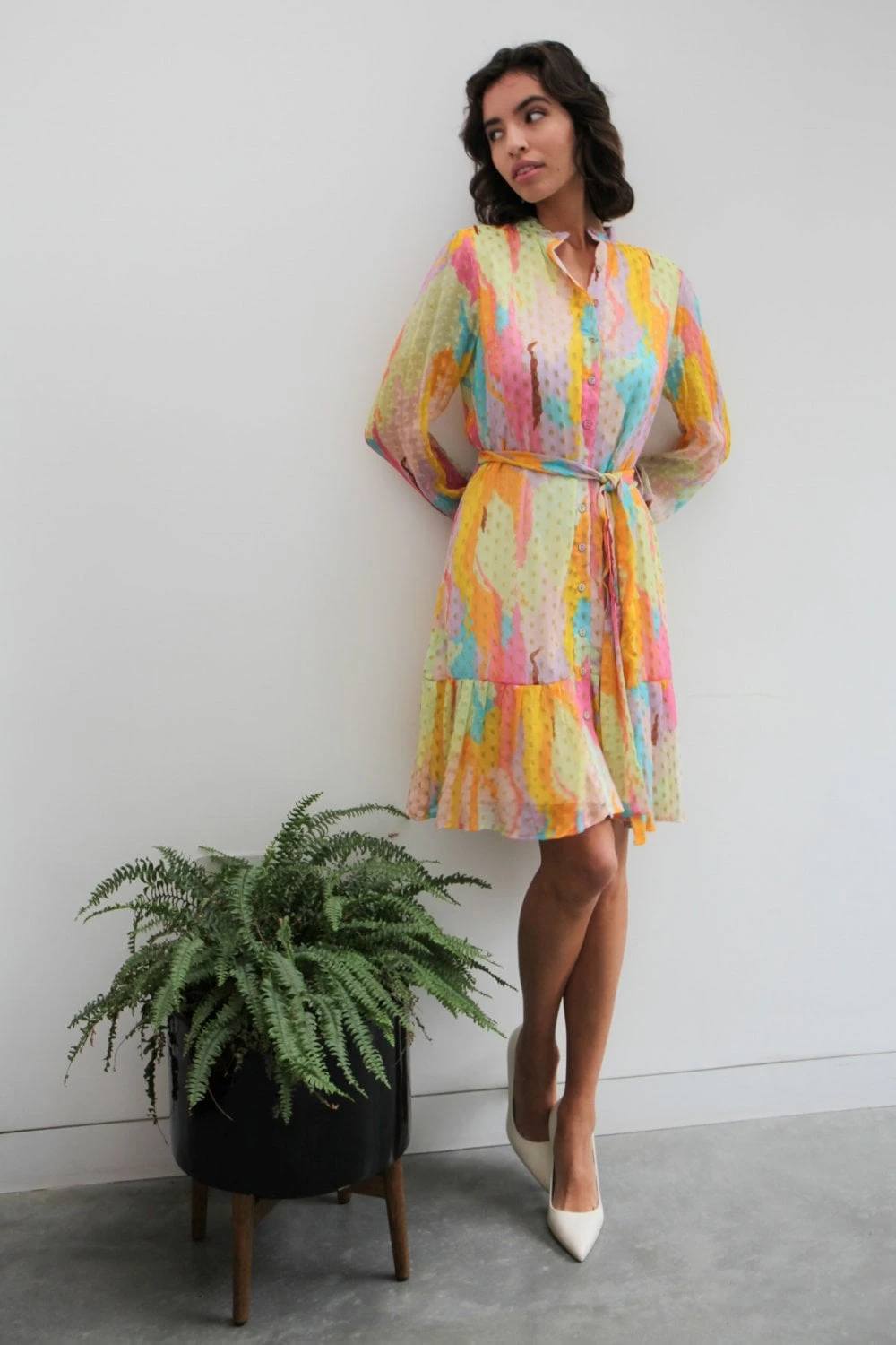 Our elegant short dress with a mandarin collar.Made from Viscose gorgette with gold detailing in pastel colours,this dress is both lightweight and comfortable,making it ideal for warm days.Its versatile length and elegant collar make it perfect for a variety of occasions,from casual to formal events.