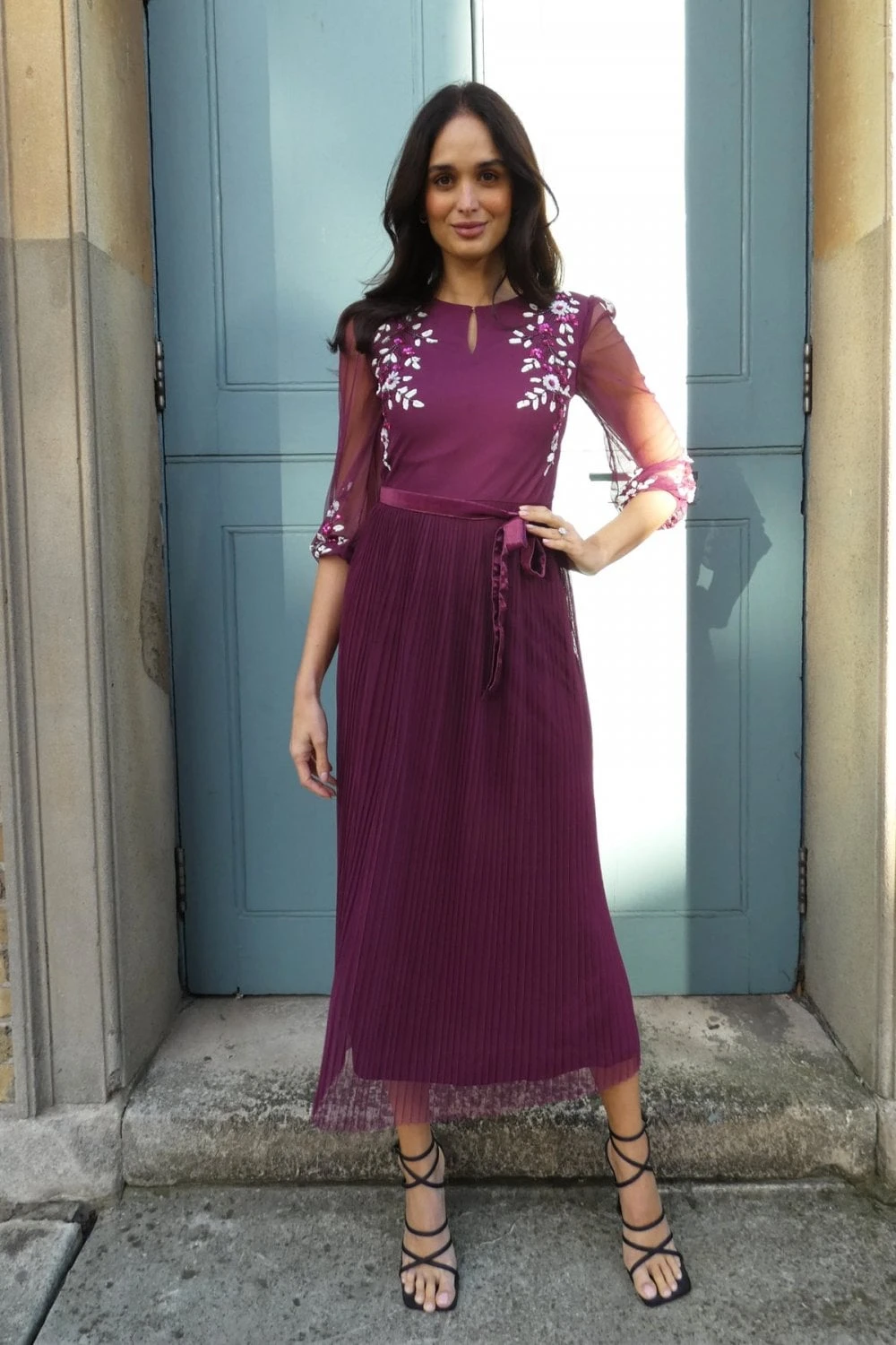 Stand out from the crowd in this stunning embellished midi dress. Features embellishment details on the bodice section and pleated skirt from waist seam great for your formal occasions this season.