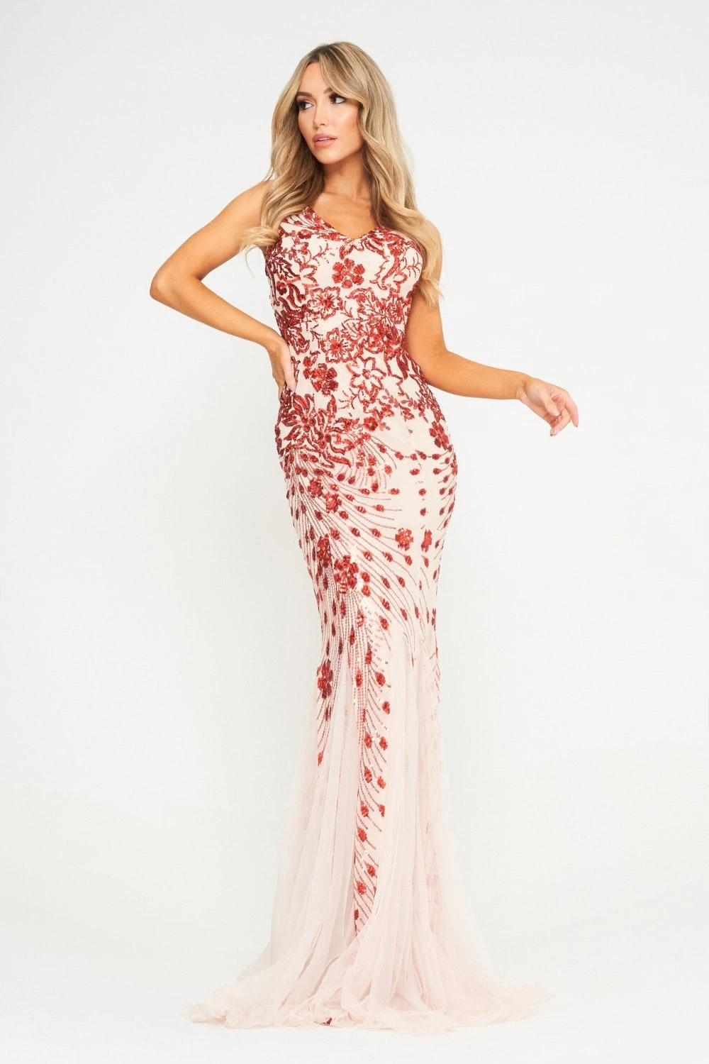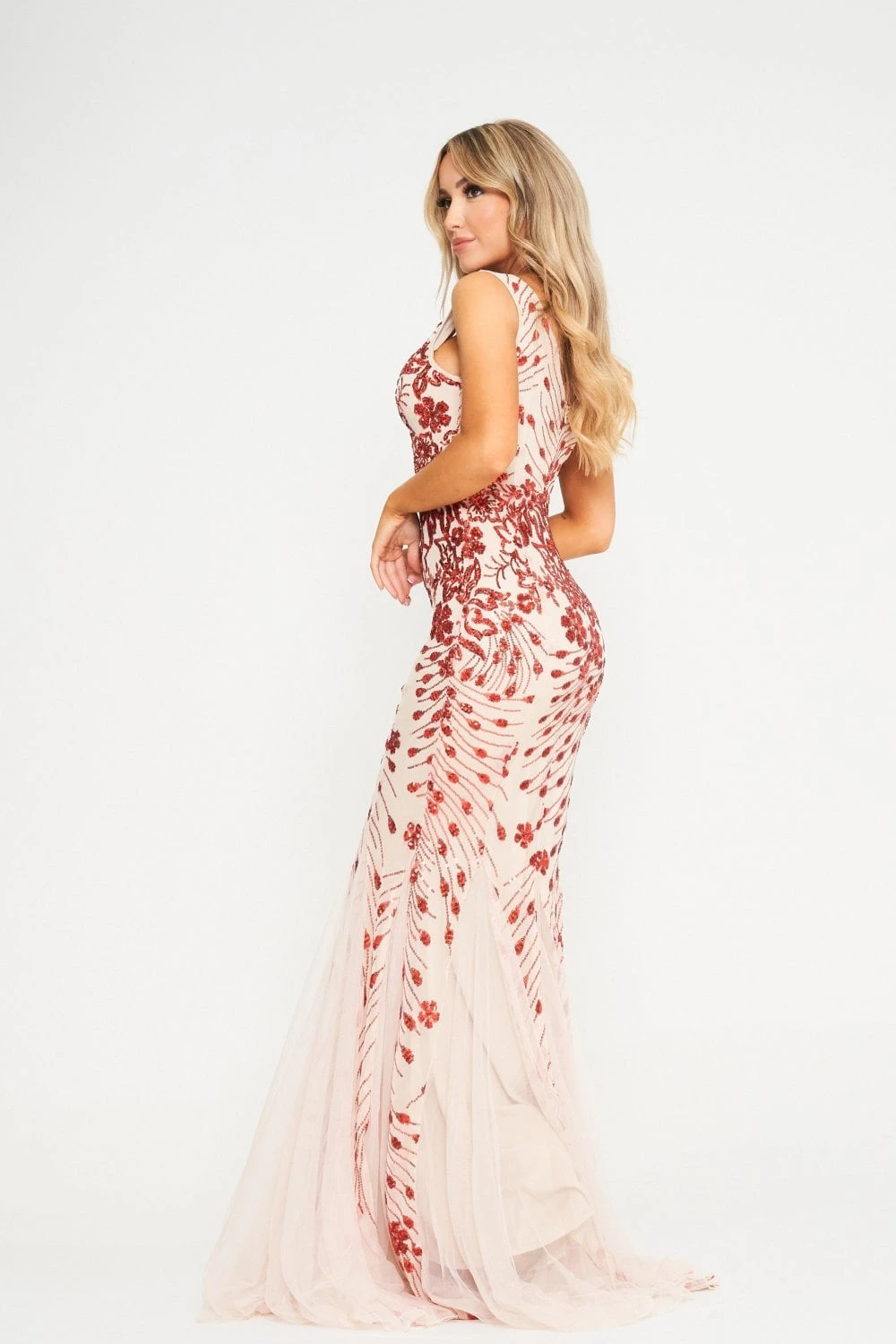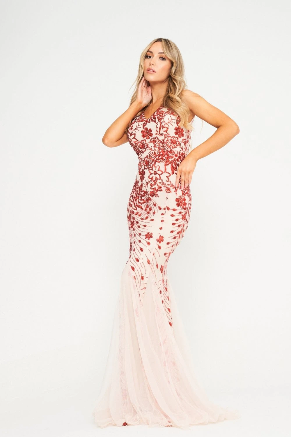 Be the best version of yourself with our striking new maxi dress. The sparkling sequins are beautifully arranged in an intricate floral pattern – it’s a fascinating combination of pale spring elements, fiery, radiant sequins and the dominating maxi length. The subtle mesh inserts create a whole new world of shape and structure, adding to the understated dynamics of the white-red colour scheme.